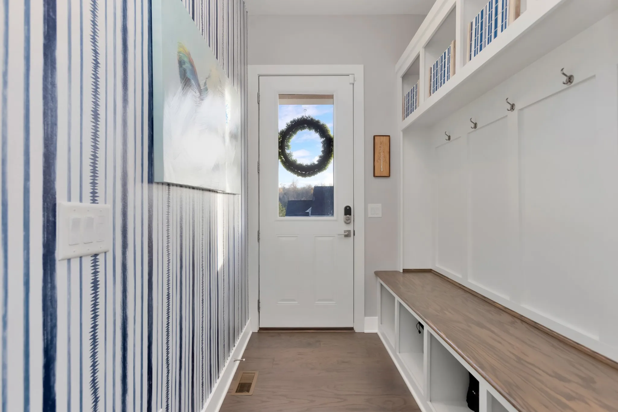 "ShortDescription" => "Who says a drop zone can’t be both functional and beautiful! As you enter the home from the friends entry everyone has a spot to hang their coat or put away their shoes. Staying organized is no issue here."