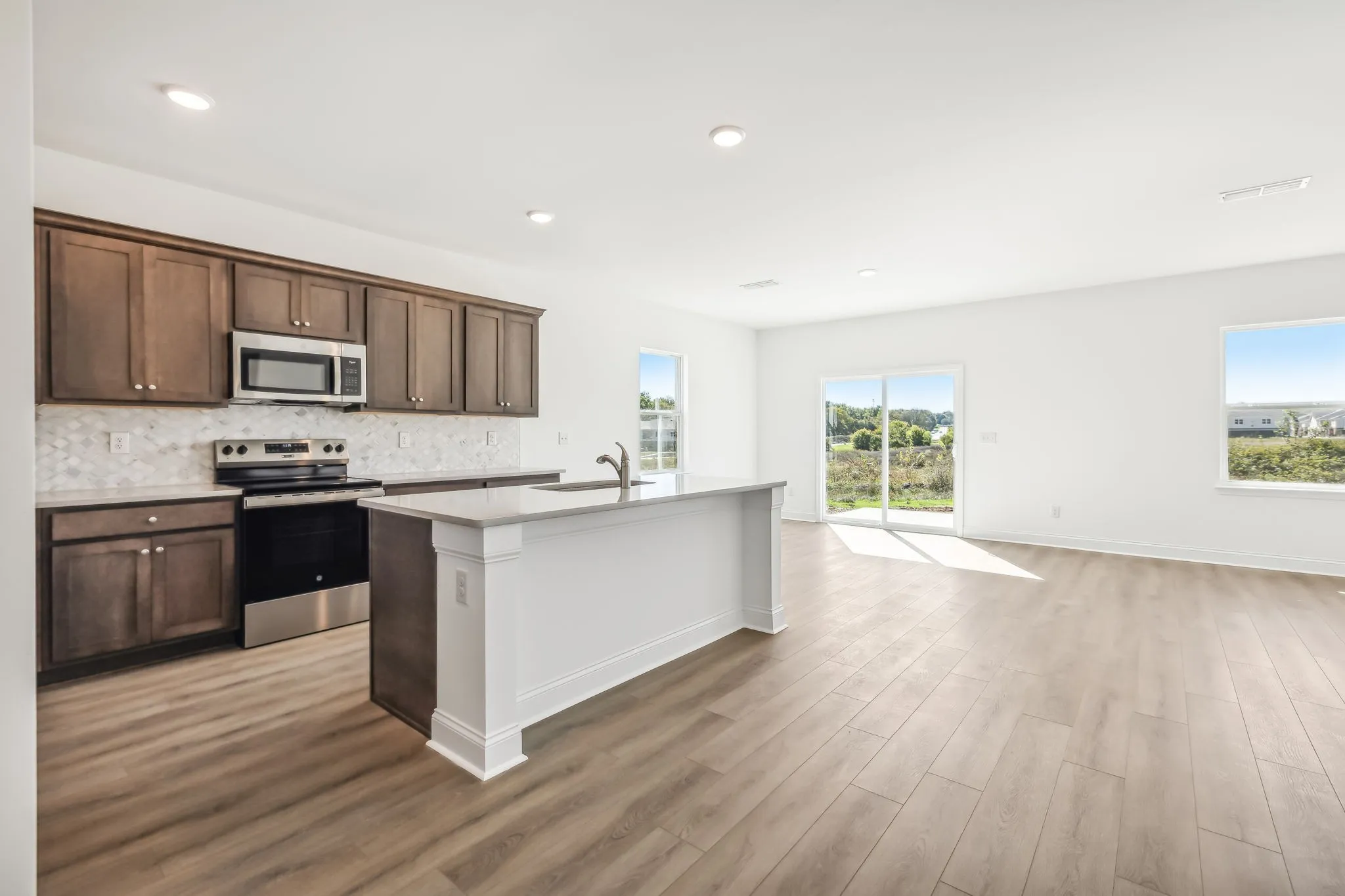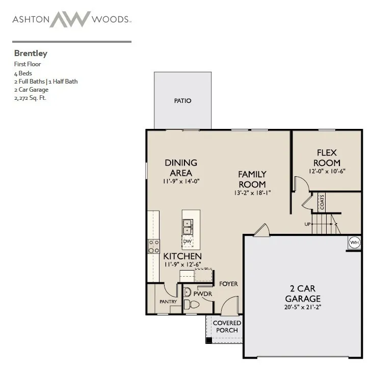 The two-story, four-bedroom Brentley plan blends style and functionality. In this open-concept layout, the living room flows seamlessly into the breakfast area, which is conveniently located off the kitchen. The designer-curated kitchen features a large quartz-topped island, ample stained brown cabinetry, stainless appliances, and a spacious walk-in pantry. The main floor also features a flex room suitable for a home office or guest retreat. Upstairs, you’ll find a large loft space ideal for a media room, home gym or play room. The laundry room and all four bedrooms are located on the second floor. In the primary suite, you’ll enjoy a tray ceiling, walk-in tiled shower, dual vanity, and a generous walk-in closet. This home is complete with a front covered porch, rear patio off the breakfast area, luxury vinyl plank flooring throughout the main living areas, and a two-car attached garage.
