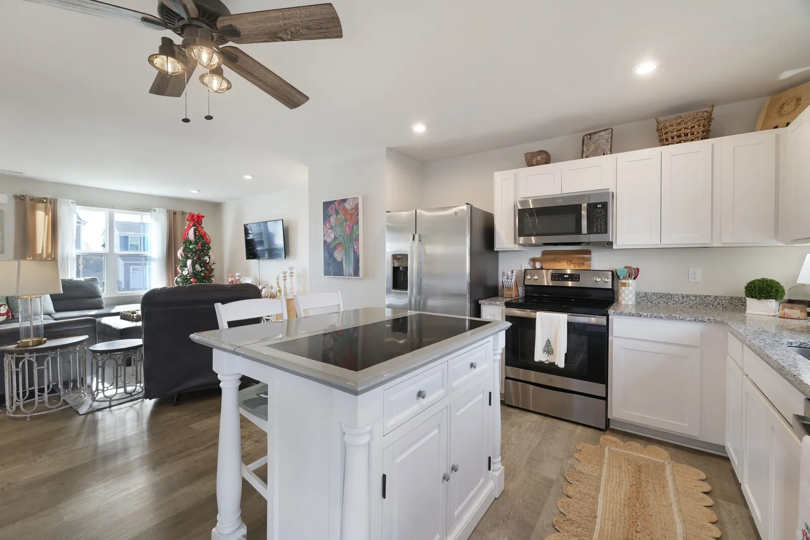 Beautiful Like-New Home with Modern Upgrades This stunning home offers an open-concept layout and thoughtful upgrades throughout. Freshly painted primary bedroom and bath, living room, and upstairs hallway create a bright, refreshed feel. The kitchen features a custom island, perfect for gathering, while the garage boasts custom cabinets for ample storage. All spacious bedrooms, including the luxurious primary suite, are located upstairs for added privacy. Downstairs includes a convenient half bath. The private backyard with a patio is perfect for outdoor entertaining or quiet relaxation. Additional features include appliances: refrigerator, stove, dishwasher, and microwave. This move-in-ready home has everything you need! -P