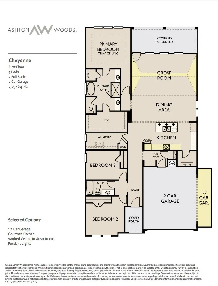 Discover the perfect blend of elegance and comfort in the Cheyenne floorplan by Ashton Woods Homes. This beautiful home features 3 bedrooms and 2 bathrooms within 2,097 sq ft of thoughtfully designed open living space. The spacious primary bedroom boasts a tray ceiling and a large walk-in closet off the luxurious en-suite bathroom. Two additional well-sized bedrooms provide ample space for family or guests. The gourmet kitchen is open to a grand great room with a vaulted ceiling, creating an inviting and airy atmosphere. Situated on a generous CORNER homesite, this home offers both privacy and style in a prime location. The exterior renderings shown are conceptional and may not be included in this listing. The estimated completion for this home is Jan/Feb 2025. Please note this timeframe can change, please check with sales associate for details and updates!