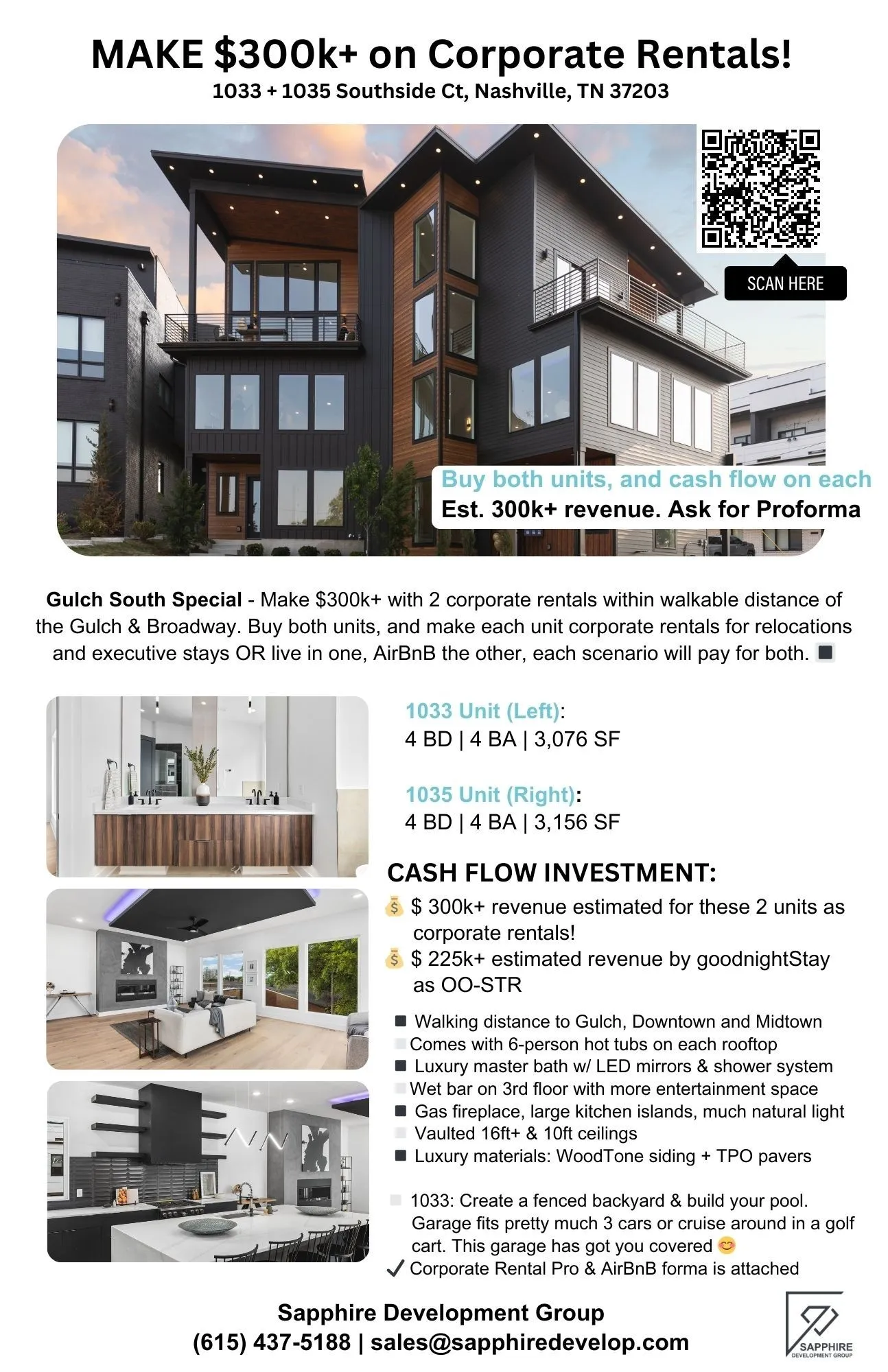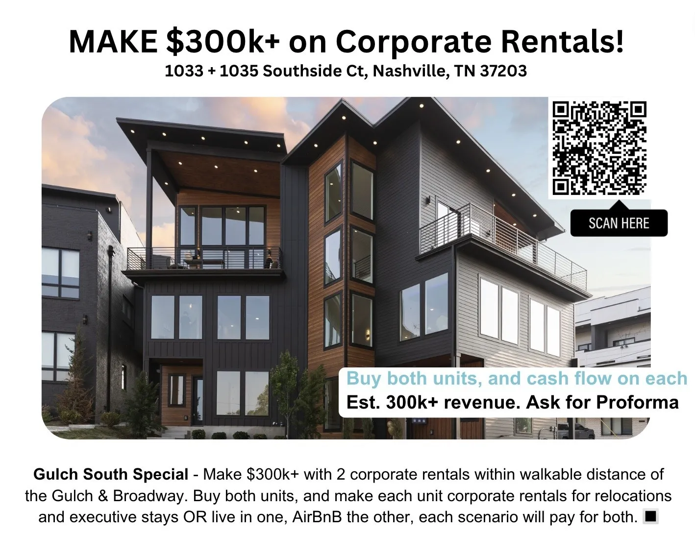Cash flow with this gem! Make $300k+ with 2 corporate rentals within walkable distance of the Gulch & Broadway. Buy both units and make each unit corporate rentals for relocations and executive stays OR live in one, AirBnB the other; each scenario will pay for both. Offering 2x rooftop hot tubs. One of One-of-a-kind ultra-modern design, LEDs, designer finishes, and open concept layout with soaring 18ft vaulted ceilings + backyard! Put in a pool to increase revenue. A harmonious blend of form and function across 3 stories, 4 beds & 4 baths, each with stunning wellness areas. Enjoy a gas fireplace and a long waterfall kitchen island. Luxuriate in the rooftop hot tubs. Unwind at the built-in entertainment beverage bar. Live near Rose Park and enjoy 5-min walks to the Gulch, Downtown + Midtown. Experience spacious living in Nash’s hottest neighborhood + backyard! Offering 1pt buy-down with developer-preferred lender. See proforma below. Appraised @3.04