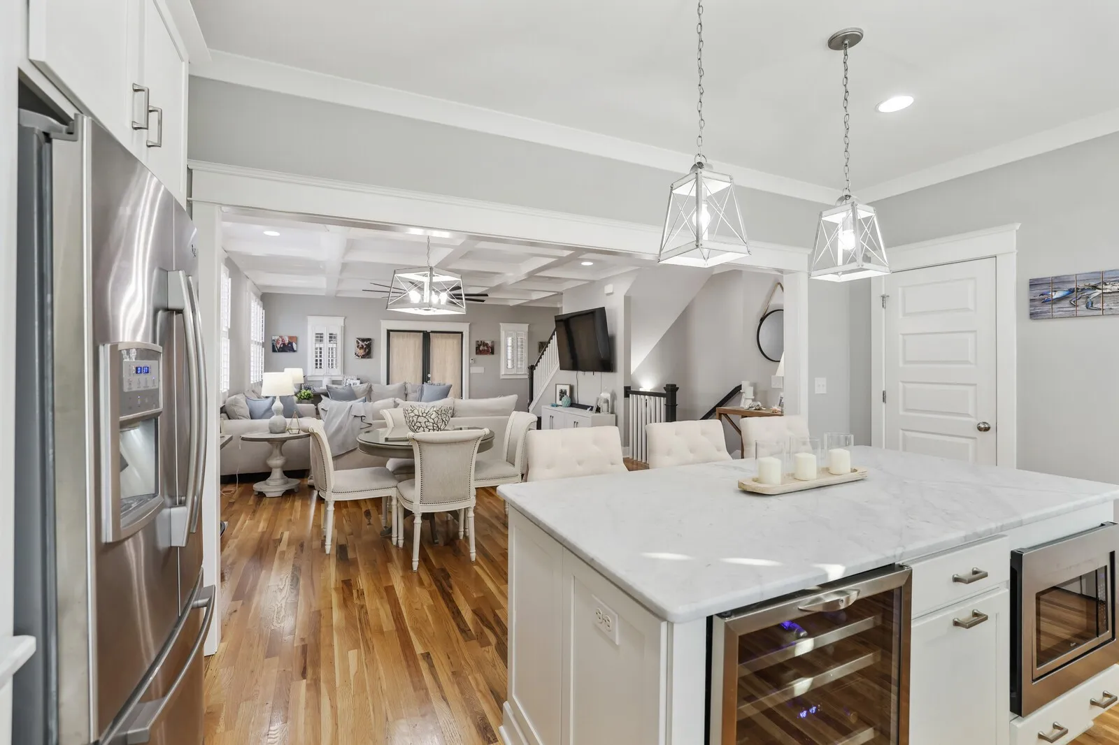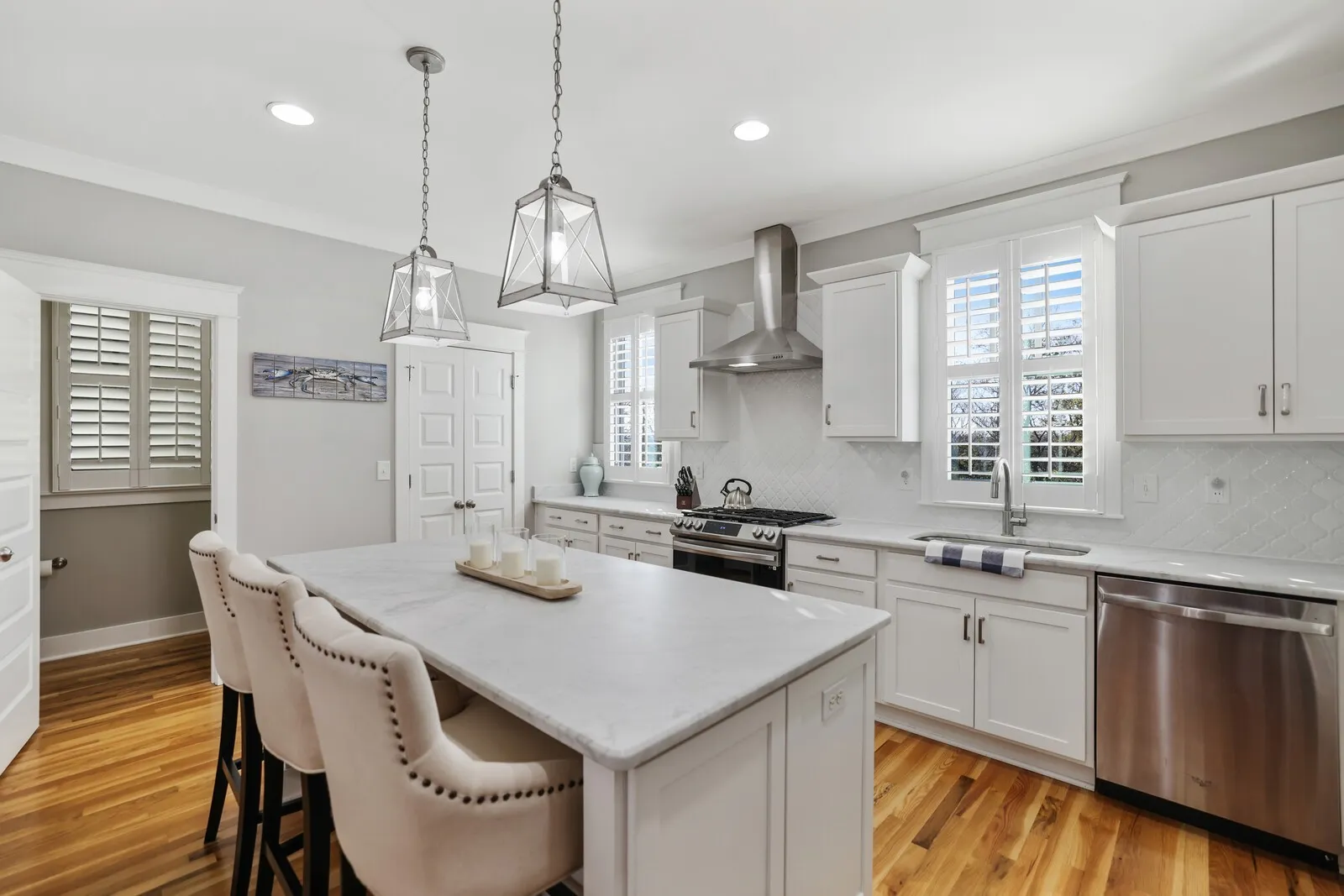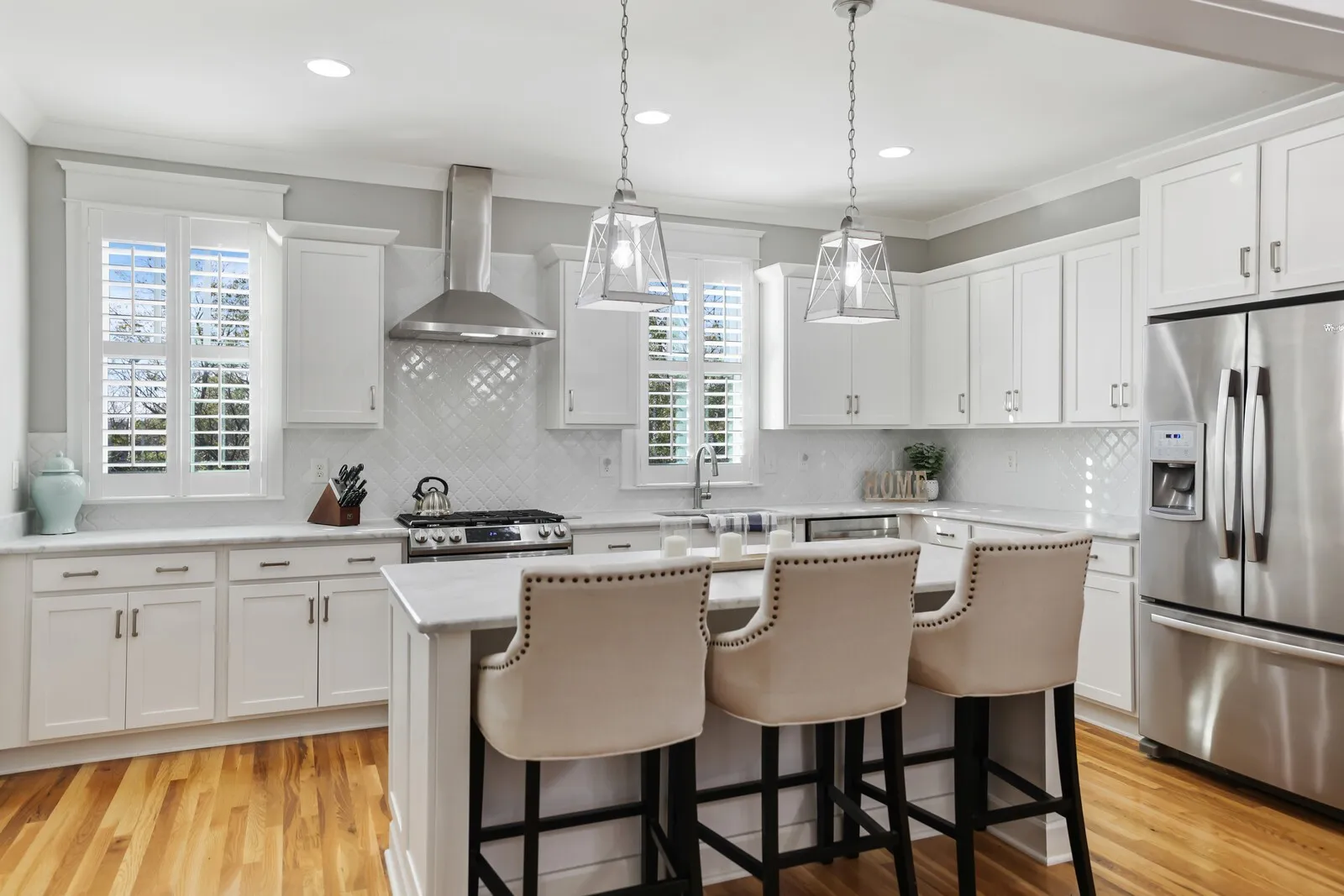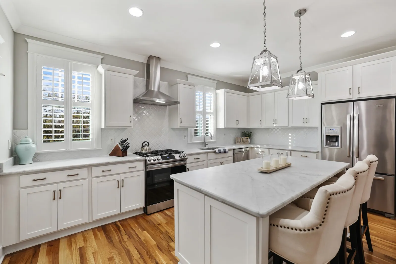 Welcome to this beautifully renovated four-bedroom, three-and-a-half-bath home located in the heart of Nashville! Combining timeless charm with modern upgrades, this property offers an exceptional living experience. Step inside to discover an open floor plan filled with natural light, gleaming hardwood floors, and sophisticated finishes throughout. The spacious living room features coffered ceilings and ample seating space, making it perfect for entertaining or relaxing with family. The gourmet kitchen is a chef’s dream, boasting pristine white cabinetry, stainless steel appliances, tile backsplash, and a large center island with seating. Pendant lighting and ample counter space complete this elegant and functional design. The primary suite is a serene retreat, offering a spacious layout, a walk-in closet, and an en-suite bathroom with a double vanity, and tiled shower. Additional bedrooms are generously sized, providing plenty of space for family or guests. Outside, enjoy the charm of a white picket fence and a covered porch perfect for rocking chairs and creating a peaceful space for quiet evenings. Located just minutes from Nashville’s vibrant downtown, this home offers proximity to restaurants, shops, and entertainment while maintaining a cozy neighborhood feel. Don’t miss the chance to make this stunning home your own!
