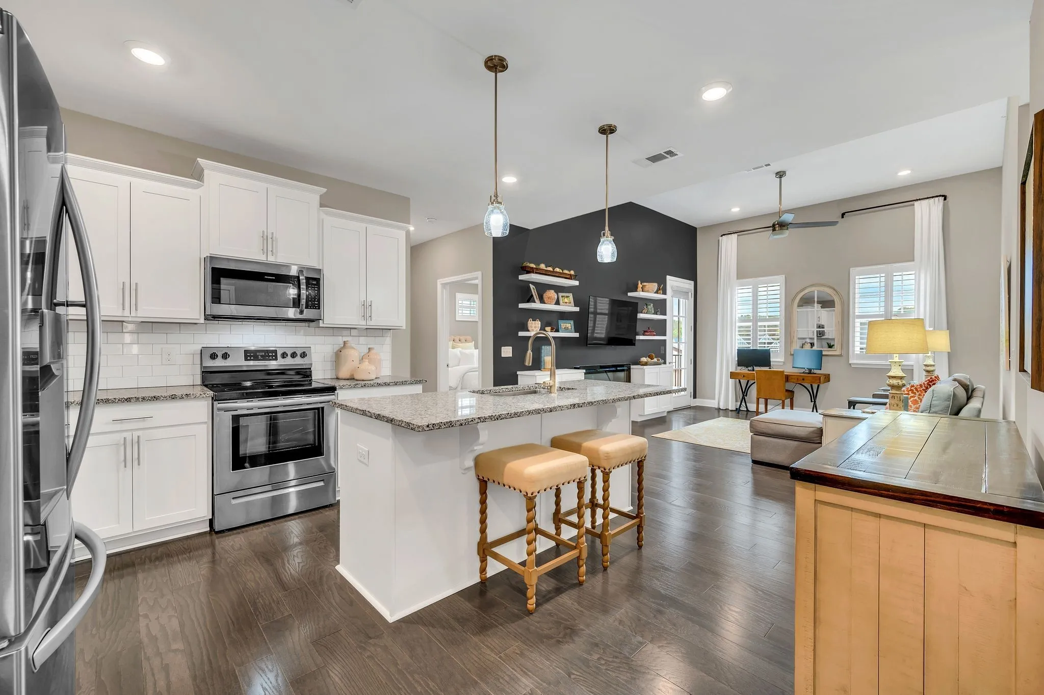 +"PublicRemarks": "Turn Key all one level LUXURY condo w/ WALKABILITY to SHOPS & Restaurants and rental income potential. Peacefully situated on the top floor it boasts VAULTED Ceilings, Rare oversized GARAGE and an additional private full driveway covered parking spot! This home includes beautiful wide plank engineered HARDWOOD floors in main living areas, custom living room cabinets w/ floating shelves and a cozy electric FIREPLACE with a Mounted Smart TV (remains). One of few units with VAULTED ceilings in the living room and tall windows that allow tons of EXTRA LIGHT. Entertain guests in the open kitchen w/ extended height white craftsman cabinets, Granite countertops, and S.S. Appliances including a LG InstaView Refrigerator (2021). BETTER THAN NEW CONSTRUCTION w/ Roman Blackout Shades, PLANTATION SHUTTERS, Tinted Windows, New Sliding Glass Shower Doors, and Upgraded Tile Shower/Soaking Tub surround in 2nd bathroom, New comfort height toilets (2024), New Extra Plush Carpet and More! Relax on your covered back deck overlooking the Pool and Serene Cow Pasture. Enjoy RESORT LIKE AMENITIES just steps from your door including a beach-entry pool, clubhouse, gas grills, putting green, walking trails & dog park. WALK to Target, Grocery store, and Restaurants using the paved walking path! Furniture negotiable as well. Unit CAN BE RENTED w/ HOA approval."