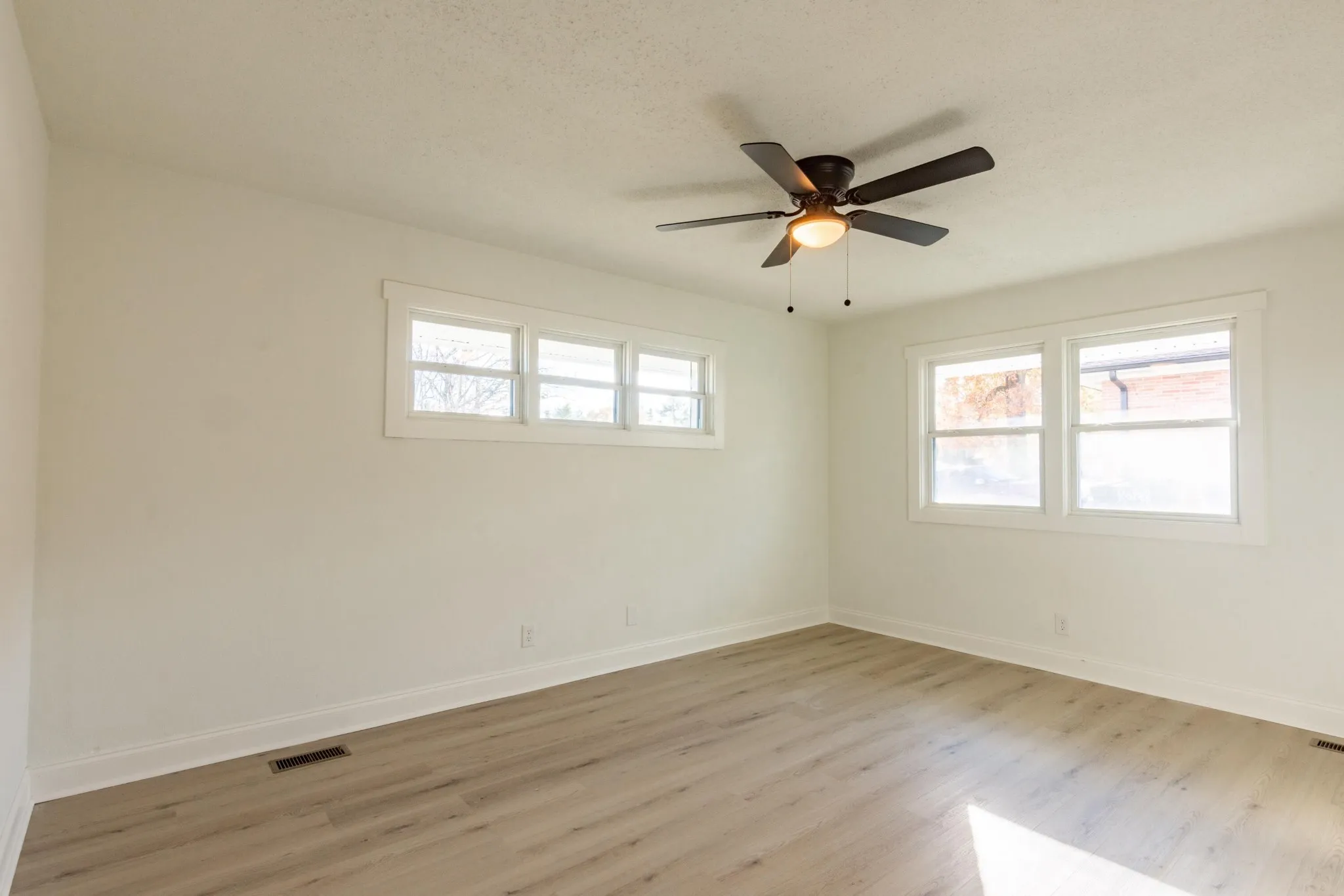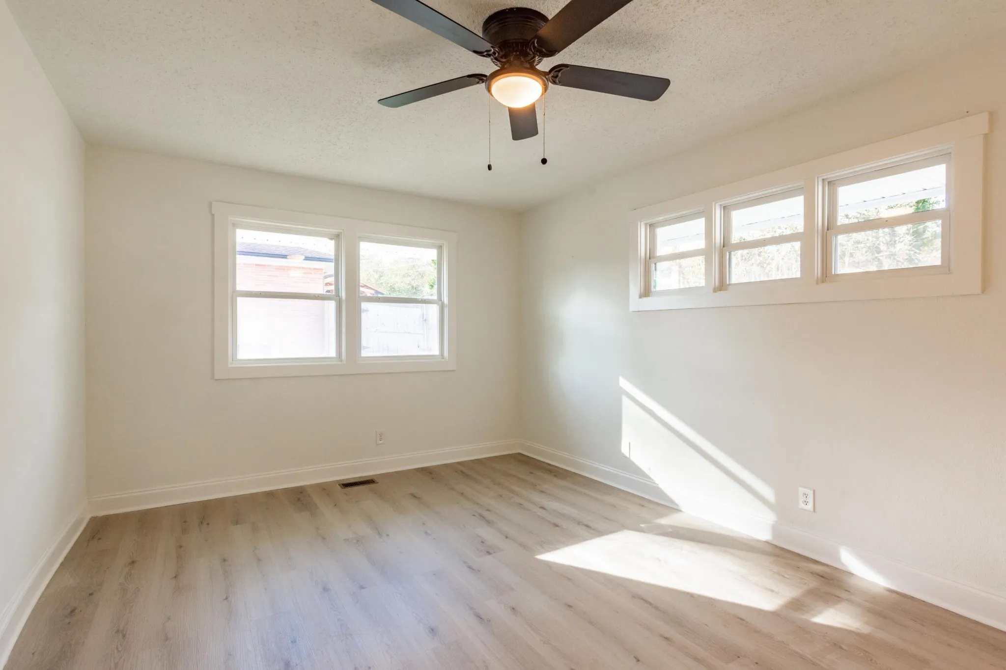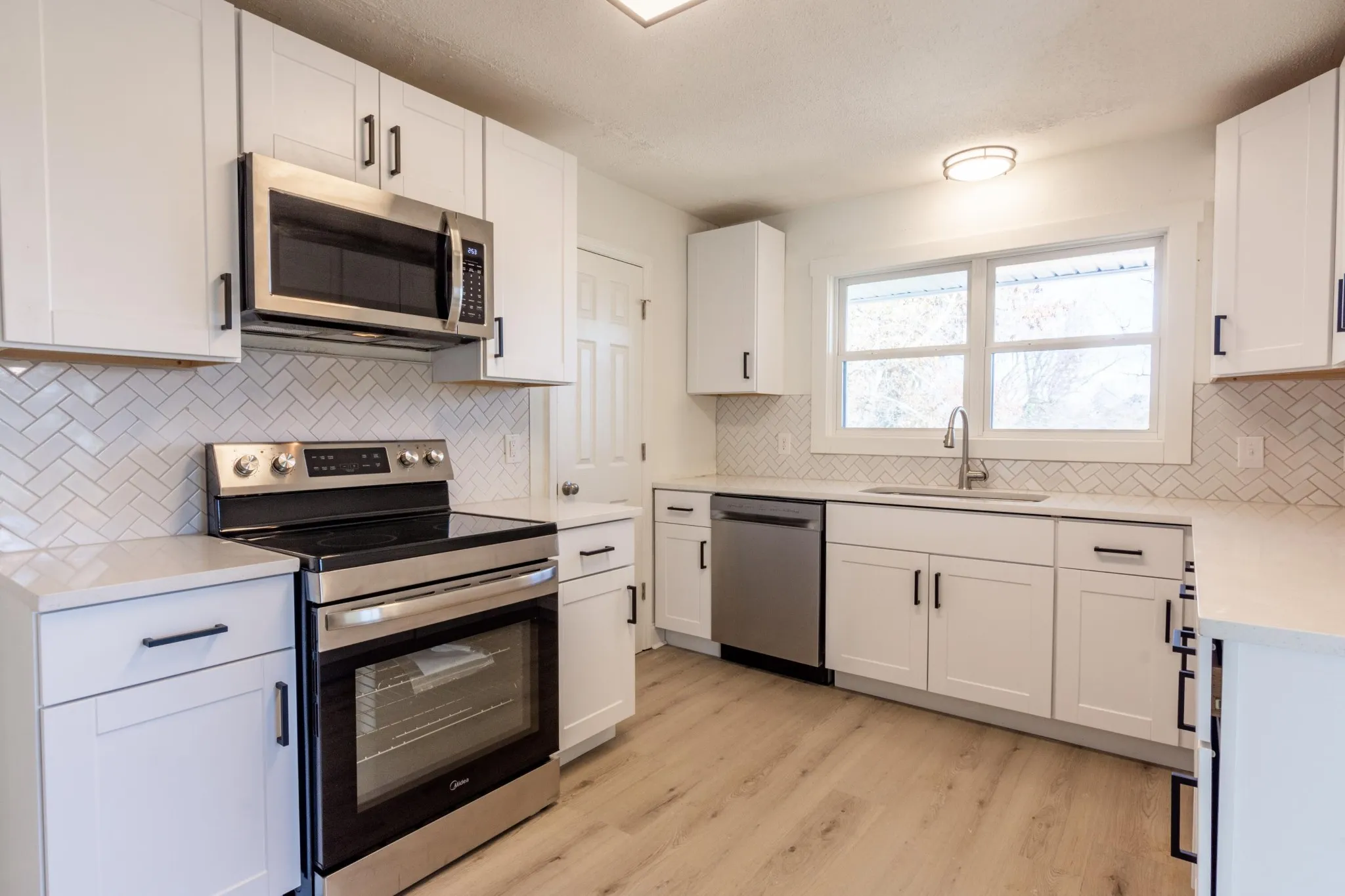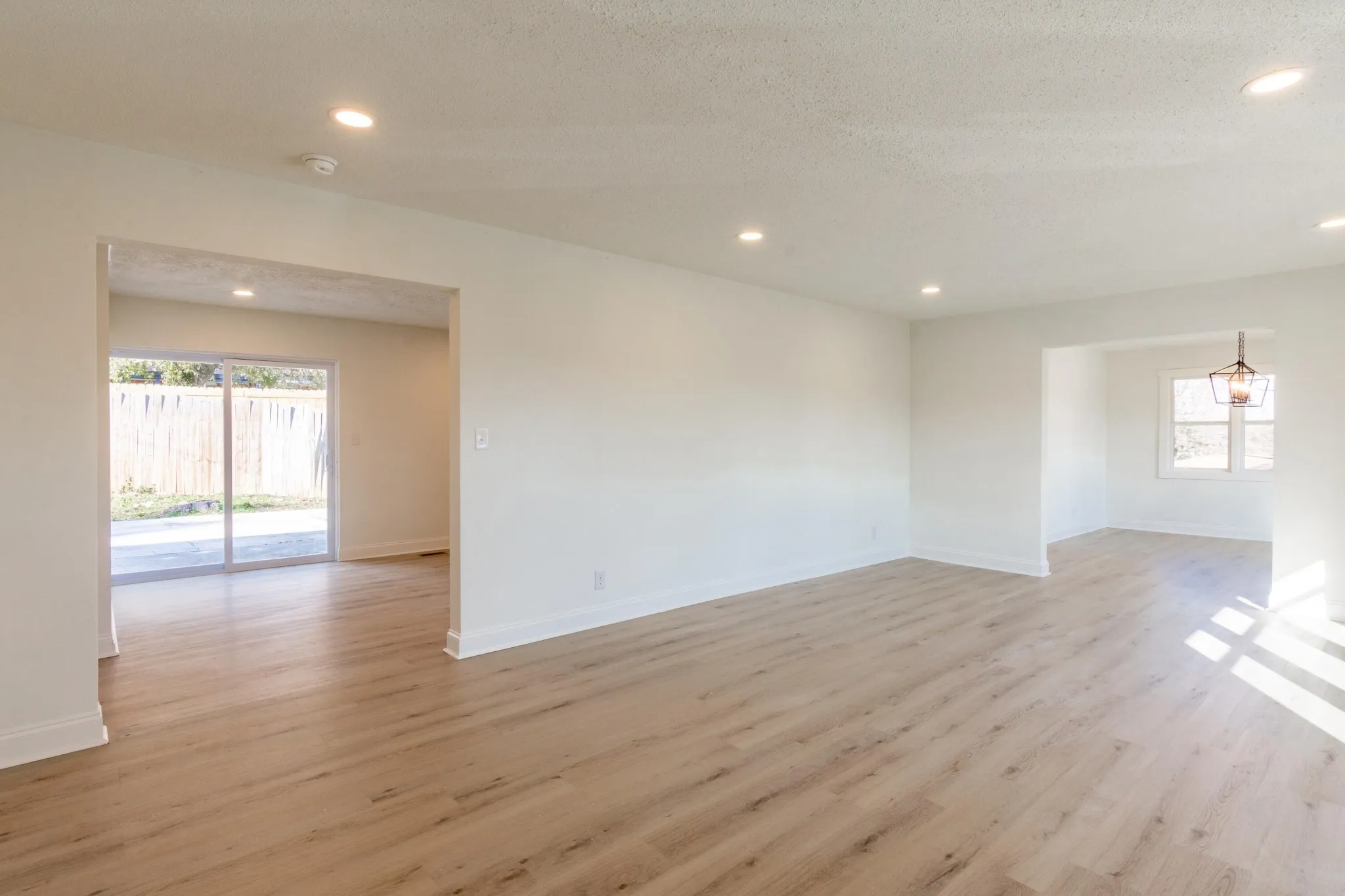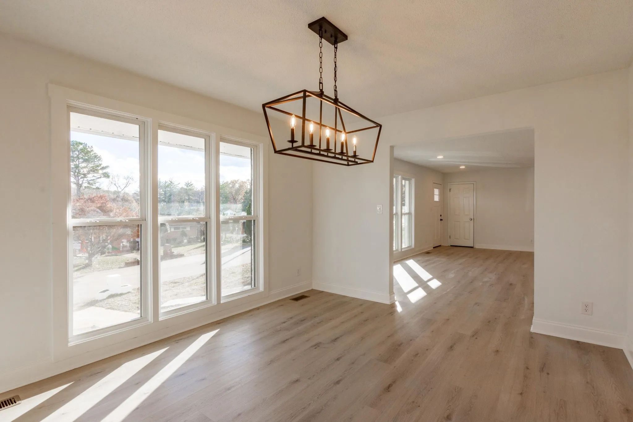 Fully renovated 3 bedroom, 2 bathroom home, boasting 2,214 square feet of modern living space. The inviting painted brick exterior sets the tone for the updates inside, including brand-new LVP flooring, fresh paint, stylish fixtures, and a light, neutral color palette throughout. The open floor plan flows seamlessly from the spacious front living room, featuring triple windows for abundant natural light, to the adjoining formal dining room with a chic chandelier and triple windows on two walls. The kitchen showcases bright white cabinets, quartz countertops, stainless steel appliances, and a herringbone subway tile backsplash. Its long layout offers space for an eat-in table or a cozy den with built-in bookshelves and sliding doors to the back patio. Relax and entertain in the two living rooms or the expansive den, offering flexible spaces for family and friends. The well-sized bedrooms are filled with natural light, while the updated bathrooms are crisp and clean with sleek white finishes and subway tile details.