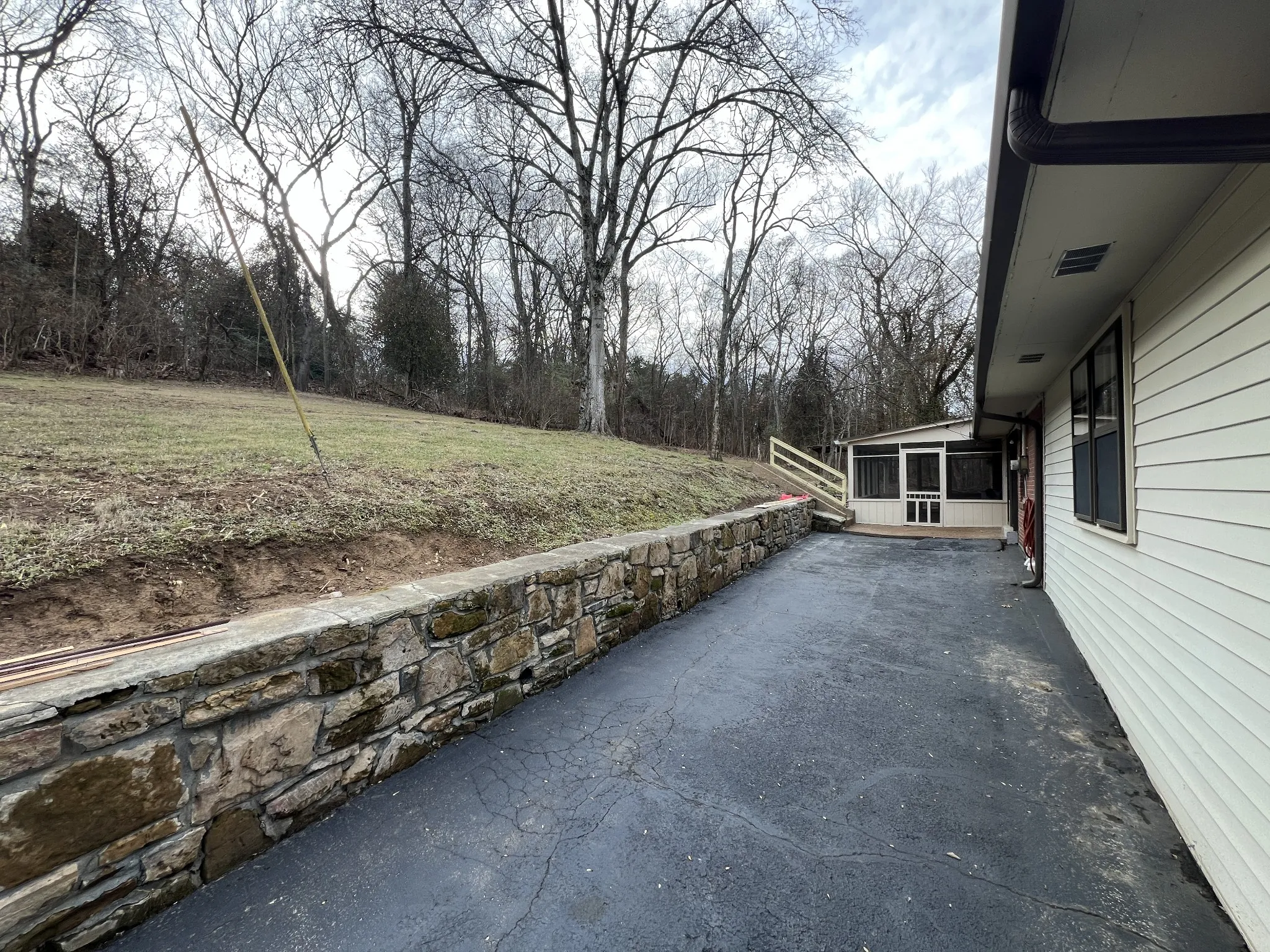 One level 3 bed, 2 bath home on forested 3 acres w/ privacy and close to airport and interstate. Home features plenty of parking, workshop shed, screened porch, new carpet and refrigerator. Washer and dryer hookup in the 2nd bathroom. Living room has built in book shelves and a fireplace. Bonus room great for media or game room. Cinder block building at the bottom of hill not included as part of rental.