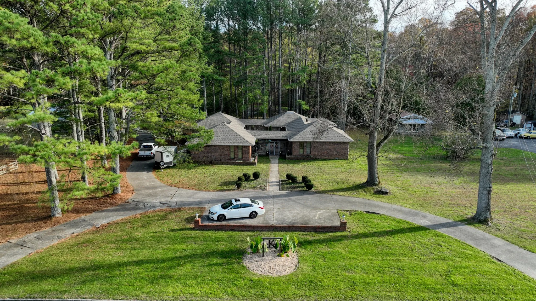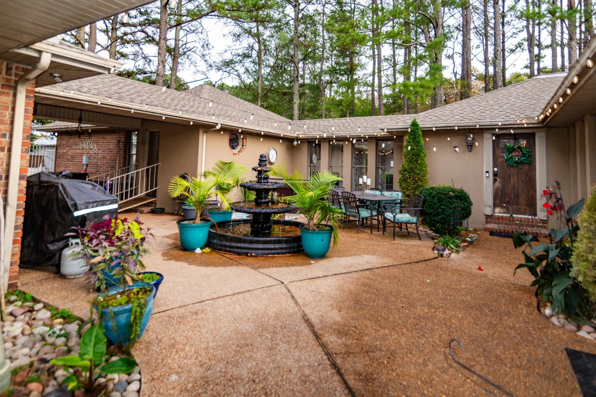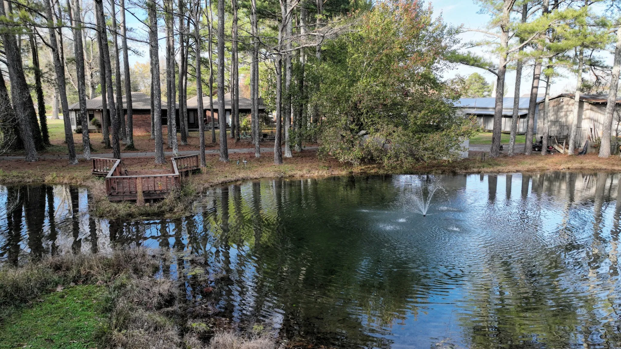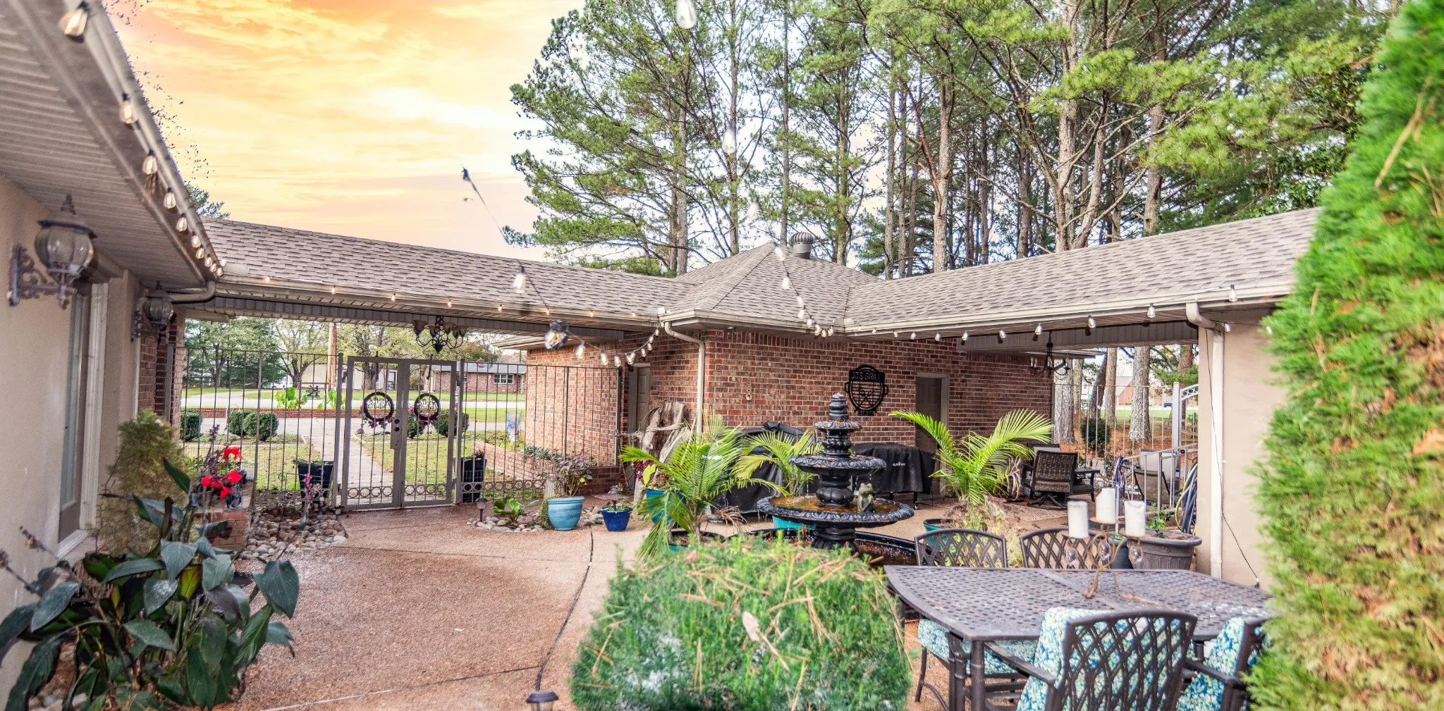 Indulge in this exquisite 3.49-acre estate, showcasing a bespoke brick home surrounded by a gated courtyard, tiered fountain, hot tub (purchased new in 2023) and beautiful landscaping. The residence features an abundance of natural light, enhanced by skylights and floor to ceiling windows throughout. Fireplaces in both the living room and primary bedroom, custom cabinetry, crown molding, and tile/wood/marble flooring in select rooms further enhance the elegance of the home. The property also features mature landscaping, stocked ponds, two outbuildings, barn and a two-car garage. Recent updates include a new roof (2022), primary bathroom remodel, (2024) and updated lighting fixtures, etc., ensuring a flawless living experience. There is a second septic tank (records attached) that was installed for the gray outbuilding, and it also has a separate water and electric meter with a 200 Amp service. City water. There is a well on this property, however it needs repair. Gas range and cook top. Yearly termite inspection and routine pest control have been maintained. Tankless hot water heater in primary bath.