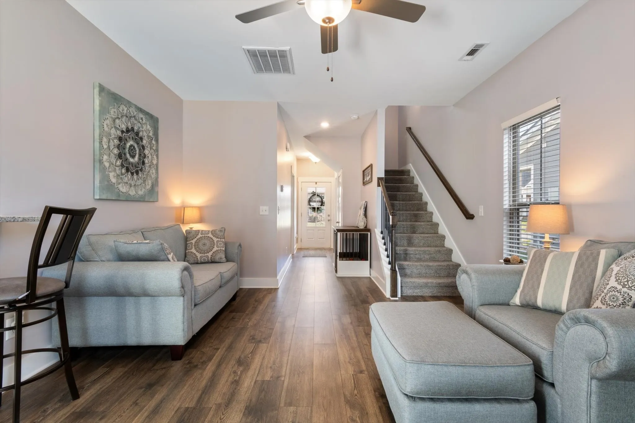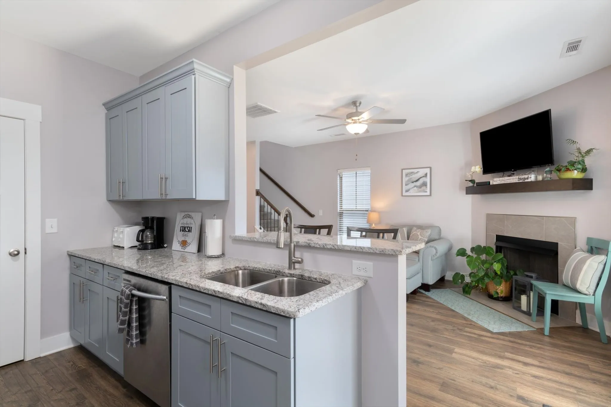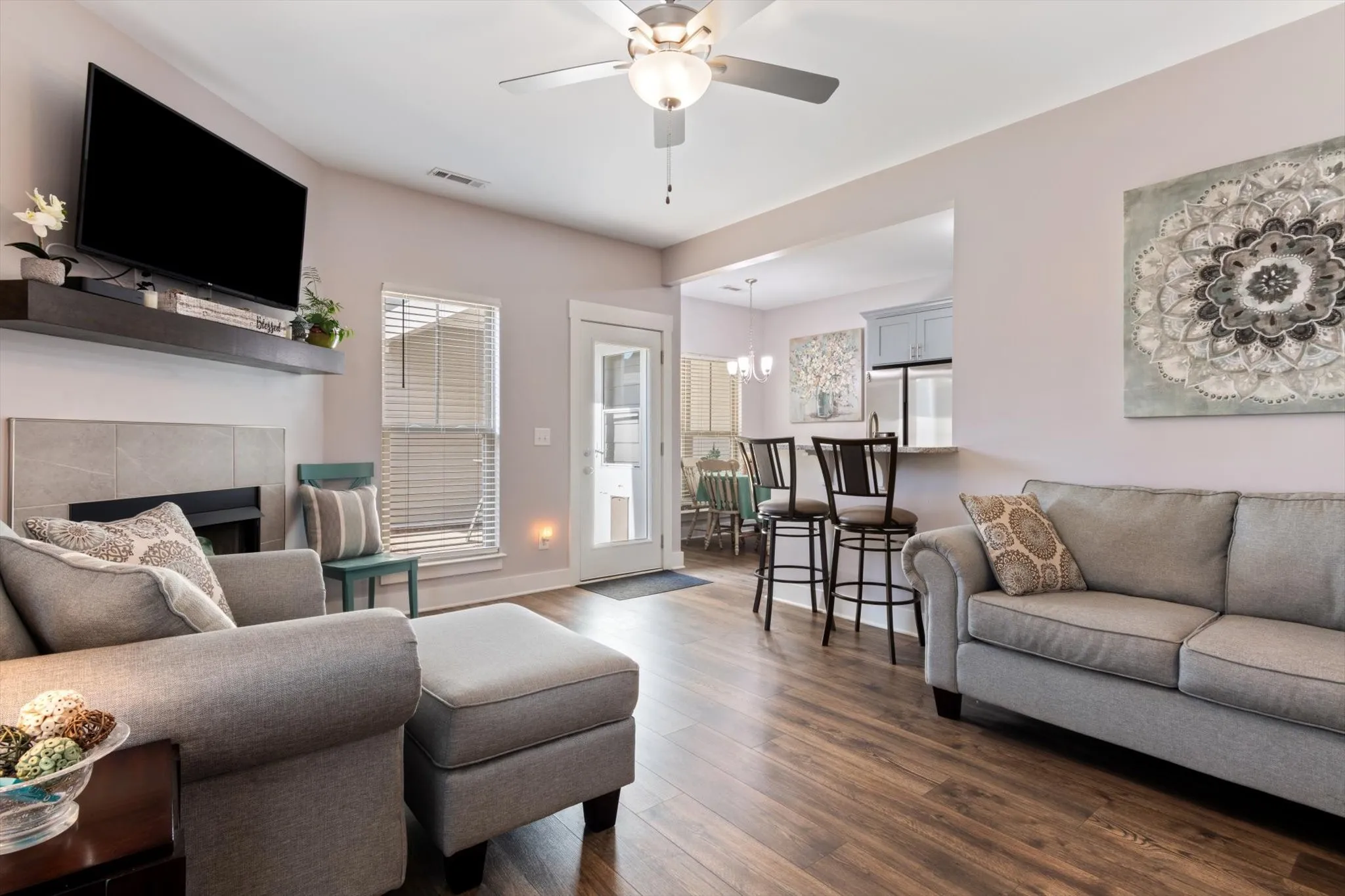 Welcome home to your lovely brick/hardie board townhome in highly desirable Three Rivers with community pool and yard maintenance included! This townhome was designed for entertaining! The main level boasts high ceilings and open concept living, dining and kitchen areas. The living room features a modern gas fireplace and wood flooring that continues throughout the first floor. Primary suite has an upgraded tile shower with bench and granite counters along with a large walk in closet. Upstairs you will find two additional bedrooms with a shared bathroom as well as walk in attic storage. The breezeway to your 2 car attached garage serves as a great covered patio within your private fenced yard. The location is the icing on the cake – close to I24, Veterans Parkway, and Highway 99. Walmart, Publix, and Kroger are all just a short trip away as well as shopping and entertainment!