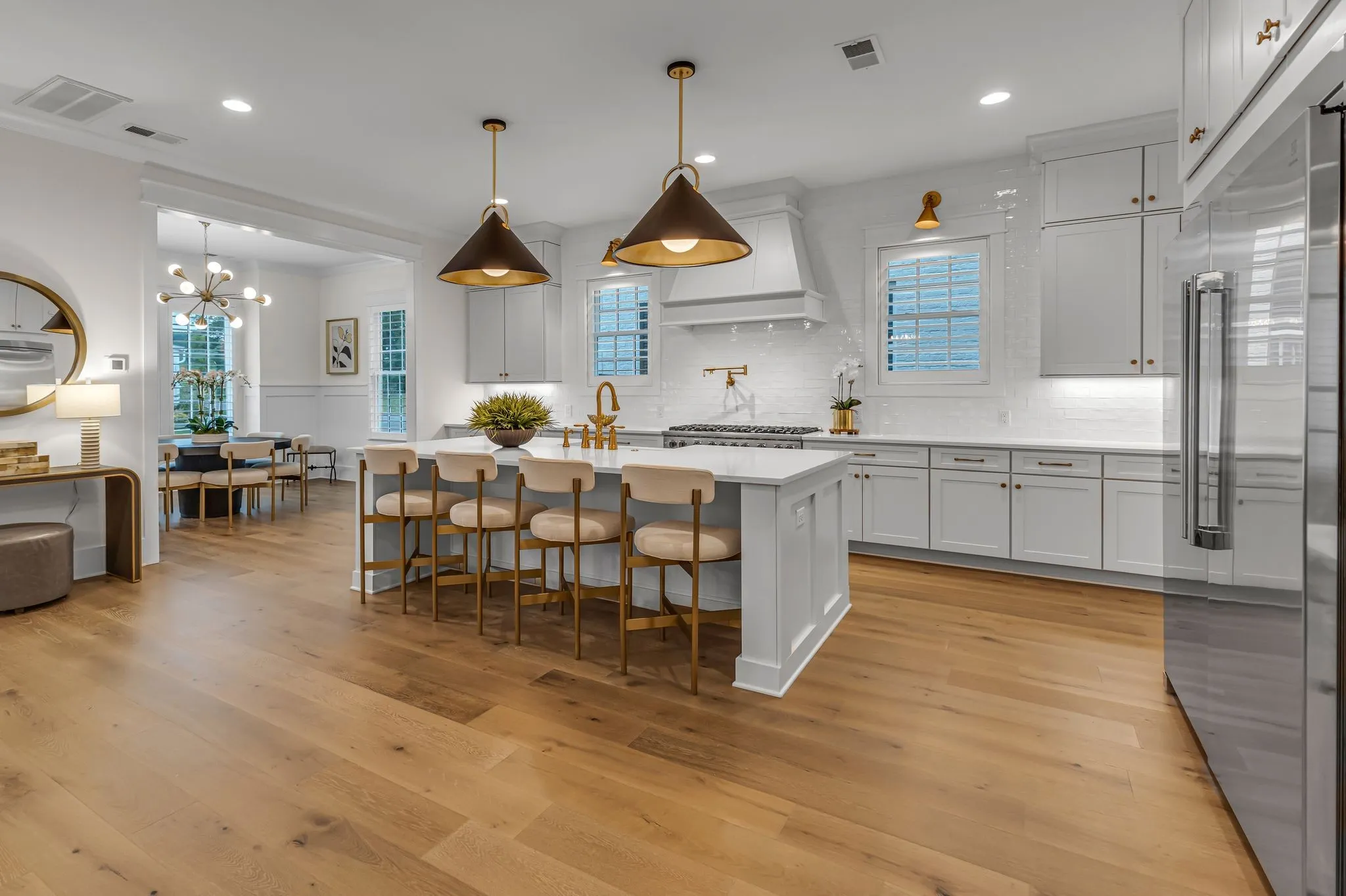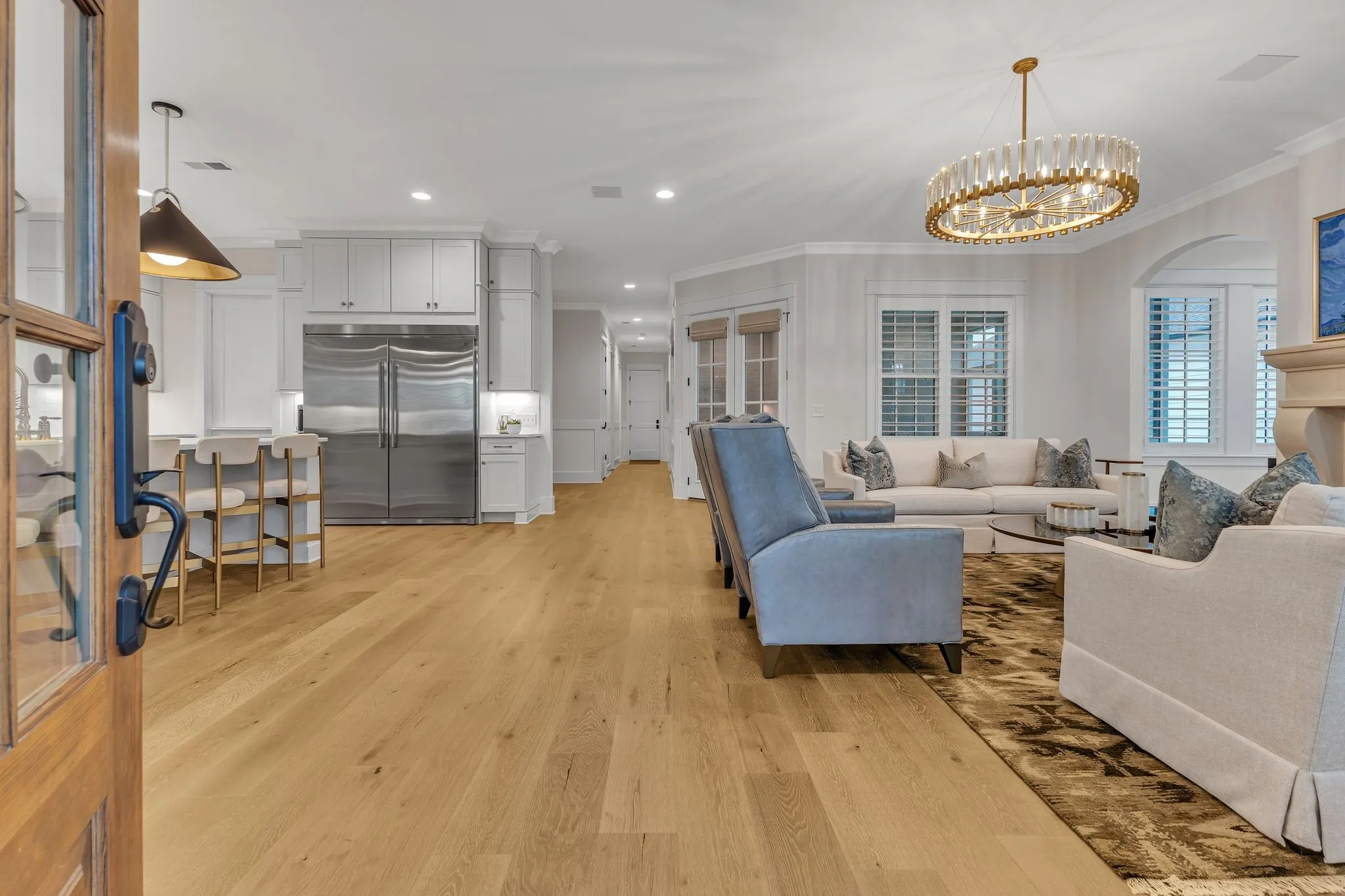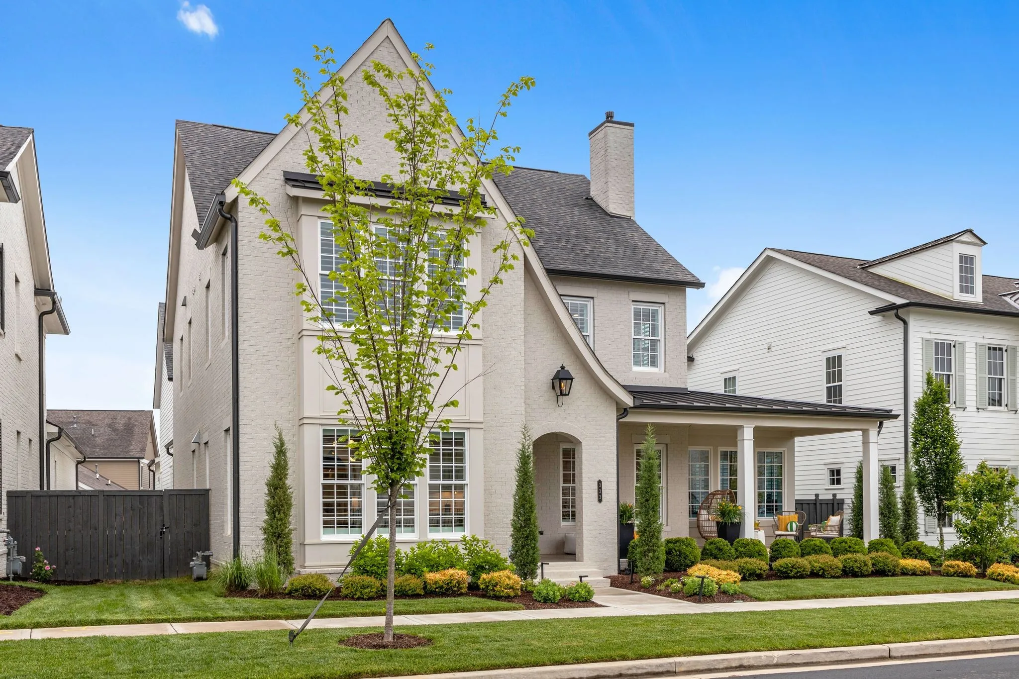 This remarkable former DeFatta Custom Home model is brimming with upgrades and luxurious features, offering an exceptional living experience. The main floor boasts two spacious bedrooms, while the upper floor includes three additional bedrooms and a bonus room. A studio apartment, located above the three-car garage, is accessible by elevator, or interior of the home providing additional living space or a private retreat. The interior is designed with elegance and functionality in mind, featuring a built-in wine bar, plantation shutters, a built-in sound system, and white oak wood floors throughout. The kitchen is equipped with Viking appliances, a 66″ refrigerator/freezer, and a 10′ island, making it perfect for both cooking and entertaining, while the stunning working pantry offers an ice machine, microwave, and ample storage. The community offers an array of amenities, including pools, tennis courts, pickleball courts, community gardens, walking trails, and regular community events.