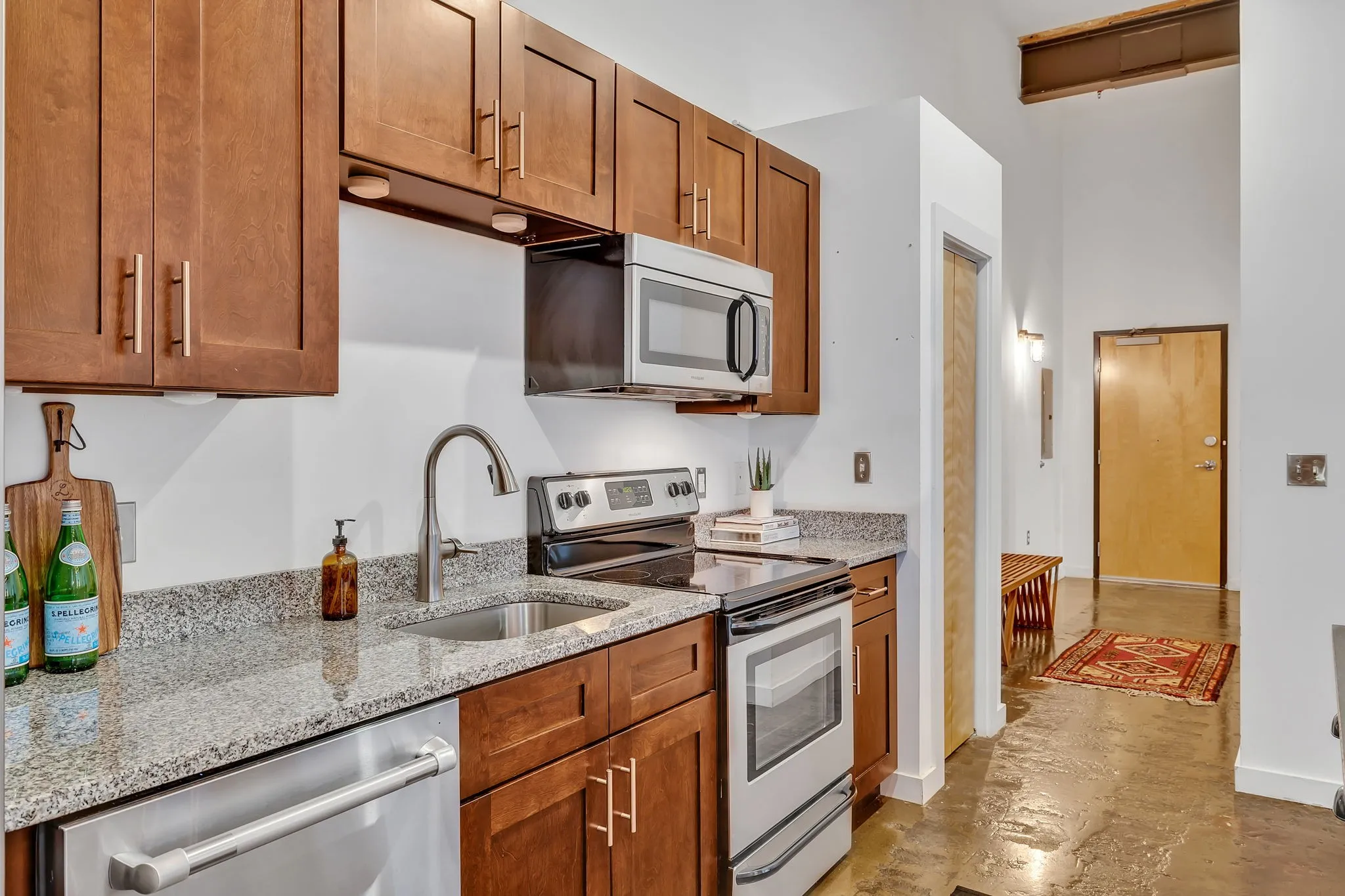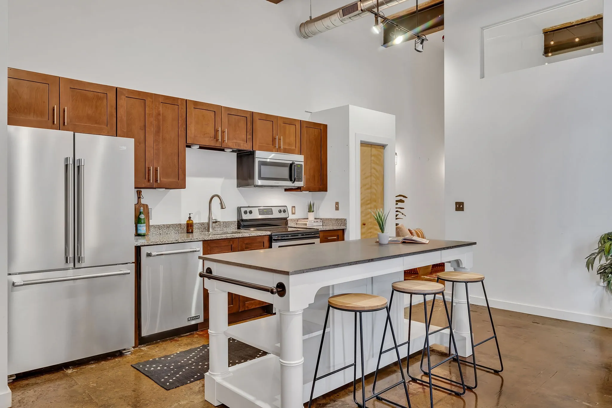 This rare heart-of-Germantown condo at Werthan has two bedrooms and two baths on ONE level with a very conventional floor plan (no mezzanines, spiral stairs, half walls, or doorless bedrooms). Extra large living space with original brick walls, concrete floors, and tall ceilings. Amenities galore! Located conveniently on the first floor close to the main building entrance. The charm of an historic loft in a pragmatic space.