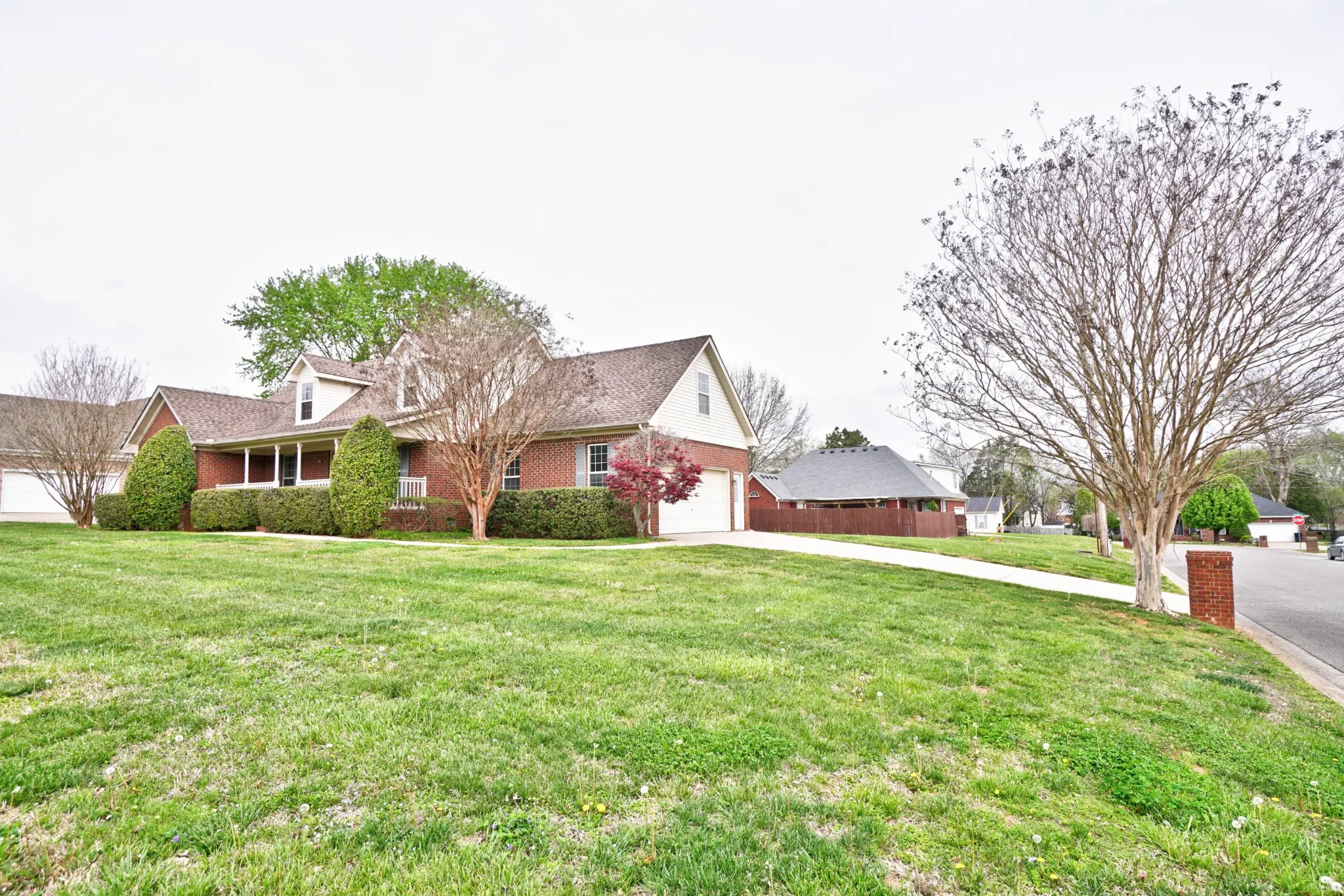 All brick move in ready home with a rocking chair front porch. Fresh paint and new flooring throughout, gas fireplace in the living room. The primary suite features a vaulted ceiling & full bath with double closets & vanities. Large yard on a corner lot with mature landscaping. The entire 945 sq. ft. upstairs is expandable!