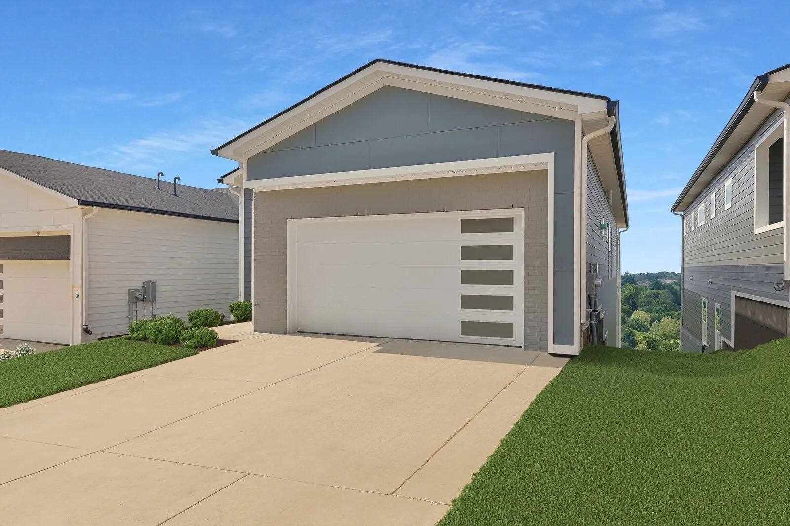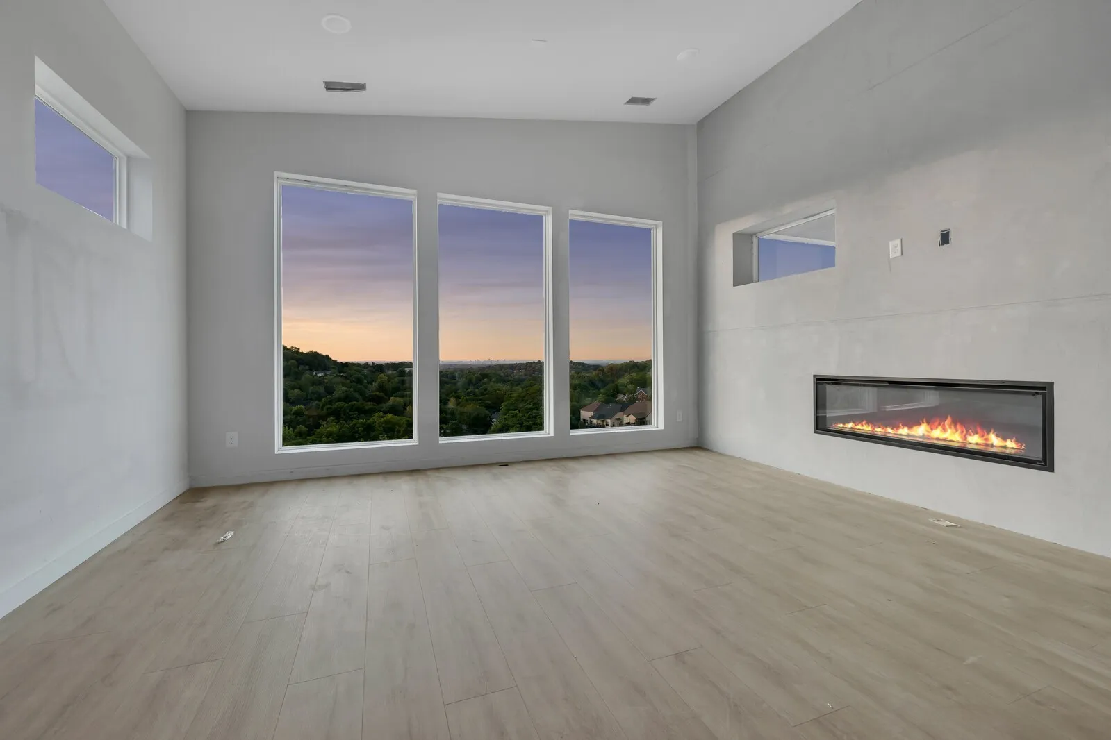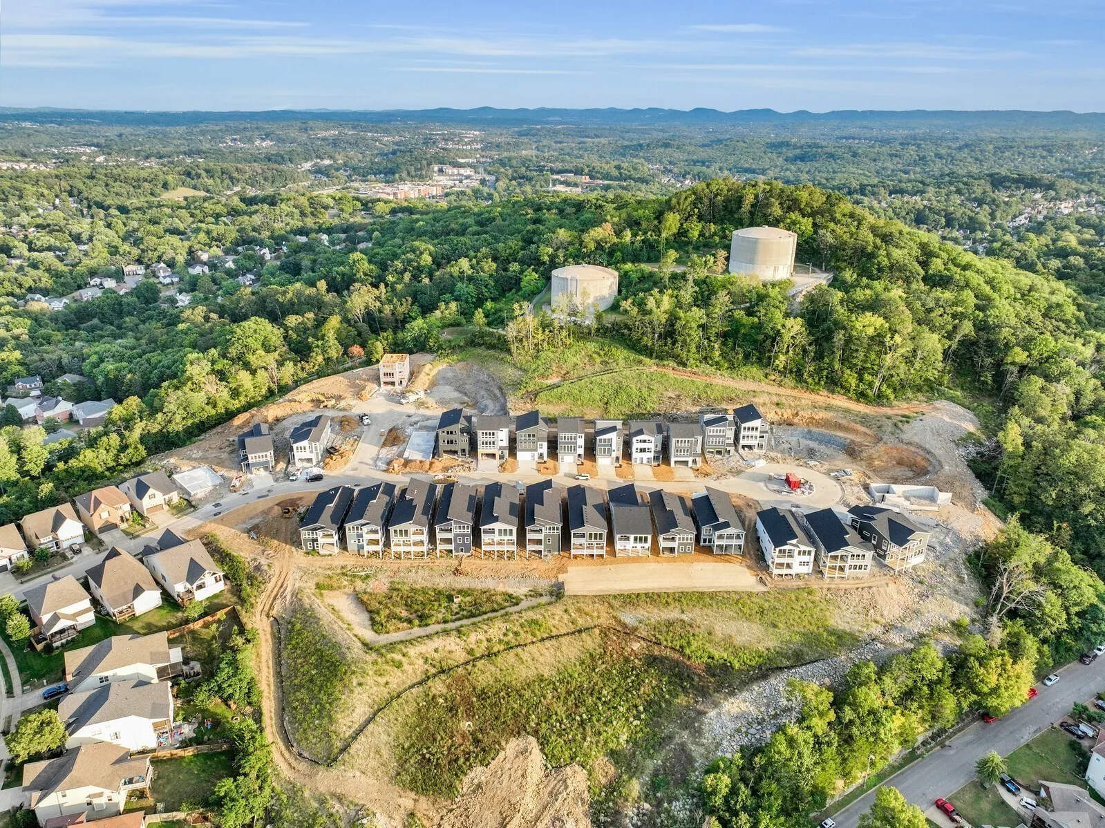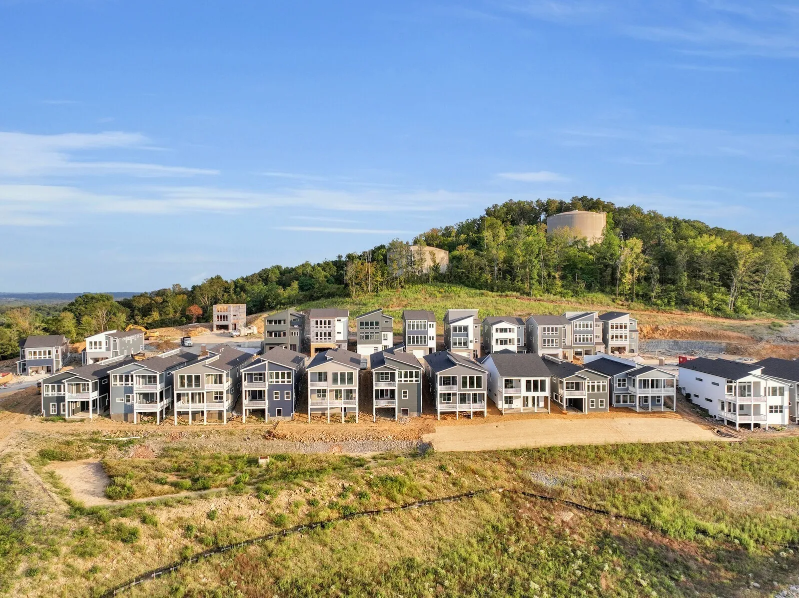 Unobstructed DOWNTOWN views from hillside modern homes nestled against Patterson Knob, one of the highest peaks in Davidson County. Ask about community grand opening seller paid closing costs AND exclusive permanent rate buydowns! Enjoy easy access to the best of city living and Williamson County, surrounded by rolling hills in a breathtaking setting. Feel the wide open spaces soaked in sunlight. Windows everywhere. Huge kitchen with full size fridge/freezer towers, gas cooktop, and wall oven/microwave are ready to entertain and take in the scenery. Custom modern fireplaces top off the living room. Custom primary BR closet systems, huge full panel master showers. Views north to downtown, west toward the Brentwood hills, and southeast overlooking Nolensville. 38 Custom homes in community. : The image is of a similar home in the neighborhood.