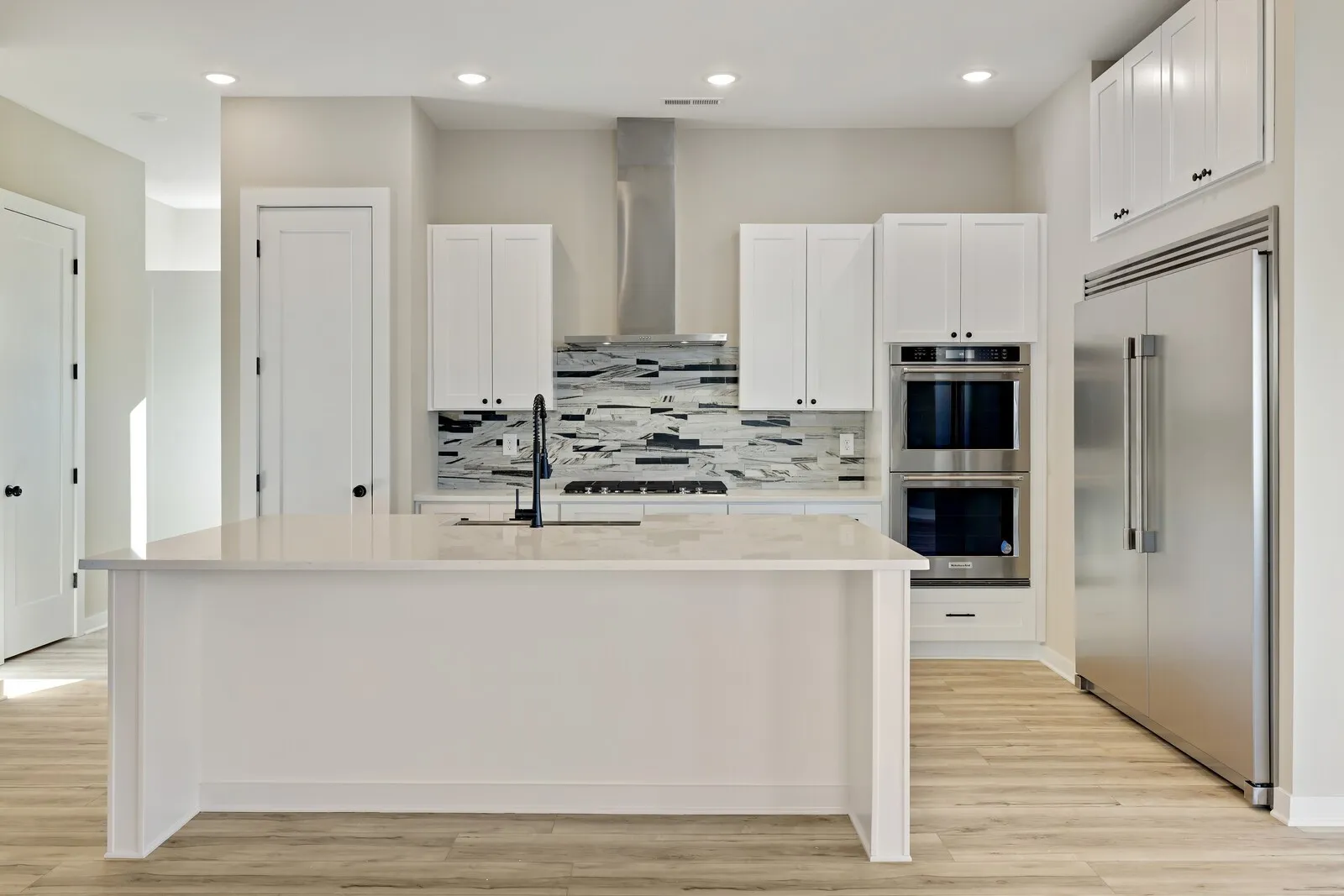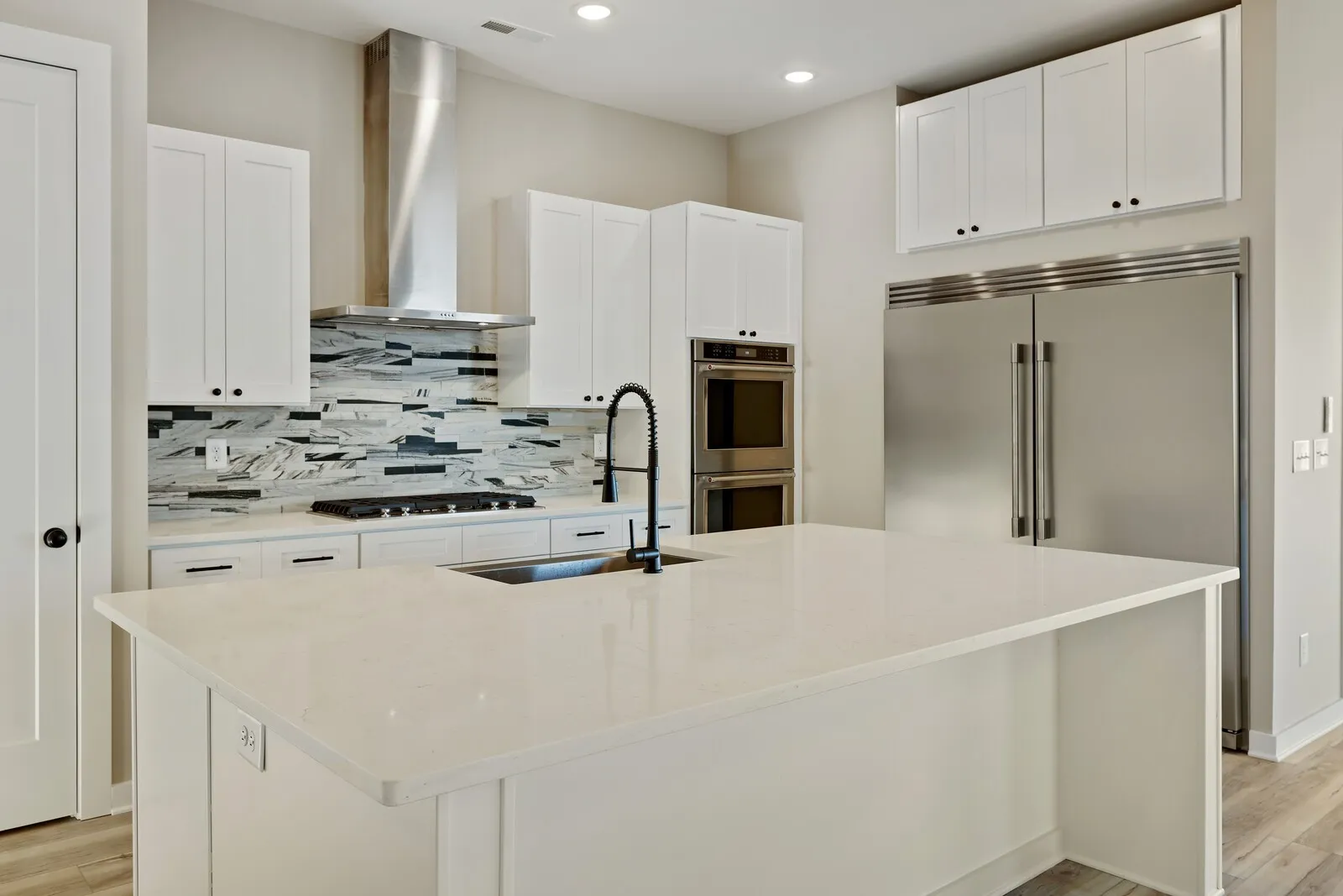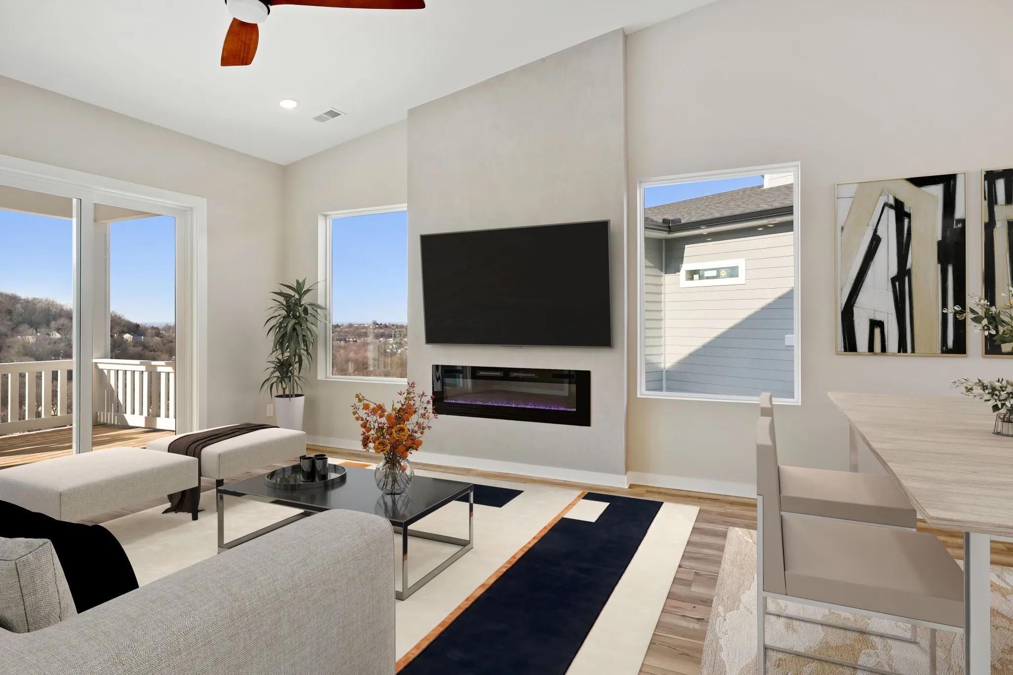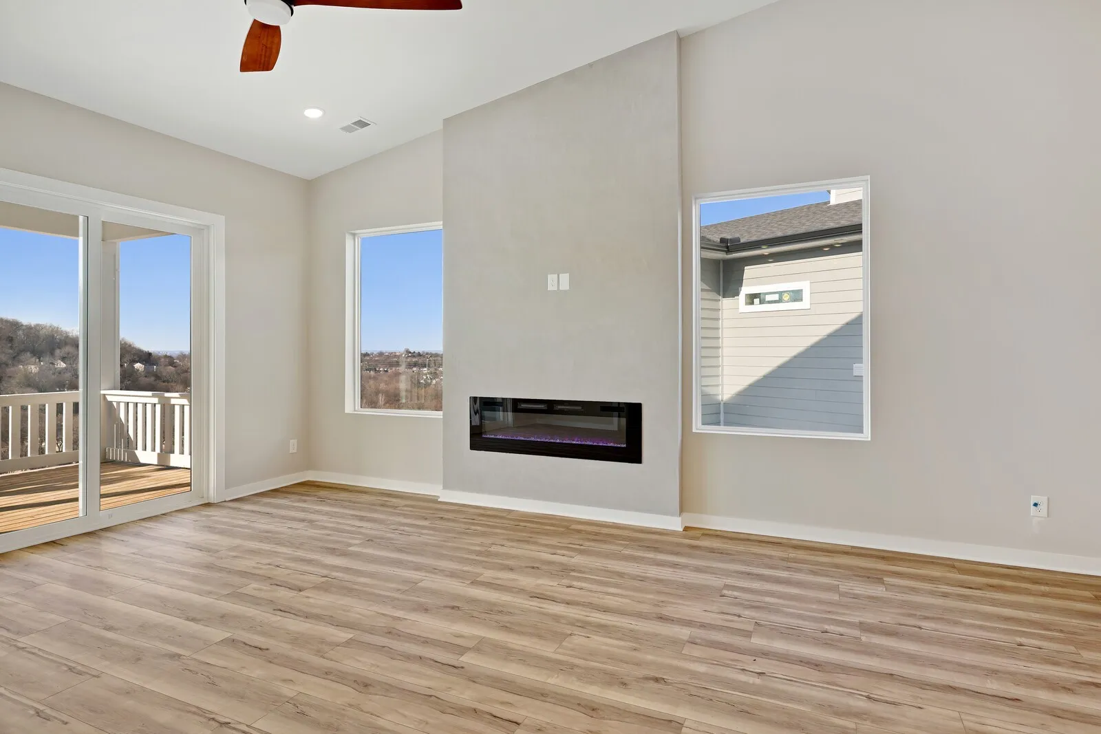 Unobstructed DOWNTOWN views from hillside modern homes nestled against Patterson Knob, one of the highest peaks in Davidson County. Ask about community grand opening seller paid closing costs AND exclusive permanent rate buydowns! Enjoy easy access to the best of city living and Williamson County, surrounded by rolling hills in a breathtaking setting. Feel the wide open spaces soaked in sunlight. Windows everywhere. Huge kitchen with full size fridge/freezer towers, gas cooktop, and wall oven/microwave are ready to entertain and take in the scenery. Custom modern fireplaces top off the living room. Custom primary BR closet systems, huge full panel master showers. Views north to downtown, west toward the Brentwood hills, and southeast overlooking Nolensville. 38 Custom homes in community. : The image is of a similar home in the neighborhood.