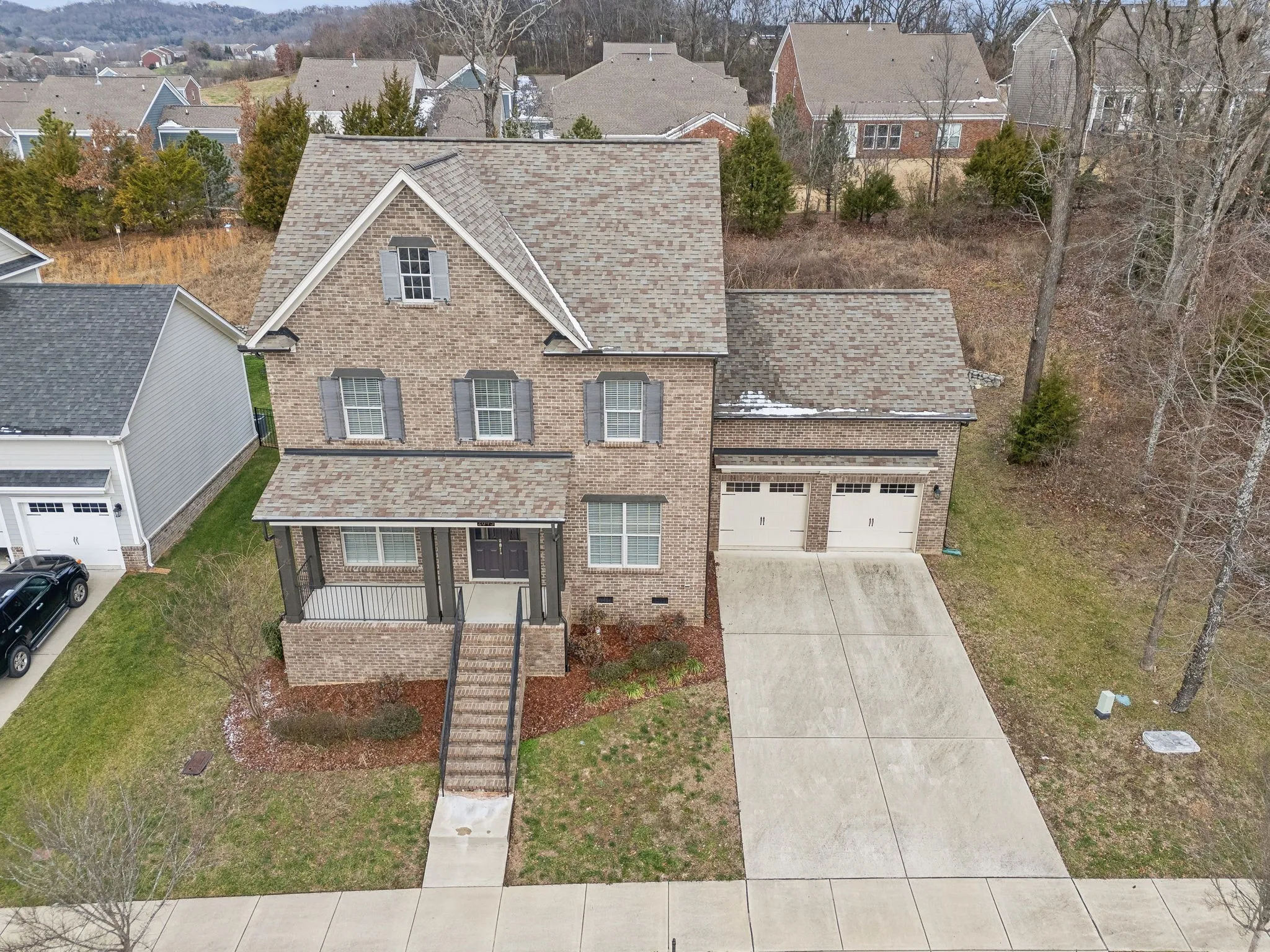 You will love this home, situated on a premier, private lot in desirable Tap Root Hills! Enjoy the sounds and views of nature from the covered back porch and the wall of windows offering so much natural light! Main floor features hardwood floors throughout, with formal dining, flex/office room, half-bath, and a very open layout with a chef’s kitchen – large island, cabinets galore, gas range w/ vent hood, and butlers pantry. Living area with fireplace and built-ins. Perfect for entertaining and everyday living! Upper level features primary suite, primary ensuite bath includes dual sinks, soaking tub, generous tile shower, and walk-in closet. 2 additional bedrooms, large hall full bath. Upper level recreation room, with large walk-in closet and additional attic storage, features large window overlooking green space. HVAC system is separated into 2 controllable climate zones (1st+2nd floors, then bonus room separately) for optimal comfort and energy efficiency. Gas line to grill in the back area. Adjacent to the home is a natural green space. Covered front porch has vista views of the TN hills. Neighborhood sidewalks and open spaces – designed with nature in mind – all while being minutes from retail and Franklin amenities. Fantastic location!