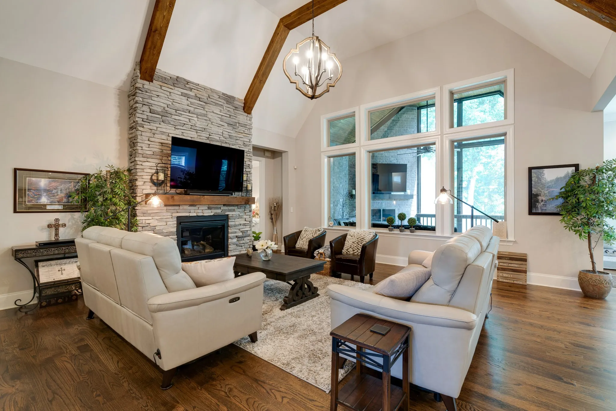 Highly sought after 3 bedrooms on main level with private baths in coveted gated community. Beautiful white Kitchen, Vaulted Family Room with beams and stone fireplace, 18×14 Screened deck with fireplace and 25×18 patio overlook mature trees, Formal Dining Room has French doors and would work well as an Office, Music, or Exercise Room. 2 Bonus Room (wet bar) offer lots of possibilities, 11×7 insulated walk-in storage, tall ceilings in Garage can accommodate loft storage.