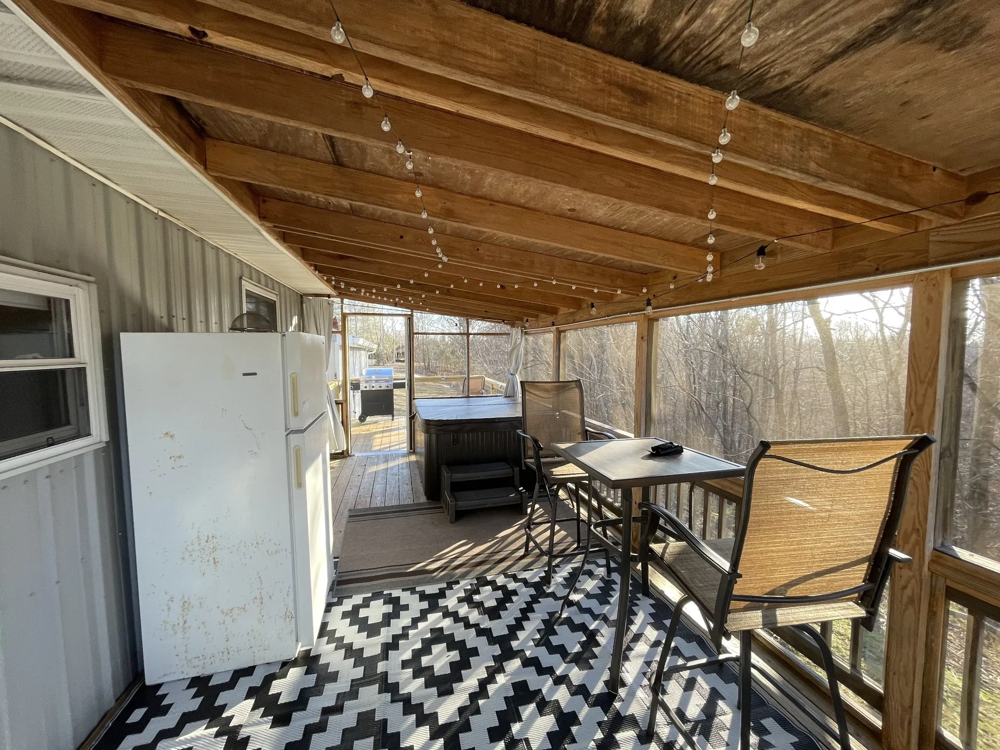 Covered back deck with hot tub