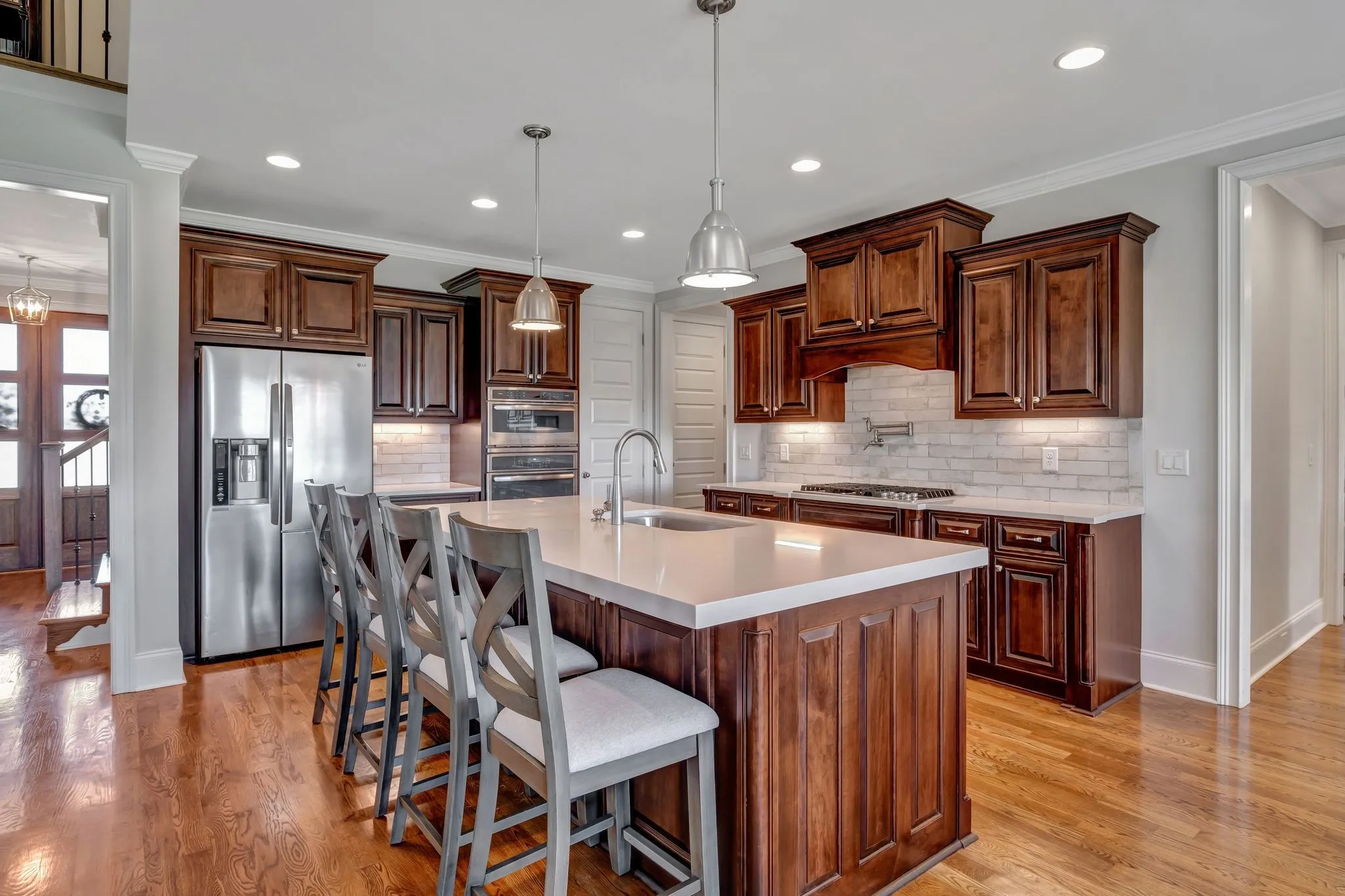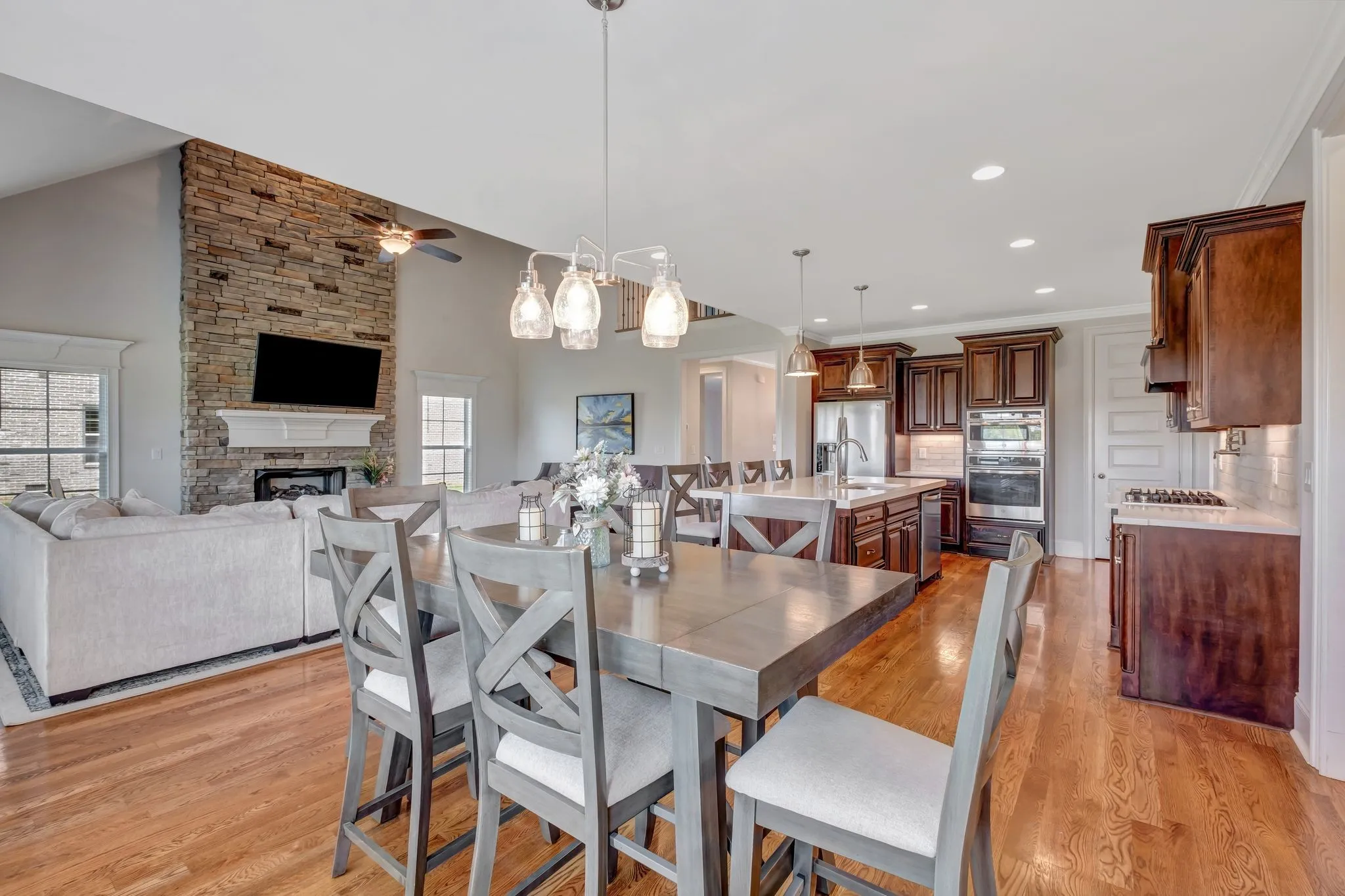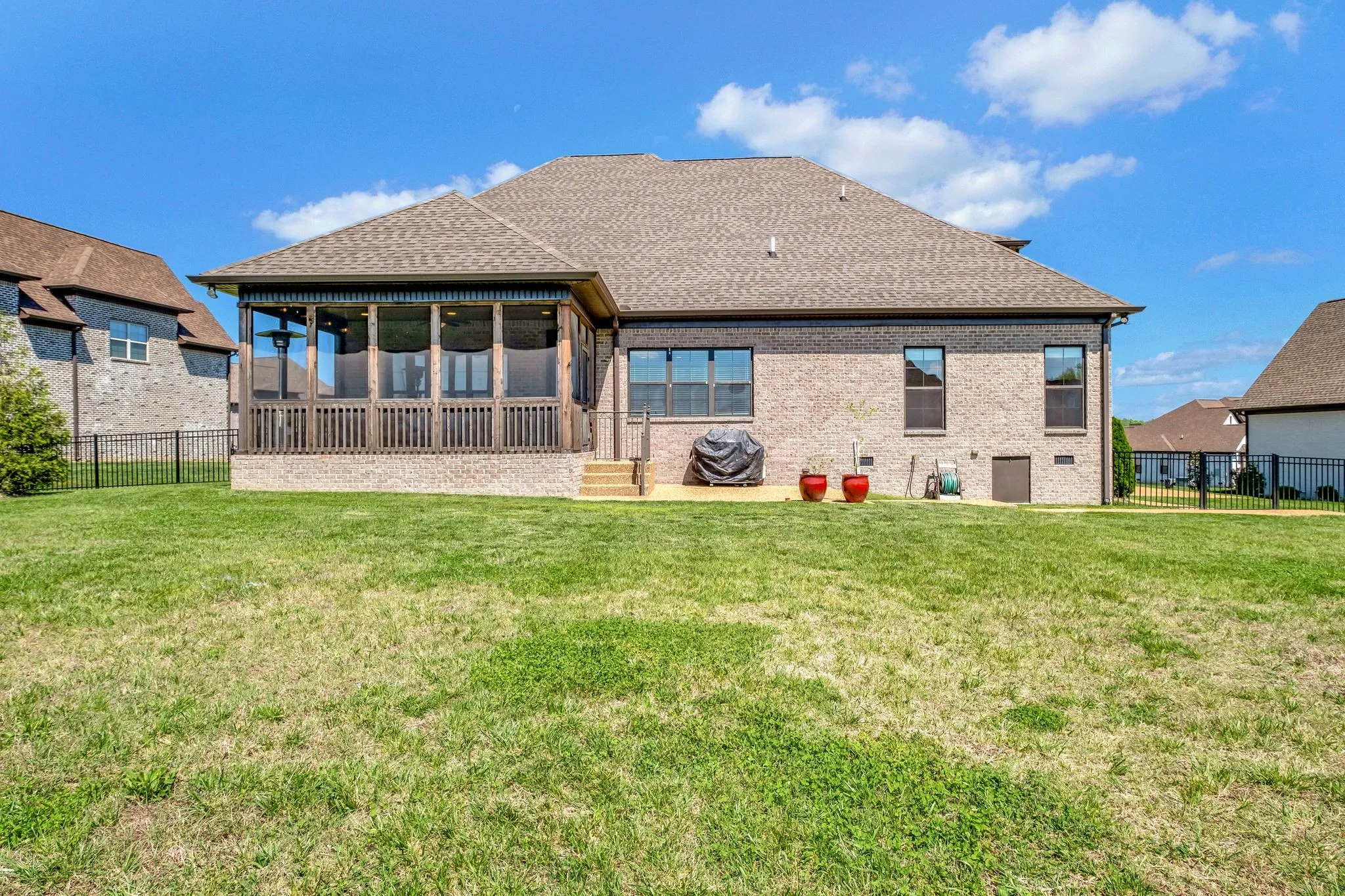 Nestled in the back of the amazing Wright Farms neighborhood is this stunning brick and stone family home. Warm-toned hardwood flooring greets you and your guests. The spacious open concept floorplan with soaring ceilings has a perfect layout. Two bedrooms and two bathrooms downstairs. You’ll love the massive stone gas fireplace in the living room. The kitchen has everything – a large island, stainless appliances, gas stove, and a pantry. Two upstairs bedrooms share a Jack and Jill bathroom and the other bedroom is an en-suite. When you step out back, you are greeted with a fully-screened covered patio and open patio area for your grill. The MASSIVE yard steals the show with two apple trees, raised garden beds, and 50+ giant Arborvitaes that provide much-desired privacy. This home is close to everything you need, but has the benefit of county-only taxes! Don’t forget to stop and see the lovely neighborhood clubhouse and pool area! The refrigerator and TVs will convey to the buyer.