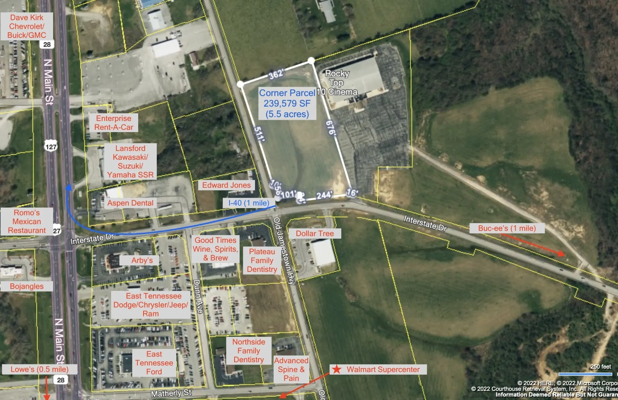 Located less than 1 mile from I-40, approx 1,000 ft from WalMart, and 7 minutes from Crossville historic corridor, this property is in one of Crossville’s most prime locations. The corner lot is being offered either as a whole 5.5-acre parcel for $1,200,000 – or split as LOT A ($800,000), and LOT B ($500,000).