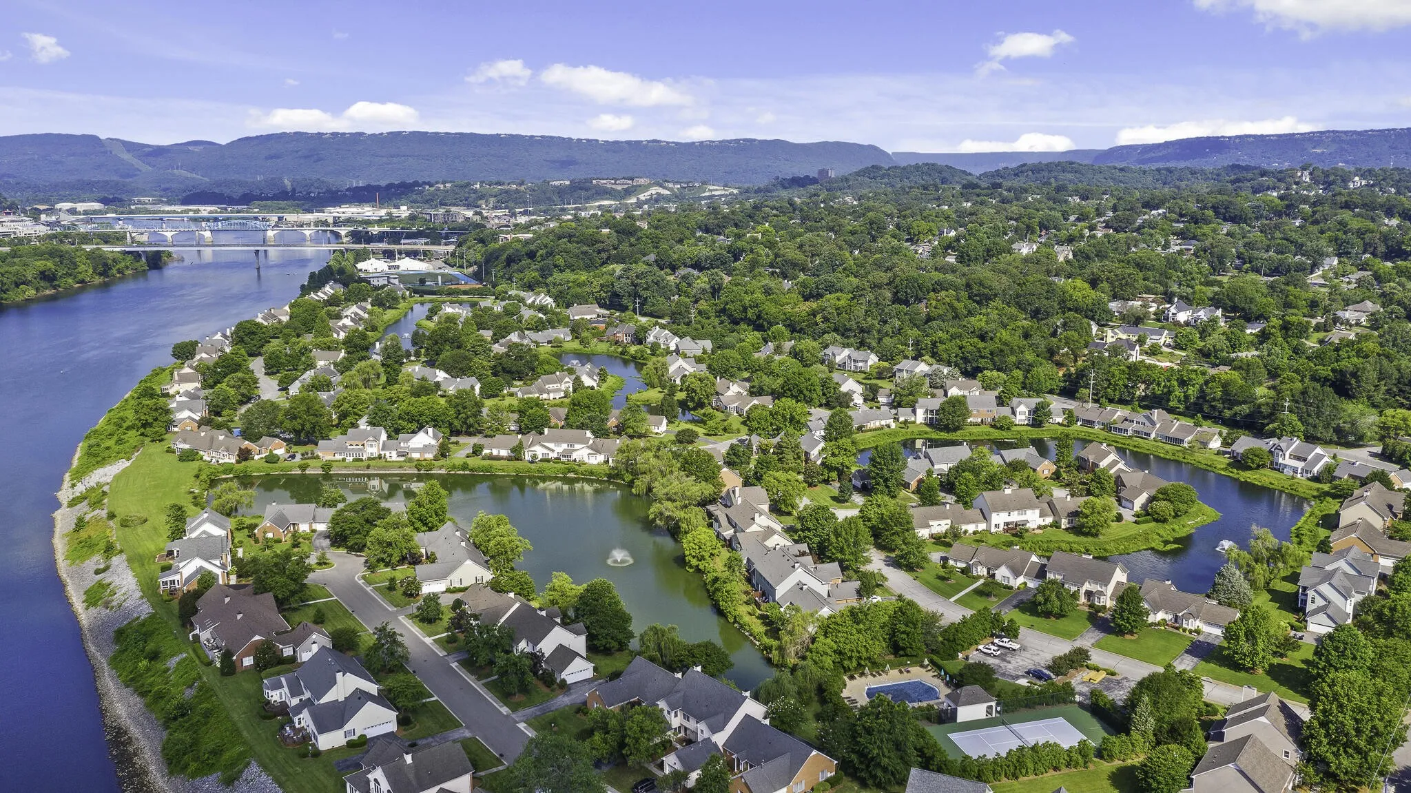 Luxury Living with Breathtaking Views! There is truly no other neighborhood like Heritage Landing. Located along the Tennessee River, just across from downtown Chattanooga, this gated community offers the perfect blend of city energy and peaceful, resort-style living. The location is absolutely unbeatable—only minutes from downtown, yet with amenities no other downtown neighborhood can match. The drive across one of Chattanooga’s iconic bridges is nothing short of breathtaking. This is why they call it the Scenic City! You’ll enjoy the backdrop of the downtown skyline of the Tennessee Aquarium, the Hunter Museums, and the historic Walnut Street Bridge all reflecting on the river, and illuminated at night. You’ll be reminded daily that this is such a beautiful place to live! A 5-10 minute walk takes you to the vibrant shops and restaurants of Riverview and Frazier Avenue, while the flat, bike-friendly roads with dedicated lanes allow you to easily ride to and enjoy Coolidge and Renaissance Parks along the river. You can even bike to Whole Foods and Publix for groceries, making daily errands so convenient and a pleasure. This elegant 2-bedroom, 2.5-bath condo offers spacious interiors filled with natural light, hardwood floors, and stunning views. The spacious open living and dining area features a gas fireplace and French doors leading to a private deck overlooking a serene fountained pond, where you’ll enjoy spectacular sunrise and sunset views. The kitchen is a dream for any cook, featuring leathered granite countertops, ample cabinet and pantry storage, a drop-in gas range, instant hot and cold drinking water, and a brilliantly designed layout for maximum efficiency and ease. A charming breakfast nook, set in a beautiful bay window, overlooks the expansive front yard and quaint street the perfect spot to start your day.