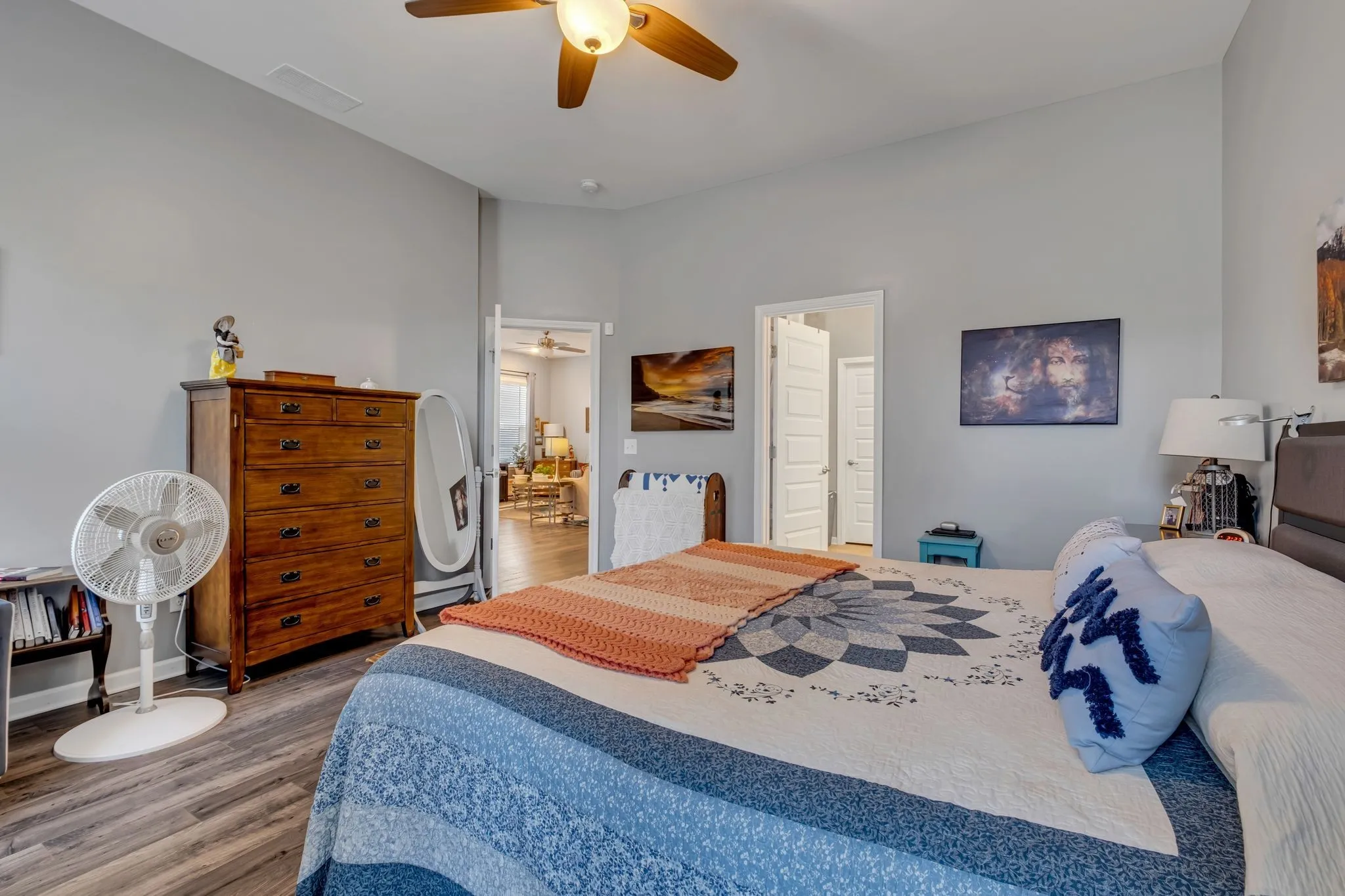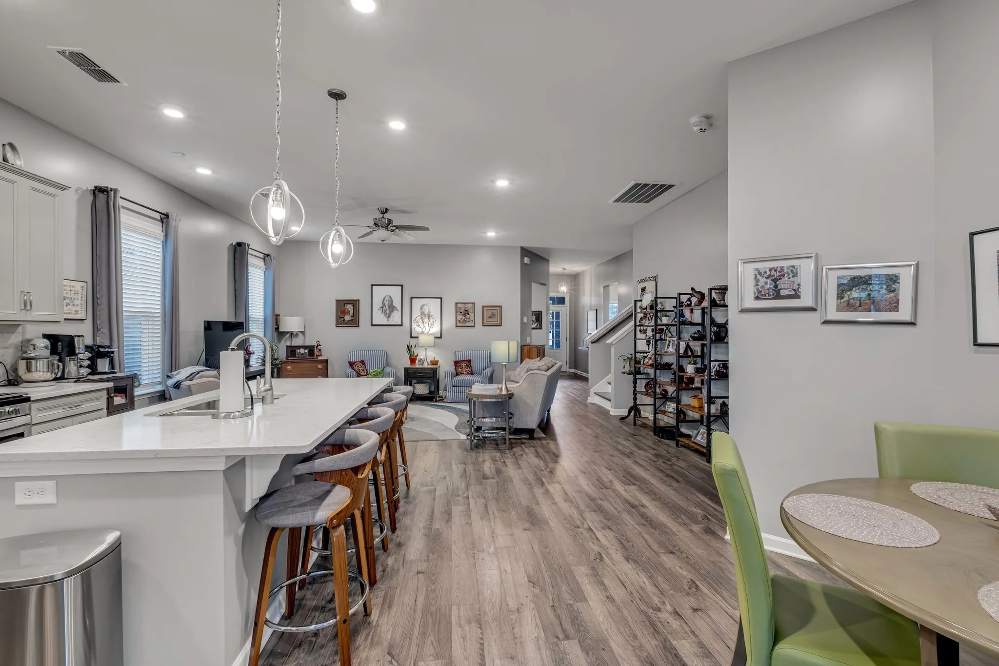 Fully fenced back yard and patio backs up to deep wooded area; quiet neighborhood with walking paths throughout; master suite, second bedroom and full guest bath on first floor; third bedroom/craft room and full bath on second floor; large master bath; custom master closet by Closets by Design; all quartz kitchen countertops; large island seats four; new appliances; five-burner gas range; all walls and closets with custom satin paint; LED lighting throughout. AT&T Fiber, Google 5G Fiber and T-Mobile all available.