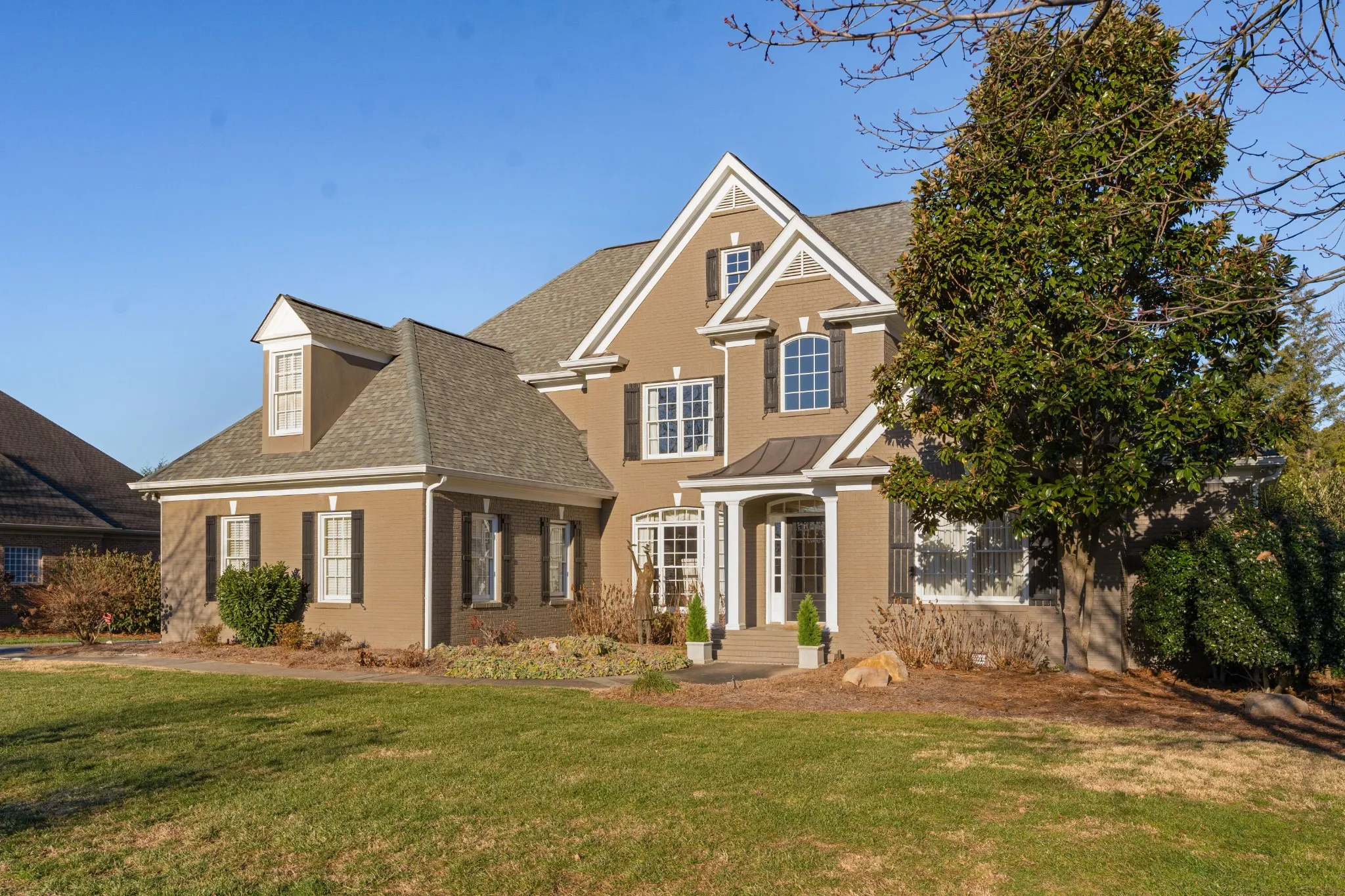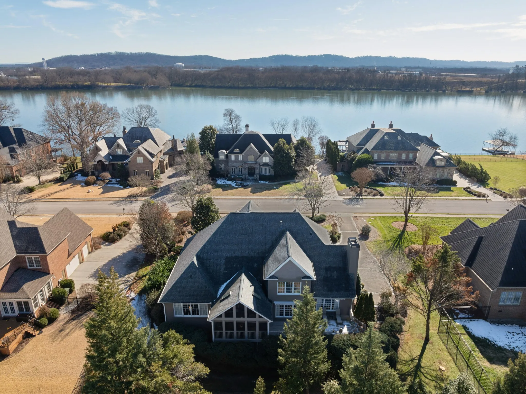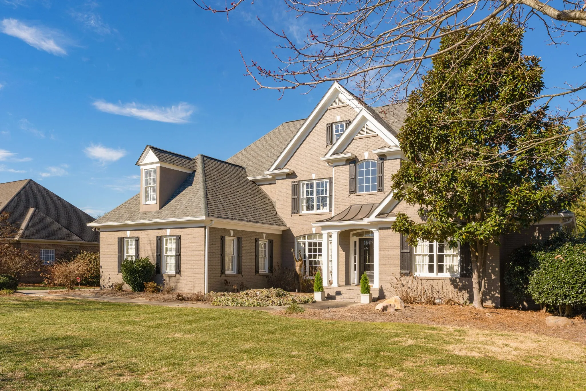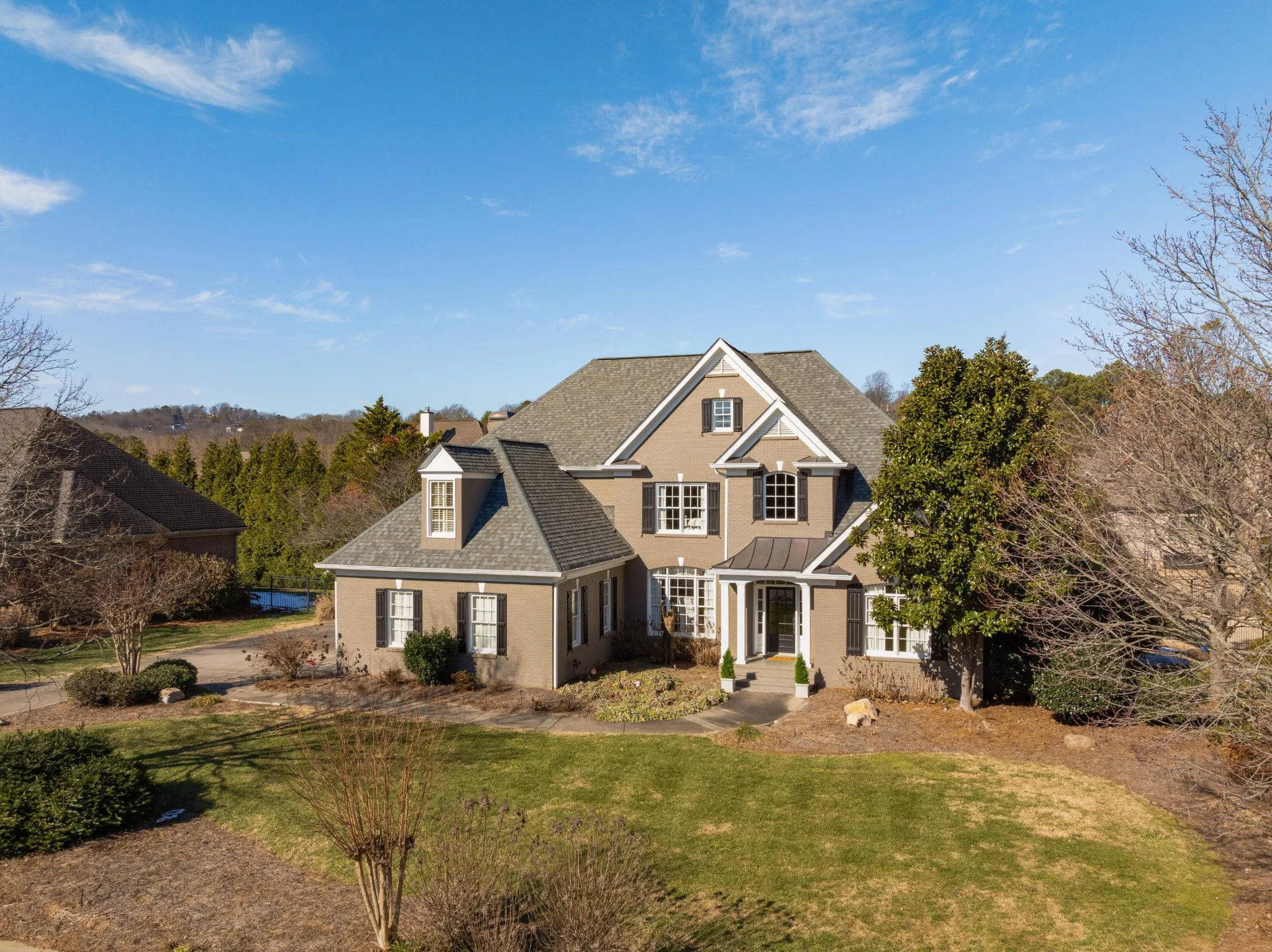 All brick, 4 bedroom, 4.5 bath home with a fantastic floor plan in The Enclave at Riverview. This one-owner home boasts an open floor plan, specialty ceilings, hardwood floors, new paint, new carpet, wonderful natural lighting, the primary on the main, en suite guest bedrooms, great living spaces both indoors and out, and a 3-car garage – just to name a few. Recently painted inside and out and new carpet in the bedrooms, your tour begins with the 2-story foyer with a sweeping staircase that opens to an office/library on one side and the formal dining room on the other. A large great room has a vaulted ceiling and a limestone gas fireplace with built-ins on either side, and you will definitely gravitate to the adjoining kitchen, breakfast and keeping room with access to the screened in porch and rear deck with automated awnings providing a nice flow for everyday living and entertaining. The kitchen has granite countertops, subway tile backsplash, a center island, a raised breakfast bar, Jenn-Air downdraft gas cooktop and double wall ovens, under-cabinet lighting, a double door pantry and is just steps from the laundry room and garage. The primary bedroom is on the opposite side of the main level and has a double-trey ceiling, is large enough to accommodate a sitting area, has access to the screened porch and two walk-in closets. The primary bath has separate vanities, a soaking tub and a double shower with tile and glass surround. The upper level has 3 additional bedrooms, all with private baths, as well as a bonus room and walk-out attic storage. There is additional storage in the partially floored ceiling attic. The neighborhood offers a great place to get out and walk/run/bike, plus there is a community pool, tennis courts and clubhouse. All of this, and you are just minutes to schools, parks, hospitals, the shopping and restaurants of the North Shore and downtown Chattanooga, so please call for more information and to schedule your private showing today.