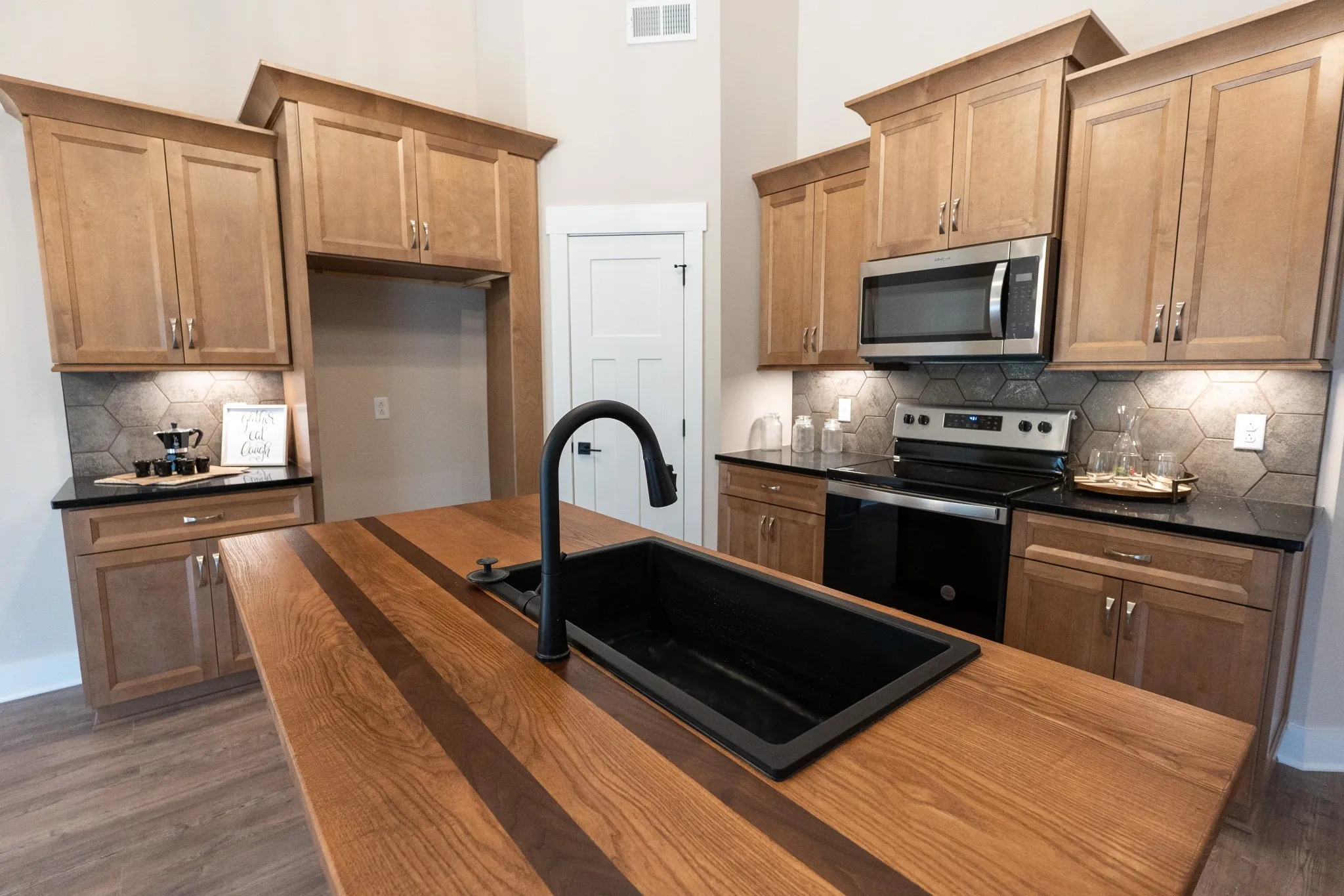 The main living area features a cozy electric fireplace surrounded by built-in storage cabinets and large windows that bring in abundant natural light and offer peaceful wooded views. The living, dining, and kitchen areas flow seamlessly together, making this home perfect for everyday living and entertaining. The kitchen is a true highlight with a natural wood butcher block island, quartz countertops, tile backsplash, and two pantries—including a spacious walk-in pantry.