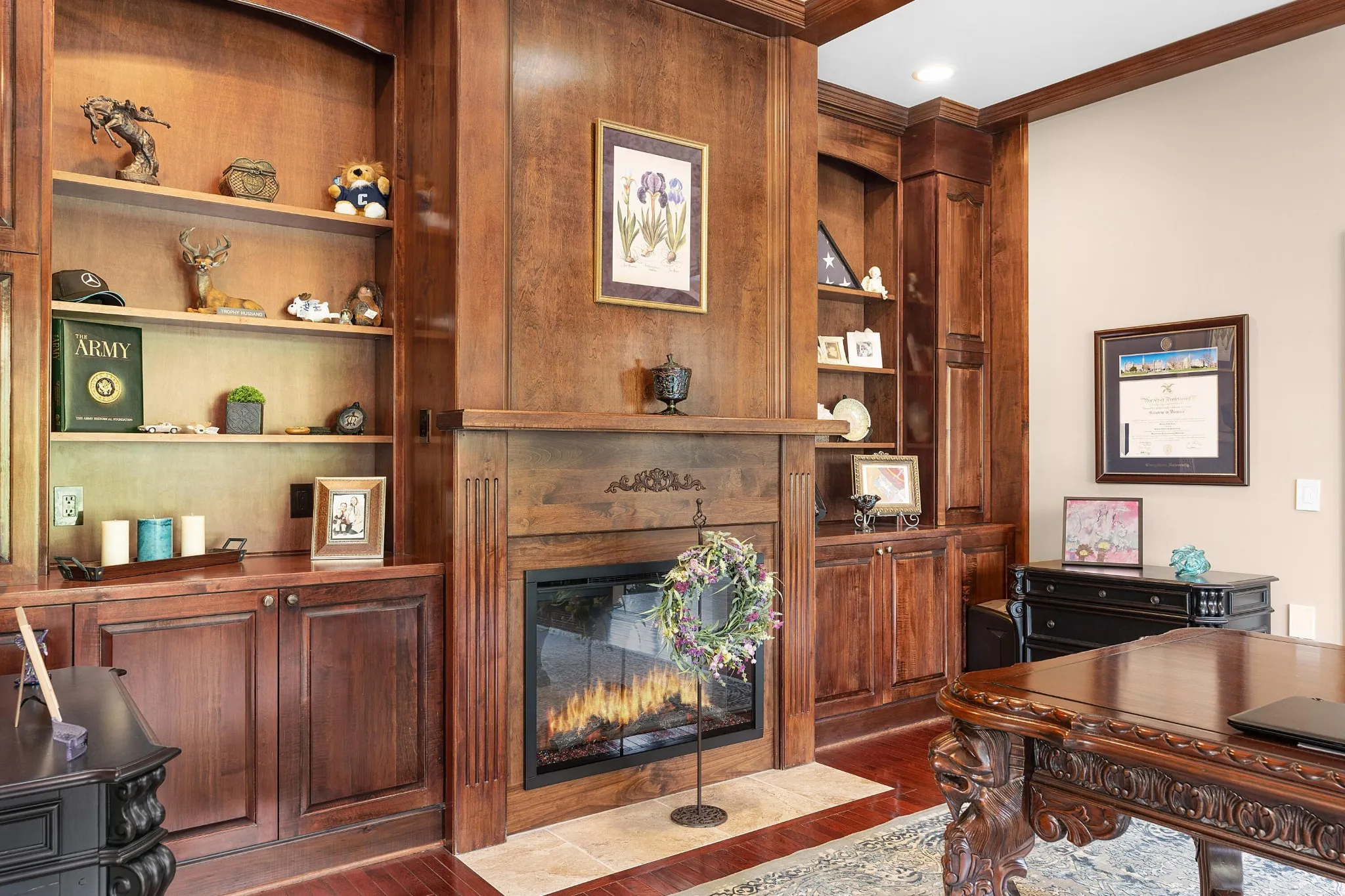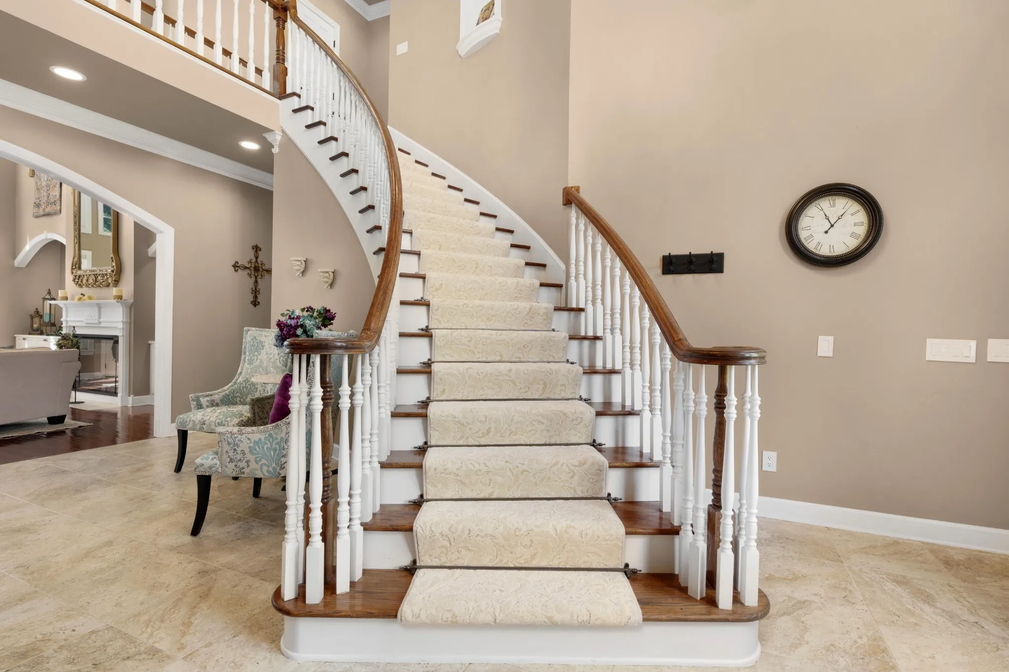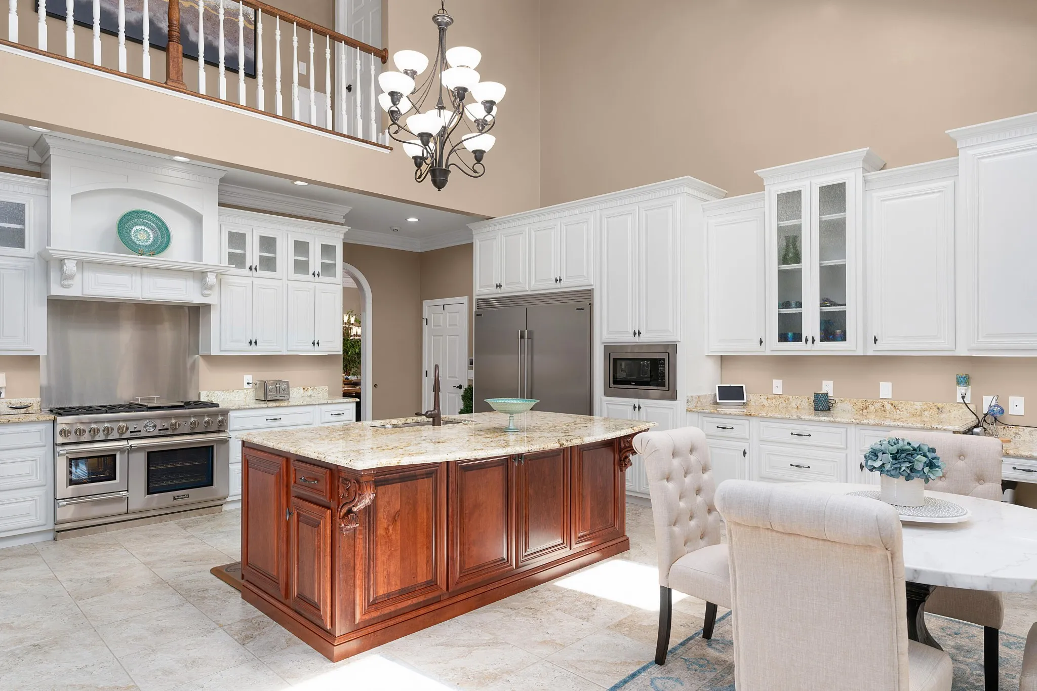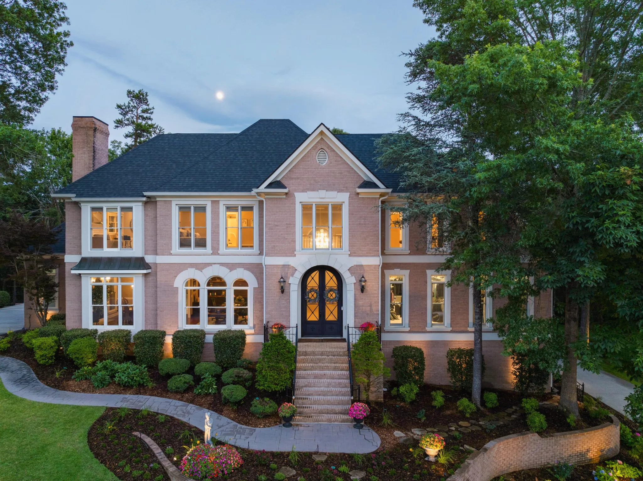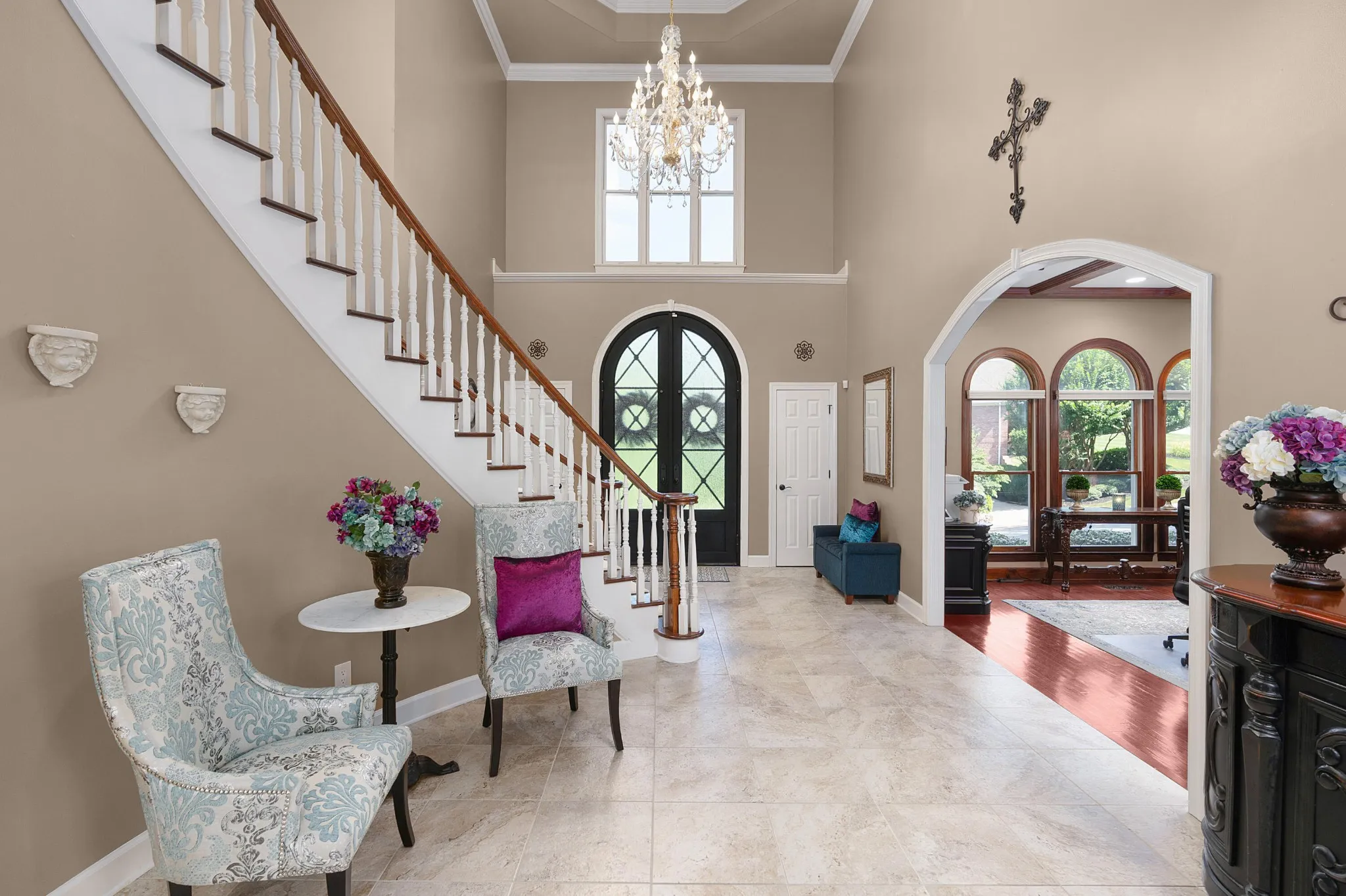 Stately, five bedroom, 5.5 bath home beautifully positioned on two lots totaling approximately 2.34 +/- acres in the desirable and established Mountain Shadows community in East Brainerd close to schools, shopping, restaurants, medical facilities and more. The home has a versatile floor plan and will appeal to a variety of dynamics with its multiple living spaces, en suite bedrooms and spacious rooms. The home boasts hardwoods on the main and new carpet on the upper and lower levels, 7 electric fireplaces, beautiful new iron and glass double front door, decorative lighting, remote controlled blinds, specialty ceilings, granite countertops, crown moldings, arched doorways, lofty ceilings, the primary suite on the main, a finished daylight basement, whole house dehumidifier and clean air system, wonderful outdoor living spaces, fantastic storage, 3 garage bays, covered parking in back via a second driveway, mature landscaping with irrigation, whole house generator, a self-monitored, steel locking doggy door, a fenced dog run and more. Entry to the home is via the grand foyer with sweeping staircase that opens to the great room and the office or living room. The office has a coffered ceiling, fireplace, built-in cabinetry and arched doorway to the formal dining room. The 2-story great room also has a fireplace with built-ins on either side, French doors to the rear deck and two arched doorways to the kitchen and breakfast rooms. You will absolutely love the kitchen with its wonderful natural lighting due to the skylights and bay window in the breakfast area, and it also features a center island, granite countertops, white cabinetry with soft-close drawers, under-cabinet lighting, stainless appliances, including the Thermador gas range with double oven, a refreshment center with extra sink and beverage fridge, a built-in desk area and is just steps from the laundry room and garage for easy loading and unloading.