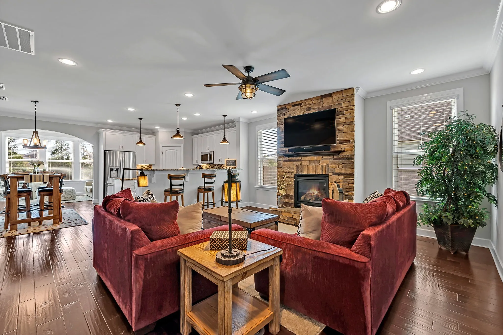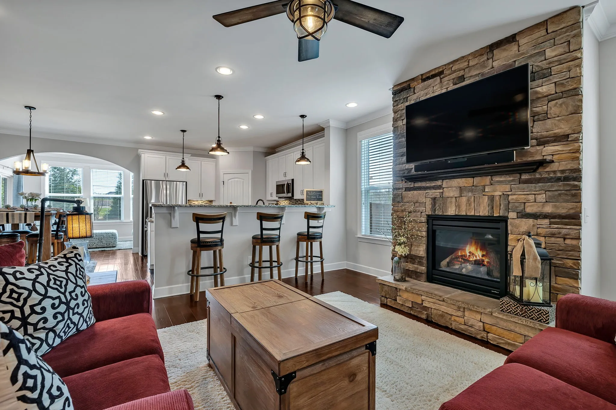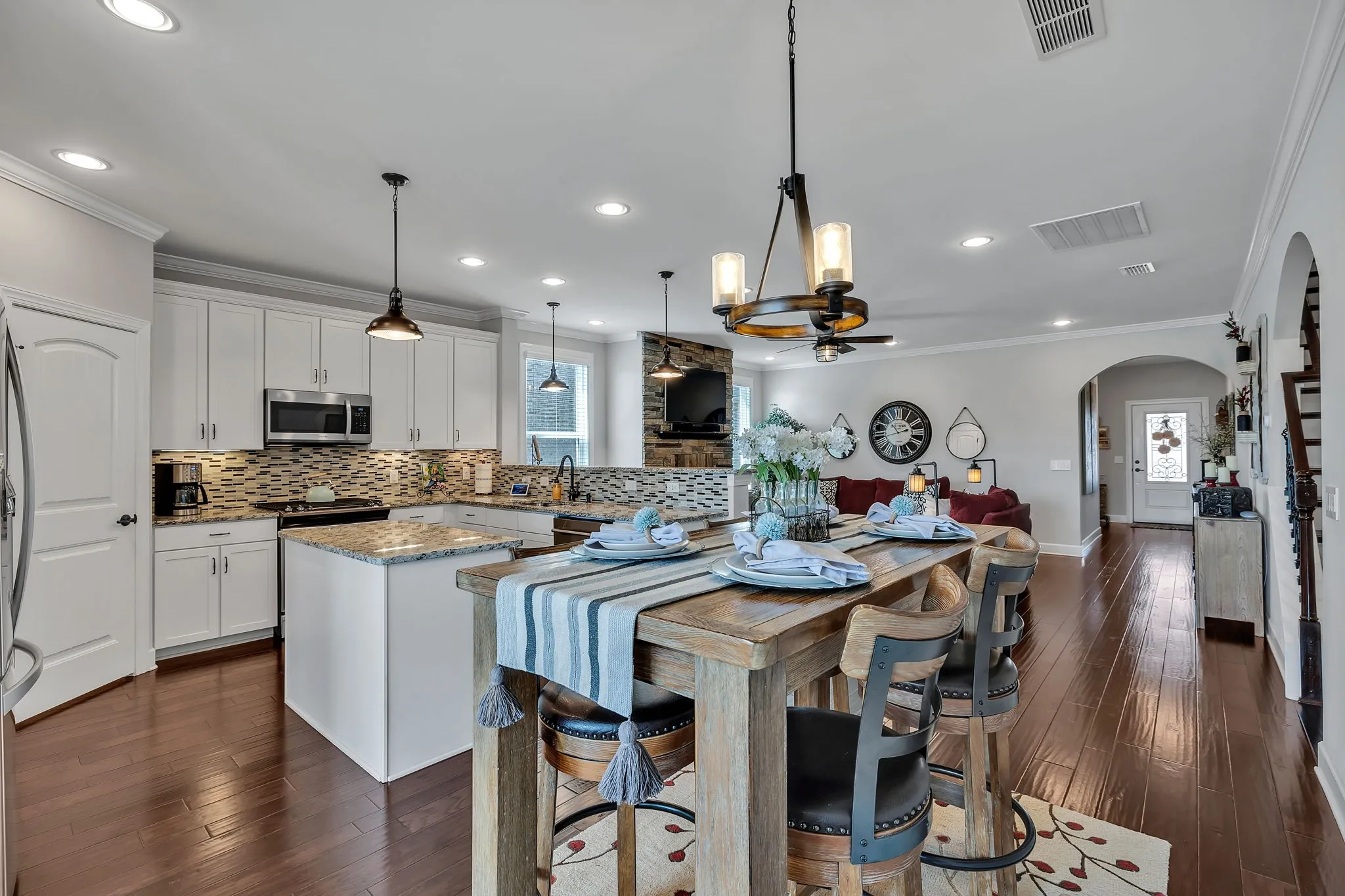 Stunning, meticulously maintained 3BR/2.5BA w/ bonus & morning room. The extensive upgrades and custom work the original owners have done to this home is simply breathtaking. Spacious open living area features beautiful hardwood floors, stone gas fireplace. Custom kitchen w/ island, gas stove, tile backsplash, granite countertops, and pantry w/ custom built-ins. Spacious primary bedroom featuring tiled shower/tub separate, dbl vanity, his & her closets w/ custom built-ins. Front secondary bedroom features custom designed Murphy Bed w/ bookcases and custom closet designs. Designer smart lighting throughout. Spacious bonus room upstairs, perfect for entertaining and cozy sunroom leading out to a backyard paradise! Beautiful, custom designed hardscaped patio w/ sitting wall, columns, gas firepit & grill, custom pergola, designer landscaping, front/back irrigation, front stone elevation, beautiful landscaping…and much more, all in the heart of Mount Juliet. This one truly is special!