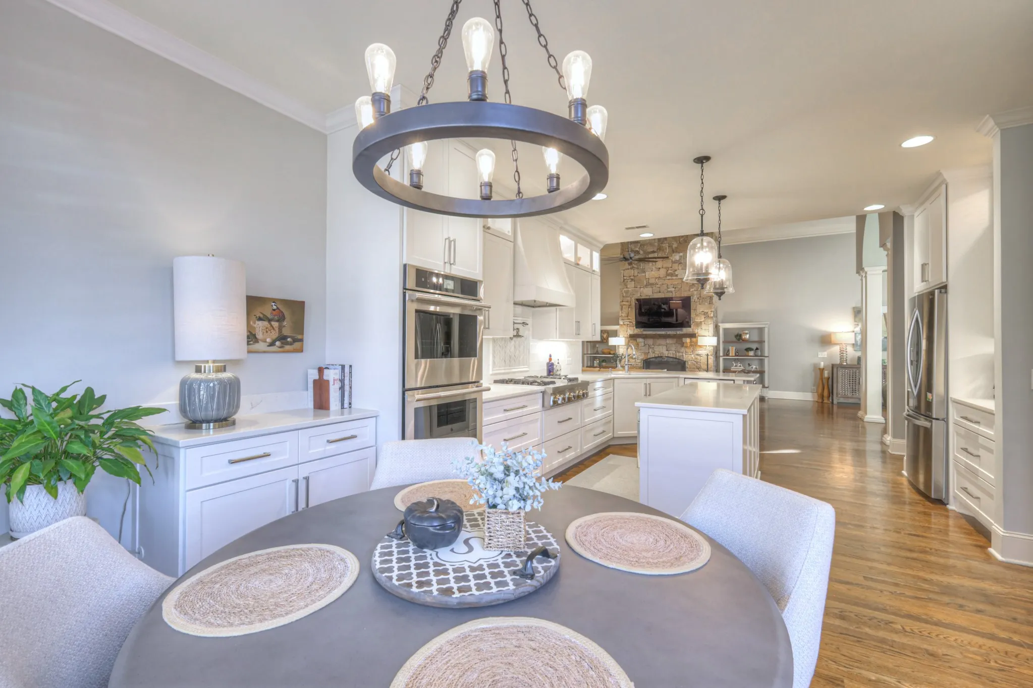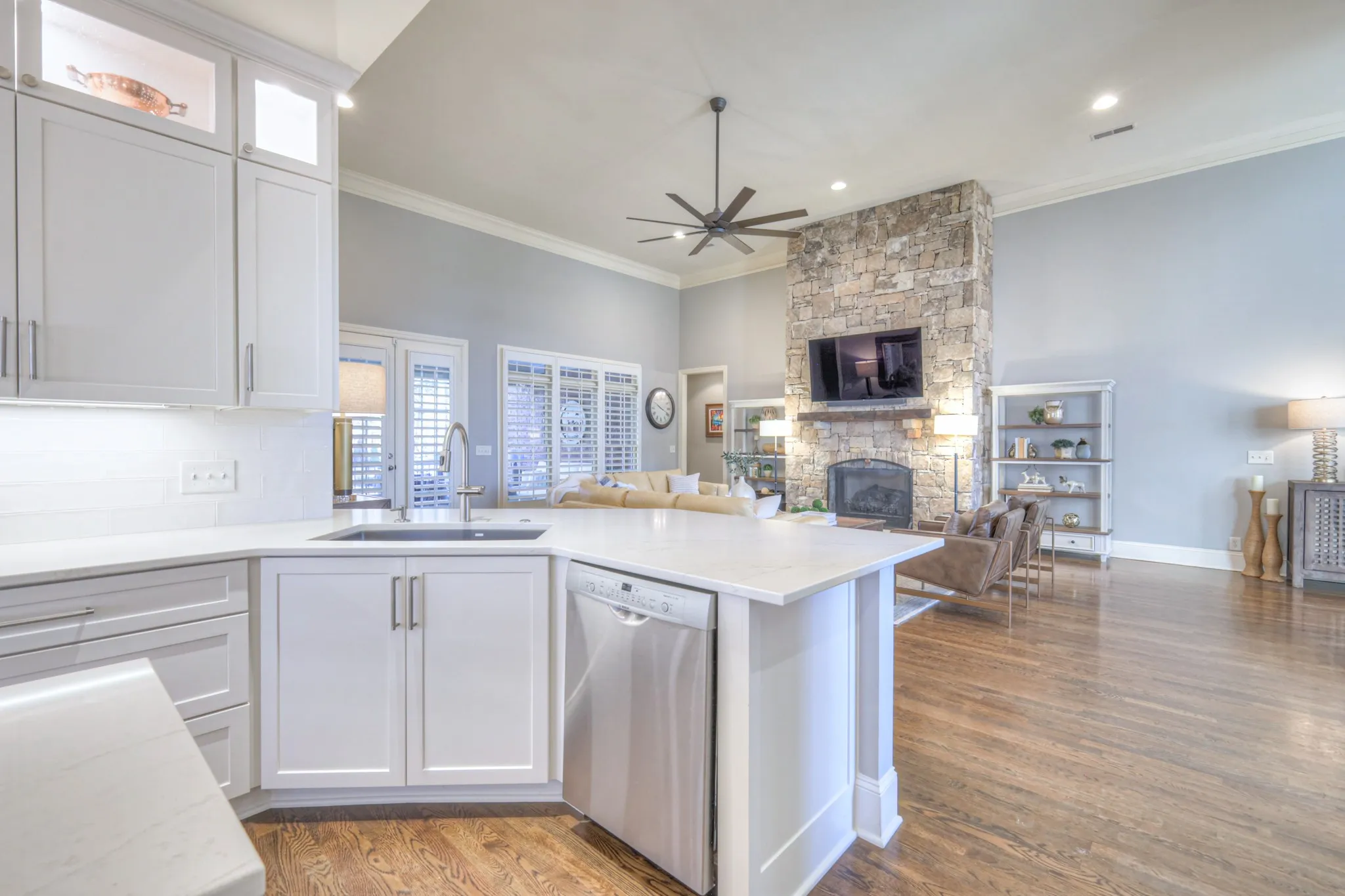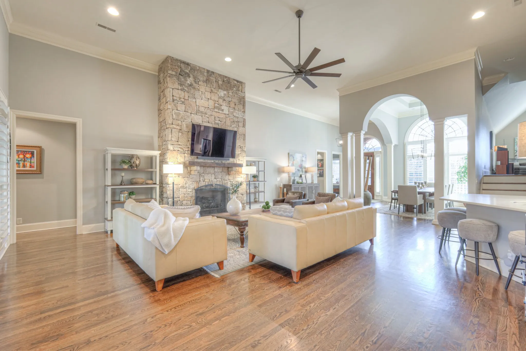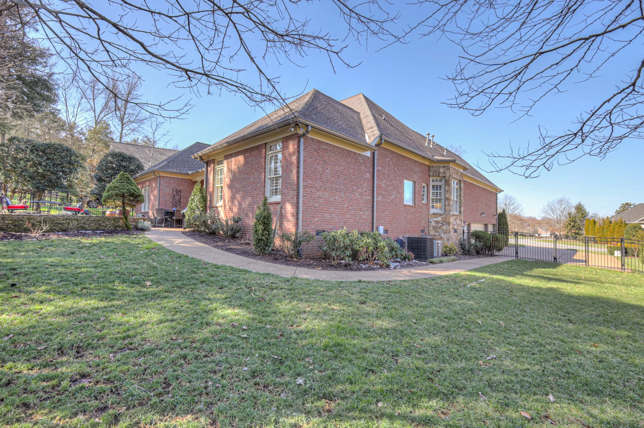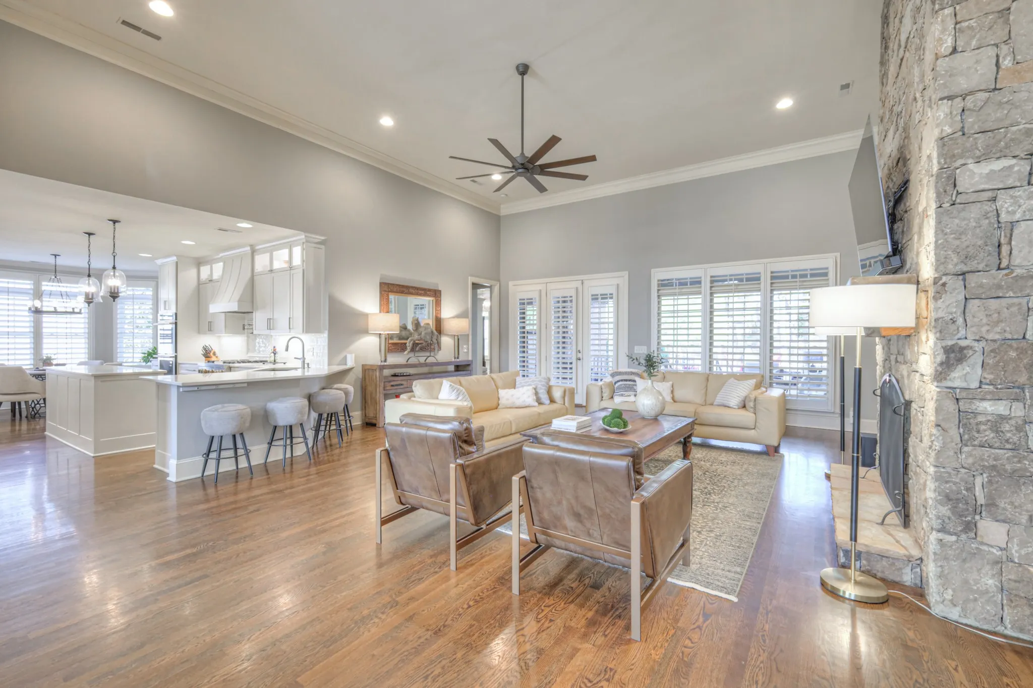 +"PublicRemarks": "Experience luxury living in this stunning new listing in the prestigious gated community of Kings Chapel. Boasting over $230,000 in upgrades and updates, this breathtaking home features modern finishes with a spacious, open-concept. The rich, hardwood floors, 5" plantation shutters throughout, and upgraded wall designs are a perfect blend of comfort, sophistication, and style, that rival even the finest new construction. You are greeted in the foyer by an expansive 14 ft. ceiling, floor-to-ceiling stone fireplace, and an open, board-and-batten-walled dining room. The exquisite, modernized and re-imagined custom kitchen is a chef's dream with top of the line JennAir commercial-style appliances, custom ceiling-height cabinets, custom vent hood, ample pull-out drawers, coffee station, wine refrigerator, large island with trash compactor and under-counter microwave, and sleek, quartz countertops. Expansive windows fill the home with natural light, highlighting the elegant details throughout. The Owner's suite is nestled in the back as a private retreat with a recent, total renovation of the en-suite bathroom, with over-sized vanities, full-glass shower, and free-standing soaking tub. Additional bedrooms with tray ceilings, office, and updated bathrooms provide ample space for family and guests. This rare find is an impressive floor plan having all bedrooms on the main living level!. Only seven steps up to the extra-large 33X24 den, which features a wet bar, powder bath, Revel in-ceiling galore with walk-in floored attic space. Pebble stone driveway leads to three car garage, gorgeously maintained yard with irrigation system, and an encapsulated crawl space with dehumidifier. This home sits in a gated community with walking trails galore, stocked fishing pond, and optional private club with full time chef. Additional upgrades include new roof, second story HVAC, and many more listed on the attached pdf...Nothing has been untouched"