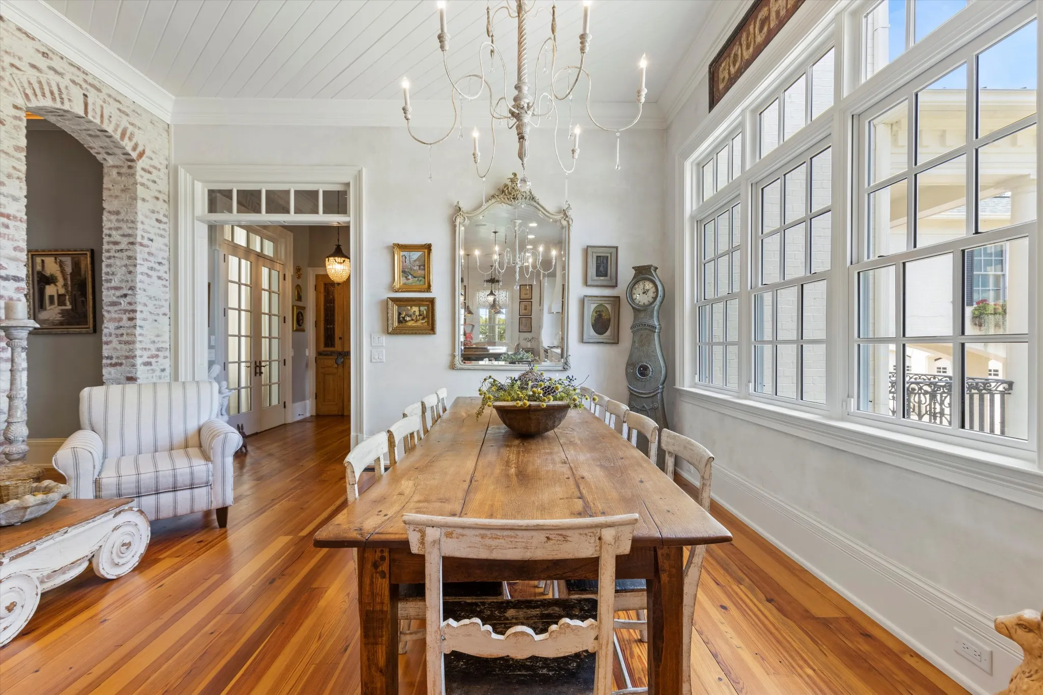 As you step inside, you’re greeted by 12 foot ceilings, reclaimed antique heart pine floors, and an abundance of natural light that highlights the beauty of each room. Impeccable attention to detail is evident throughout, with custom woodwork, beautiful crown molding, and tasteful interior brick accents adding character and charm.