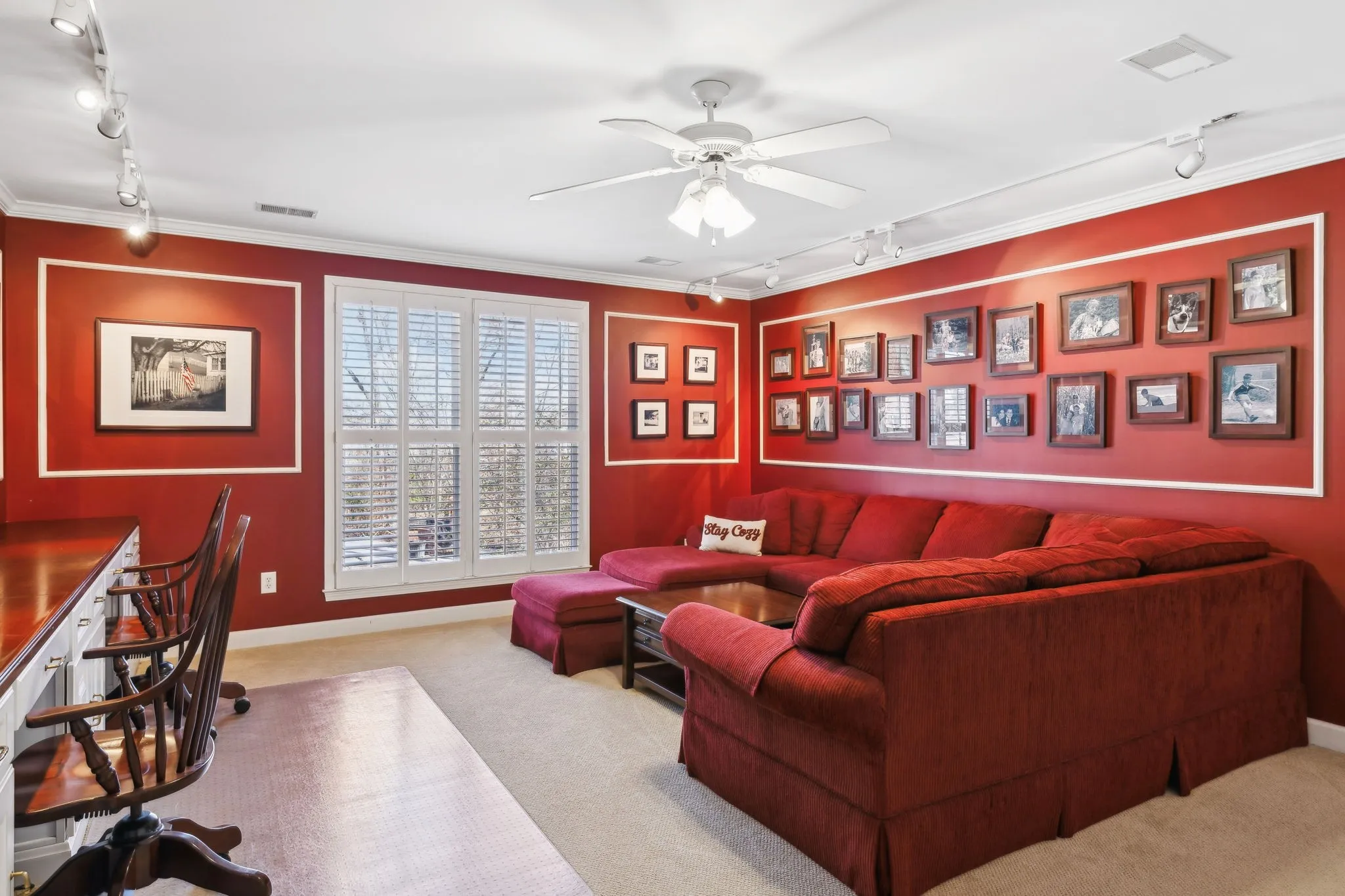 This beautiful home is on a cul-de-sac and has a large screened porch w/ mounted TV & flagstone patio to enjoy the beautiful treed backyard. There is a home office on the main level w/ double French doors & a large mounted TV. The primary suite has 2 closets and a large walk-in shower. The kitchen includes under cabinet lighting, a range w/double ovens, a double drawer dishwasher, microwave, and a new Samsung refrigerator. The kitchen opens to the great room with a gas fireplace, a large mounted TV, and has access to the 26 x 10 screened back porch. There is a large bonus room with a mounted TV, built-in cabinets & desk. Walk-out storage is located behind the laundry room. A whole house surge protector is included. The garage has insulated garage doors and a pedestrian door to the driveway. Some other included features are: a tankless water heater, programable thermostats, insulated clad windows, landscape lighting in the front yard, plantation shutters throughout the home, a new HVAC unit for the main floor, 6″ gutters & downspouts, and a transferrable GAF roof warranty. Kitchen table/chairs/barstools, Sofa & desk chairs in the bonus room, mounted TVs, patio furniture outside, and washer/ dryer are included with purchase unless the buyer wants them removed.