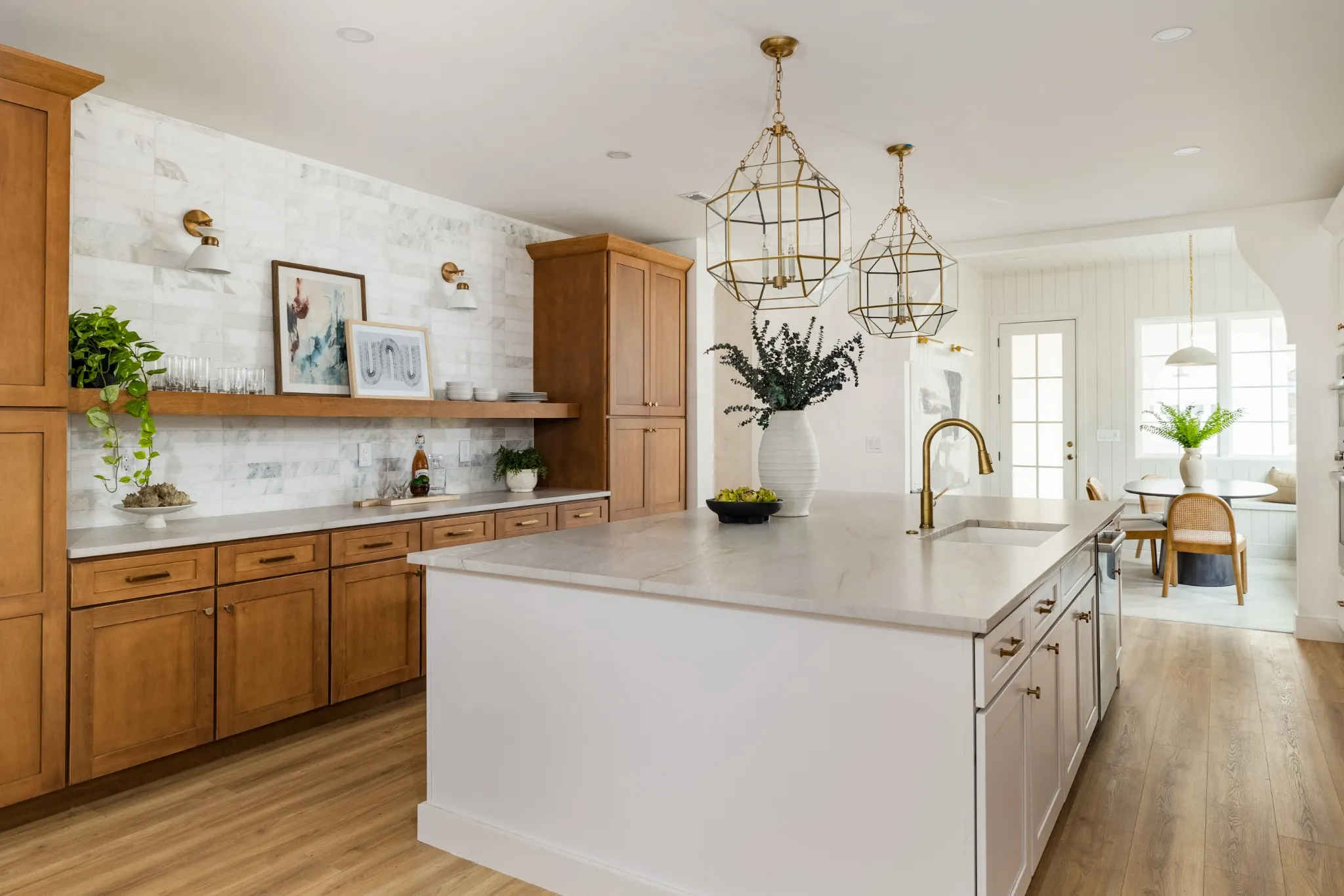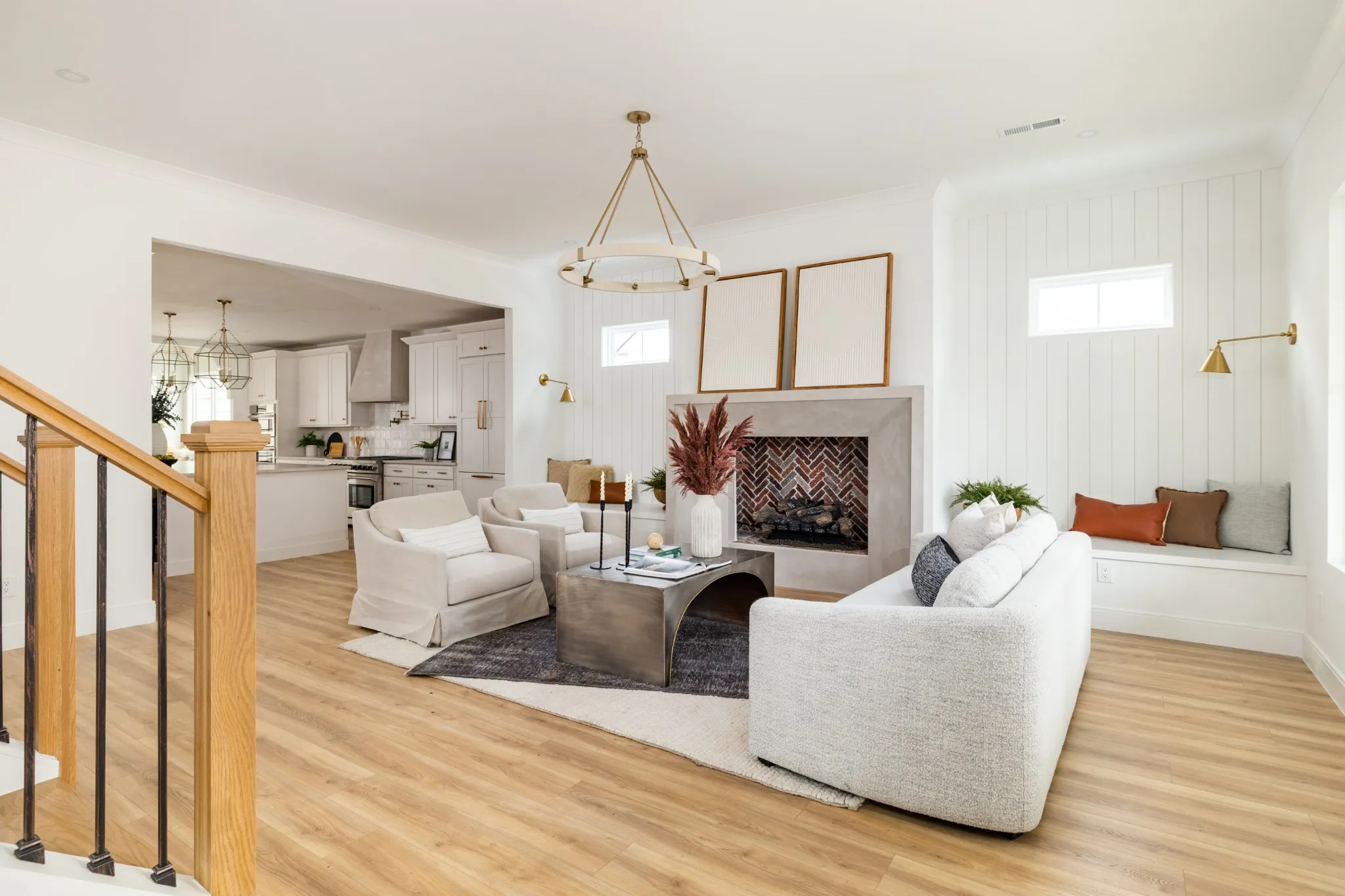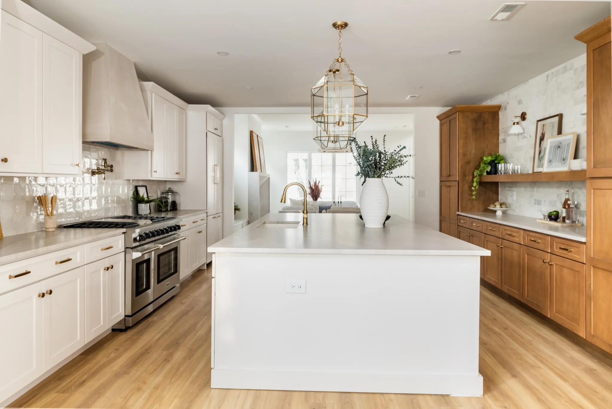 At its heart, the chef’s kitchen showcases high-end appliances, custom cabinetry, a striking culinary armoire, and an oversized island-ideal for everyday use and entertaining alike. The open-concept layout enhances the connection between living spaces.