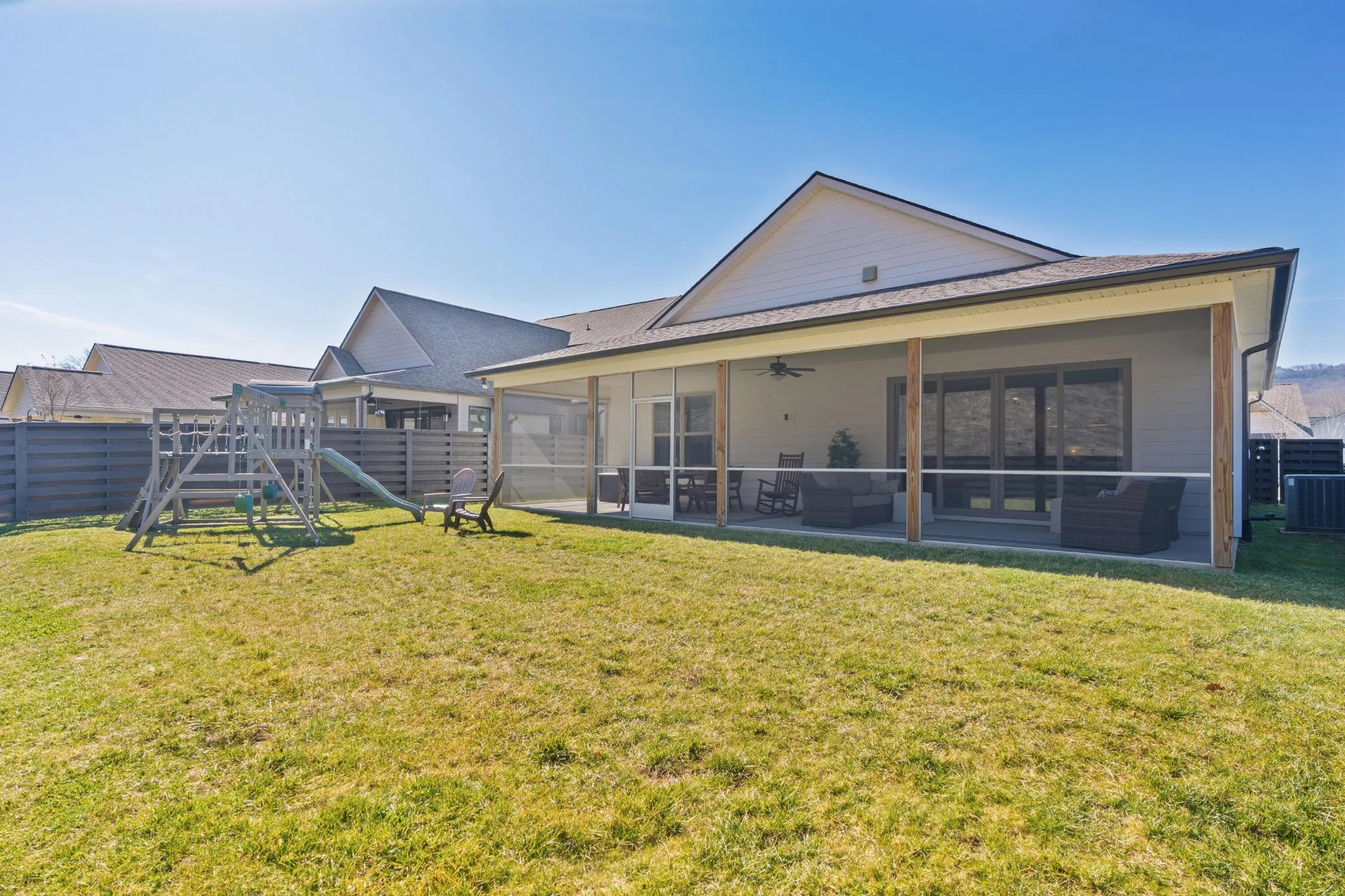 Fantastic floor plan, setting and amenities at this like-new 4 bedroom, 3 bath home in the desirable Painted Ridge neighborhood in north Red Bank just minutes to schools, the shopping and restaurants of the North Shore and Hixson, and a quick drive to downtown Chattanooga via I-27 or Dayton Blvd. This Hardie and brick, mostly one-level home boasts an open living concept, 3 of the bedrooms on the main including the primary suite, a screened in porch that spans the back of the house, a fenced yard and a double garage. The sellers are currently using the garage as a bonus/exercise room which is heated and cooled and has easy to install/remove carpet squares and a built-in storm shelter. Your tour of the interior begins with the dedicated foyer with two guest bedrooms and a full guest bath on the left and the laundry room and garage on the right. Next, you will find the gourmet kitchen which opens to the dining and the great room – a light-filled space enhanced by the large sliding glass doors to the screened porch and which provides a great flow for indoor to outdoor living and entertaining. The kitchen has a center island with quartz countertop, while the perimeter countertops are a nice contrasting granite with marble subway tile backsplash. It also has pendant lighting, soft close cabinetry, pendant and recessed lighting. The primary bedroom has a trey ceiling and double door entry to the primary bath with a dual quartz vanity, separate shower with tile and glass surround and a walk-in closet. The upper level has a large central bonus/playroom, a full bath, the 4th bedroom and walk-out attic storage. You will love the setting, as the house has a lovely ridge as the backdrop where you can walk the community hiking trails or head over to the neighborhood pool to enjoy the sunbathing platform and waterfall features as well as the pavilion with outdoor kitchen.