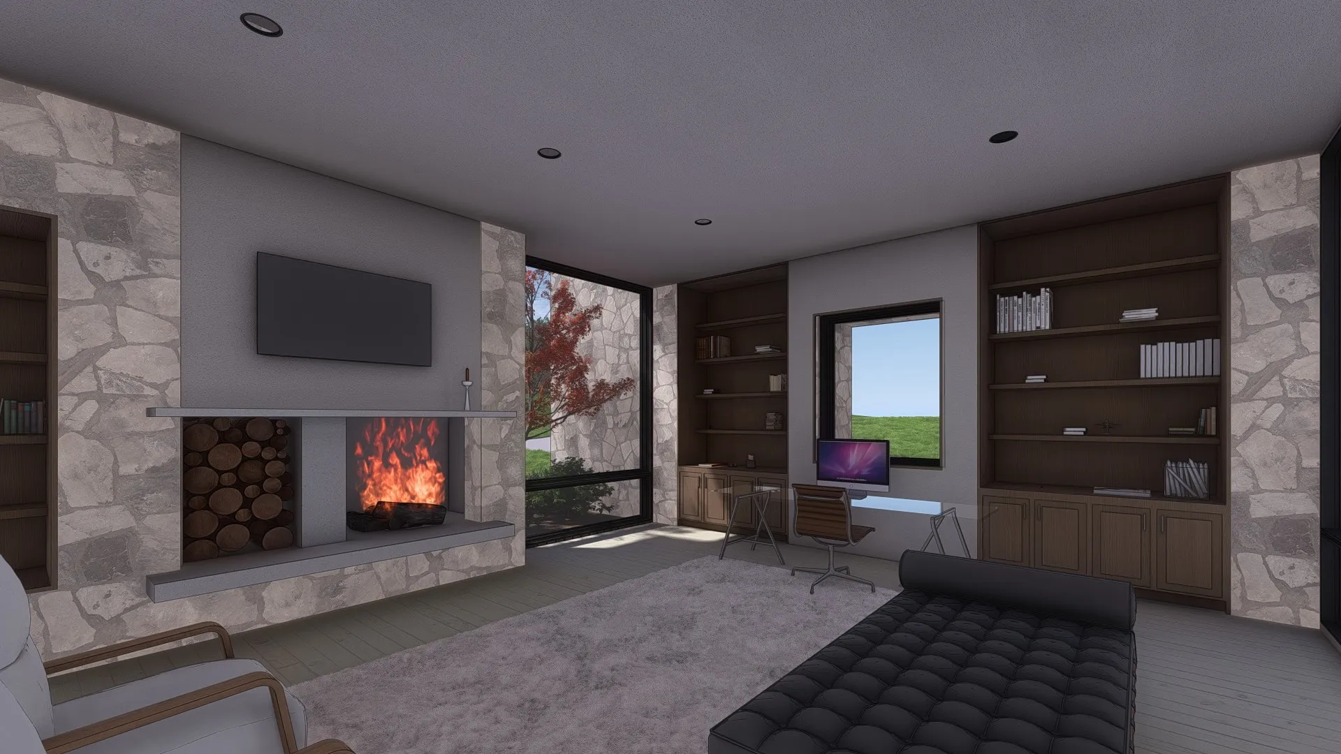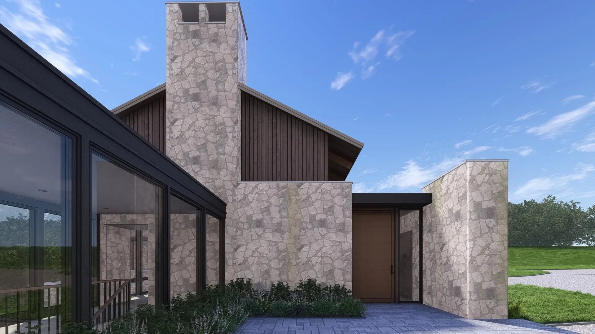 - Construction Materials: Wood Siding, Stone