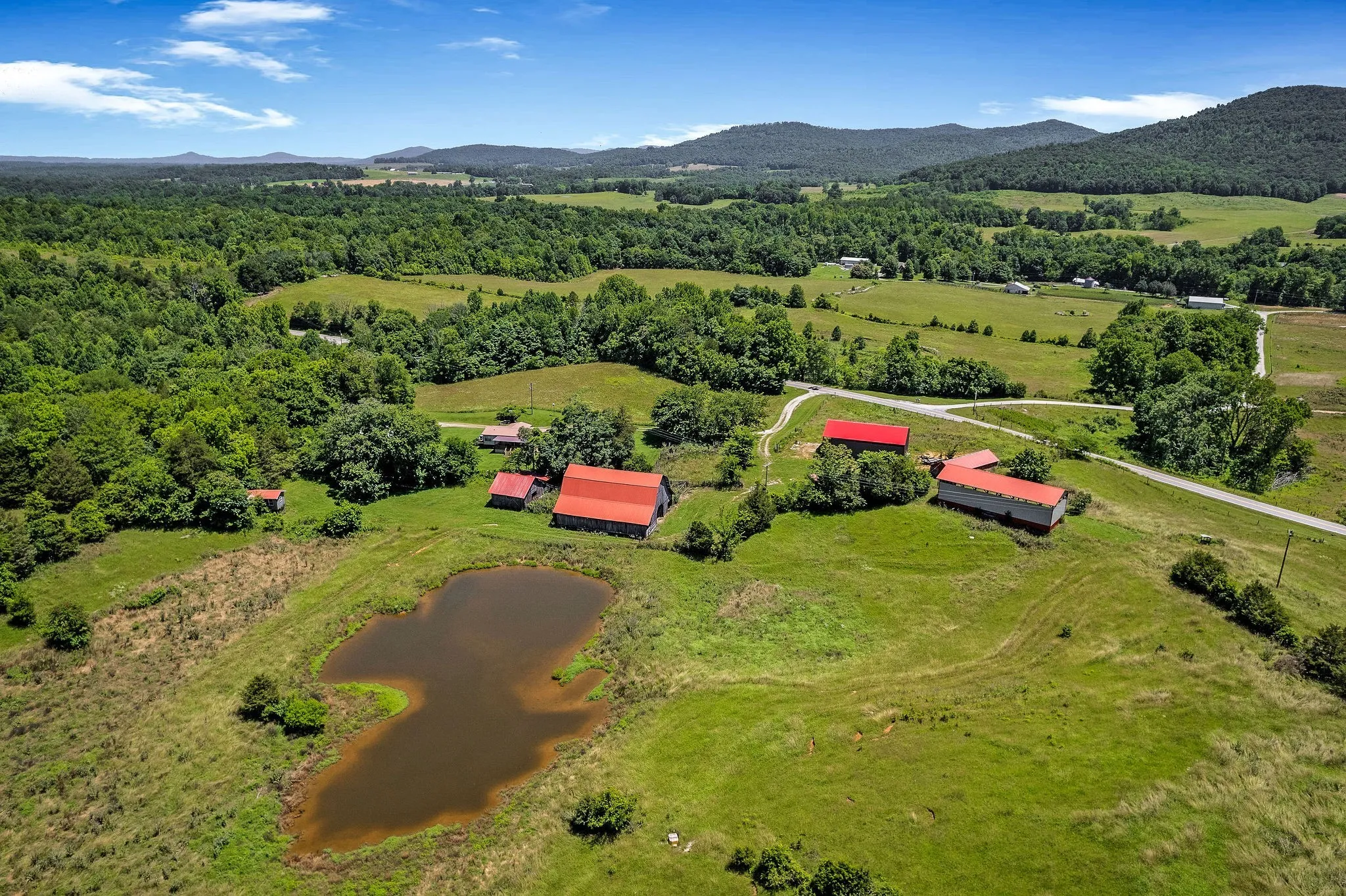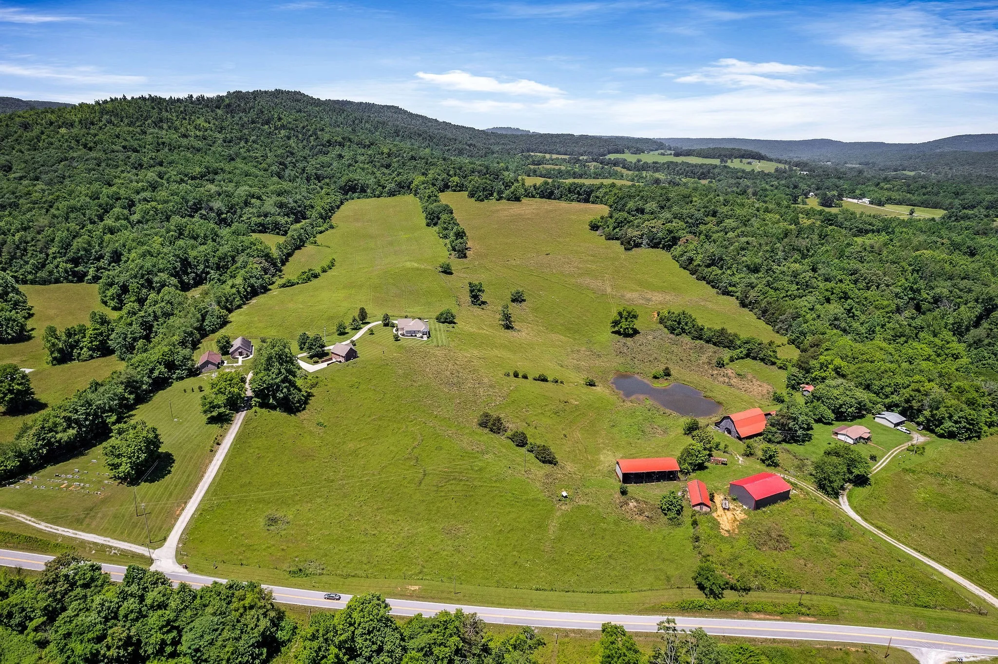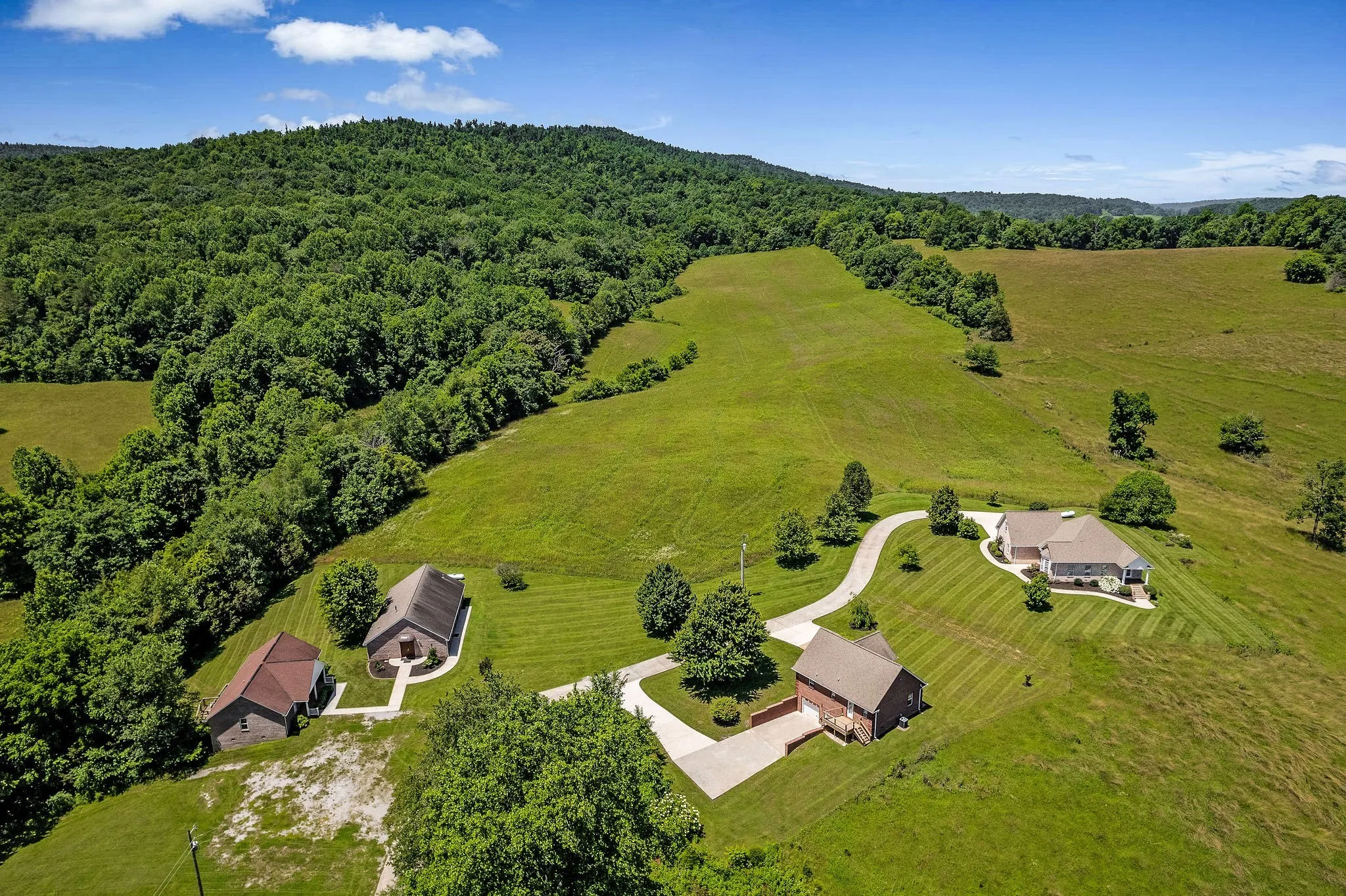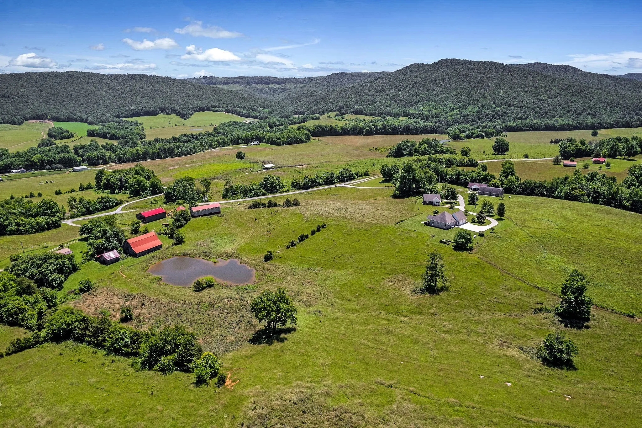 From a full scale hunting lodge to a homesteaders paradise, this 80 acre slice of paradise offers the unique opportunity for a generous farm that will build lasting memories for years to come! The incredible views of rolling pasture land is ready for cattle and the abundance of wildlife is a hunter’s dream! This property has two beautiful brick homes on the property, each with two bedrooms, nice amenities, great storage, and spectacular views. An additional 1br/1ba duplex on the property is perfect for rental income, airbnb, lodge guests or nonprofit housing. A gorgeous chapel on the property has wood inlaid ceilings, sourced right on the farm! With an industrial kitchen and bathrooms equipped to expand, this building could be multi use for venue space, recreation, or ministry. The property offers barns and storage buildings, a fully stocked pond, spring, and hardwoods. The possibilities are endless and an opportunity to own a true sanctuary like this rare!