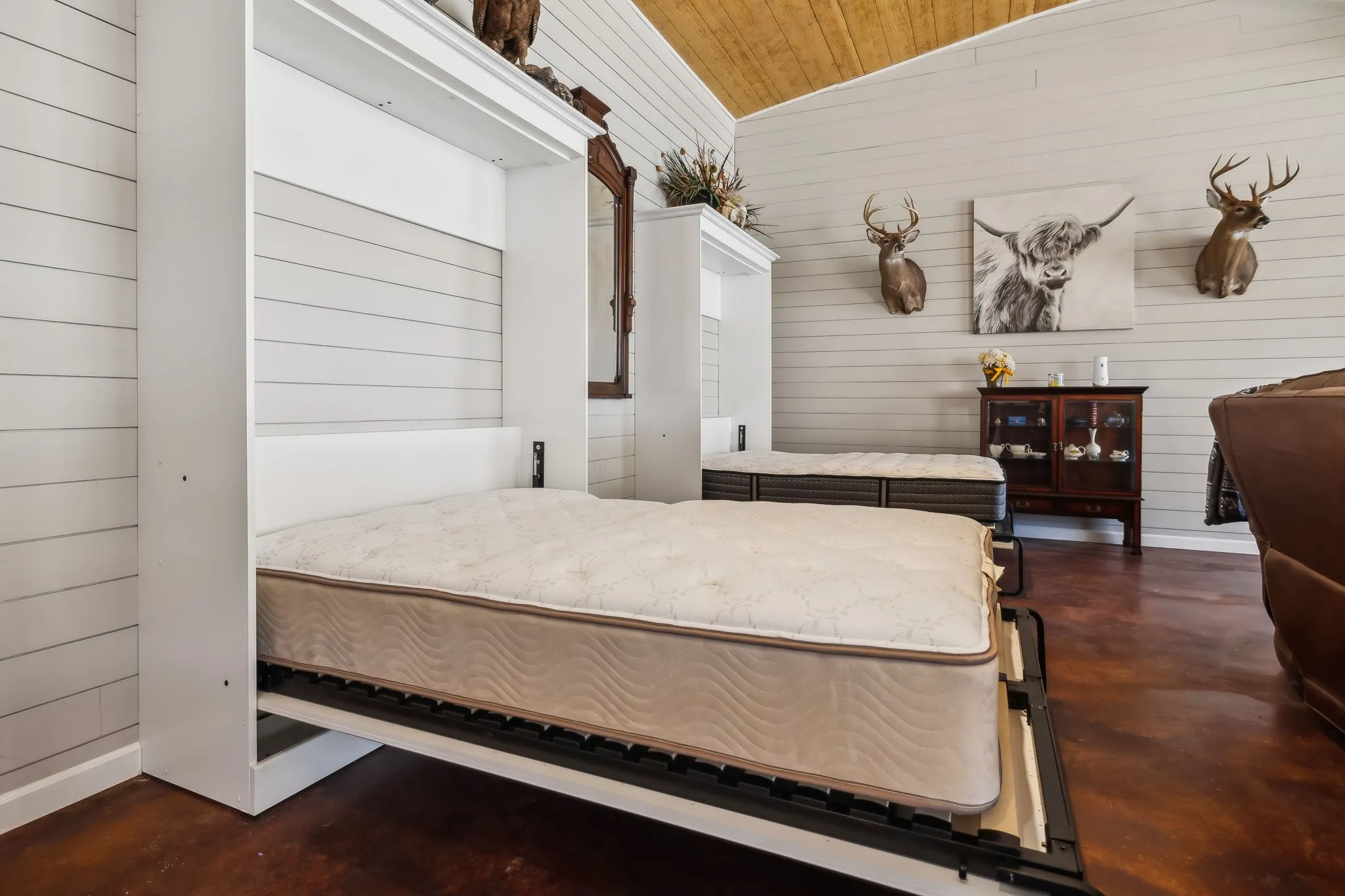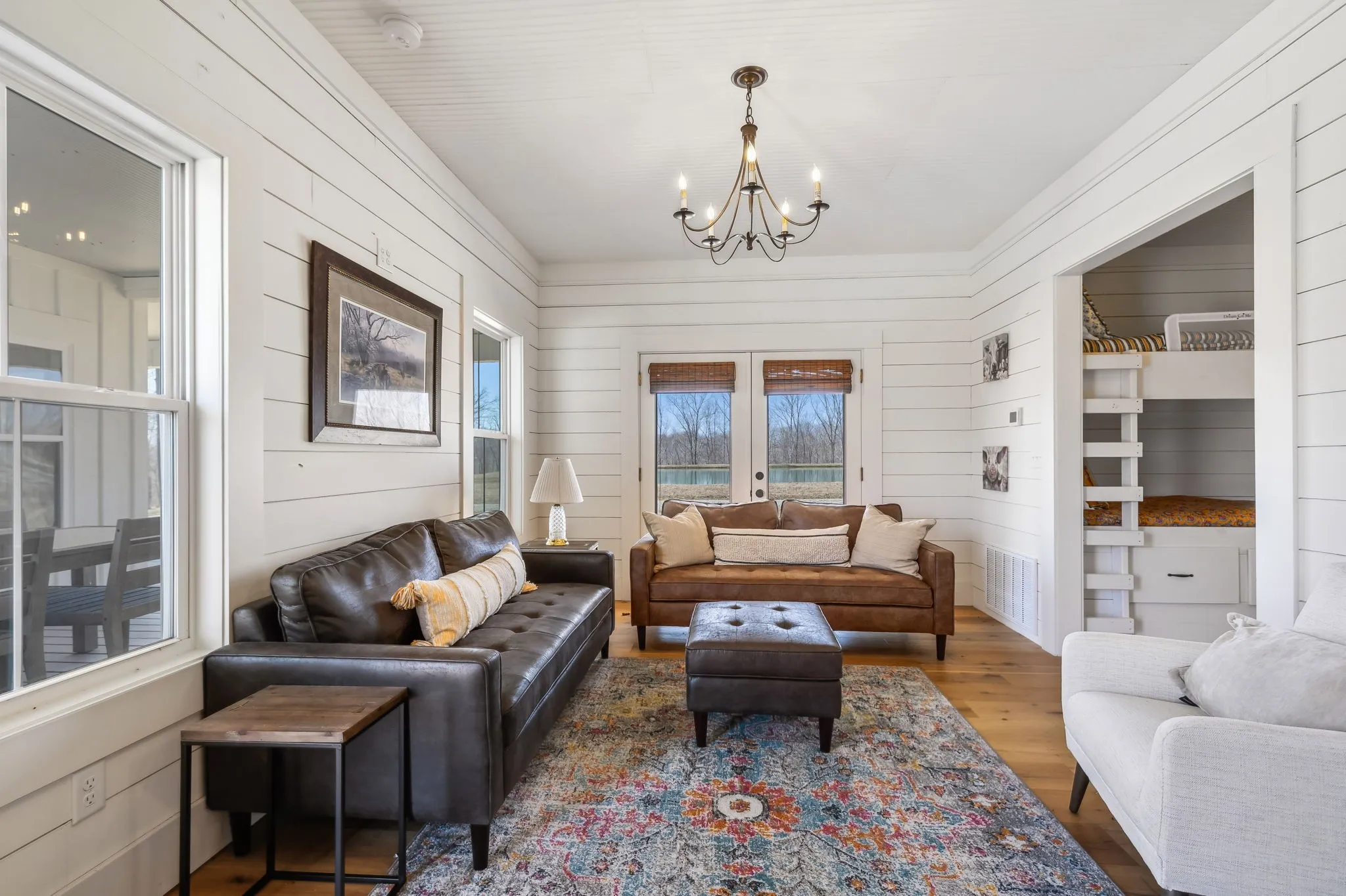 A charming dog-trot guest cabin provides ample accommodations, with two mirror-image living spaces. Each side includes a cozy living room, kitchenette, hall bunk beds, a spacious full bathroom, and a large bedroom—perfect for guests, renters, or a creative retreat.\n