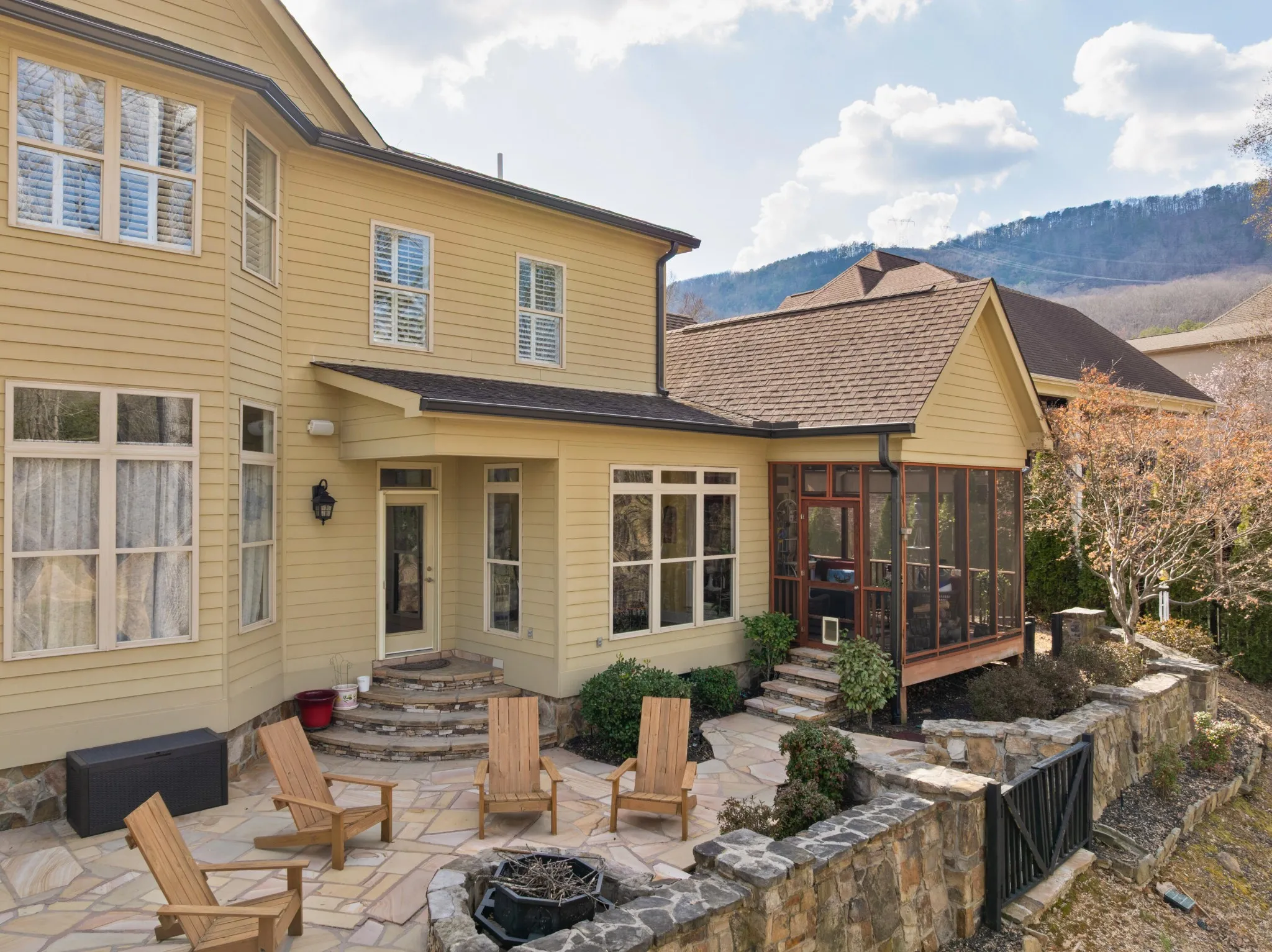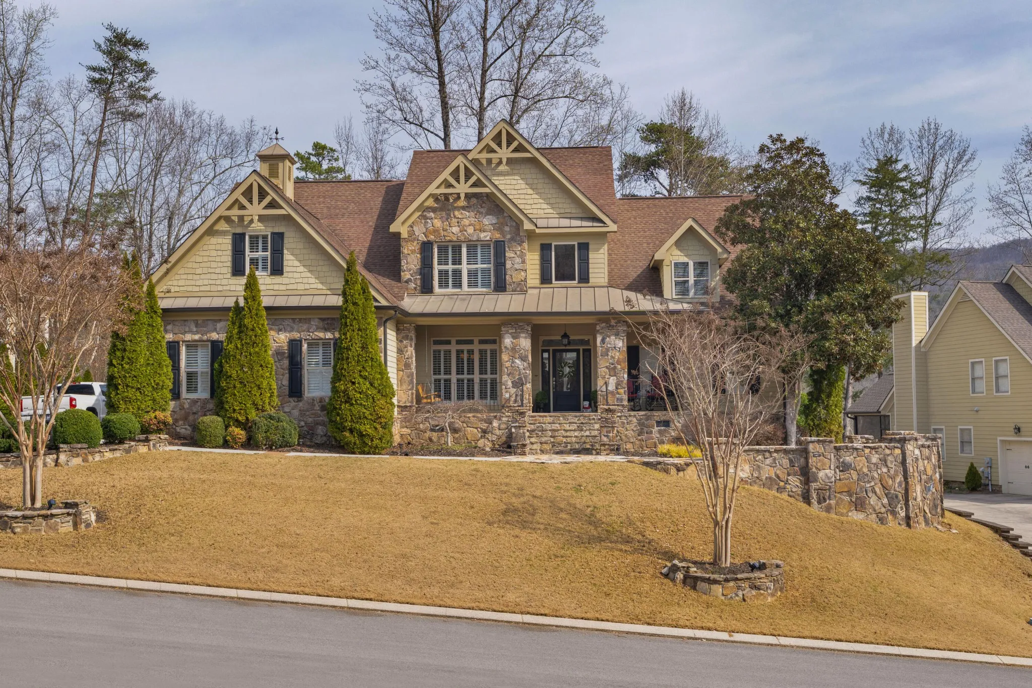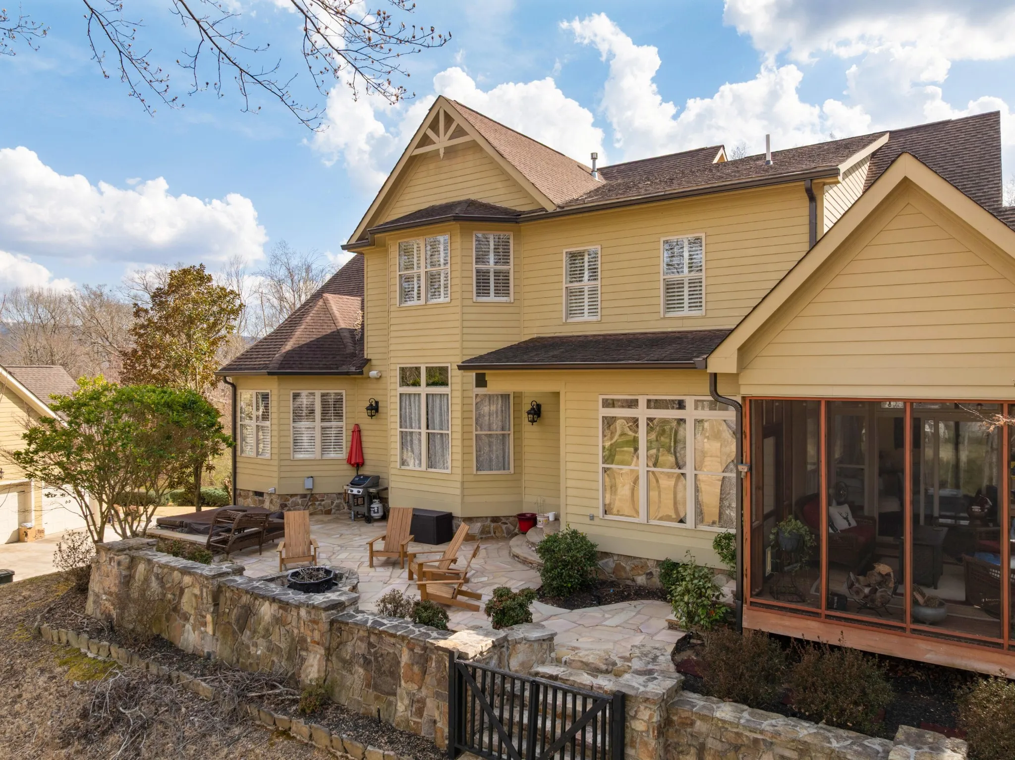 4 bedroom, 3 full and 2 half bath home overlooking the 2nd and 3rd greens in the Black Creek golf course community approximately 15 minutes from downtown Chattanooga. This craftsman style home exudes curb appeal with its Hardie and stone exterior and fantastic outdoor living spaces, and you will love the versatile floor plan and quality amenities, including the hardwood floors, granite countertops, multiple built-ins, specialty ceilings, crown moldings, open living area, primary on the main, great storage, 3 garage bays, 2 outdoor firepits and more. Entry to the home is via the covered front porch with beautiful flagstone patio and walkways. The 2-story foyer opens to the formal dining room and great room beyond. The great room has a coffered ceiling, gas fireplace with built-ins on either side and easy access to the powder room. This room adjoins the kitchen which is open to the breakfast and keeping rooms and enjoys wonderful natural lighting and views of the golf course. The kitchen is well-appointed and also has a coffered ceiling, a center island with a raised dining bar, travertine tile backsplash, pantry and stainless appliances including a new refrigerator, a gas cooktop, stacked wall oven and microwave and access to the rear patio. The keeping room has a vaulted ceiling, gas fireplace and sliding glass door to the screened in porch providing a nice flow for everyday living and entertaining. The primary bedroom is on the opposite side of the house and has a trey ceiling, room for a desk or sitting area, and the primary bath with dual vanity, jetted tub, separate shower with tile and glass surround and a walk-in closet with organizer system. The upper level has one bedroom with a private bath, and a shared bath with separate vanities that adjoins a bedroom and bonus room on one side and the 4th bedroom on the other. There is also a raised family room with a built-in in beverage center and a half bath, as well as wonderful walk-out attic storage.