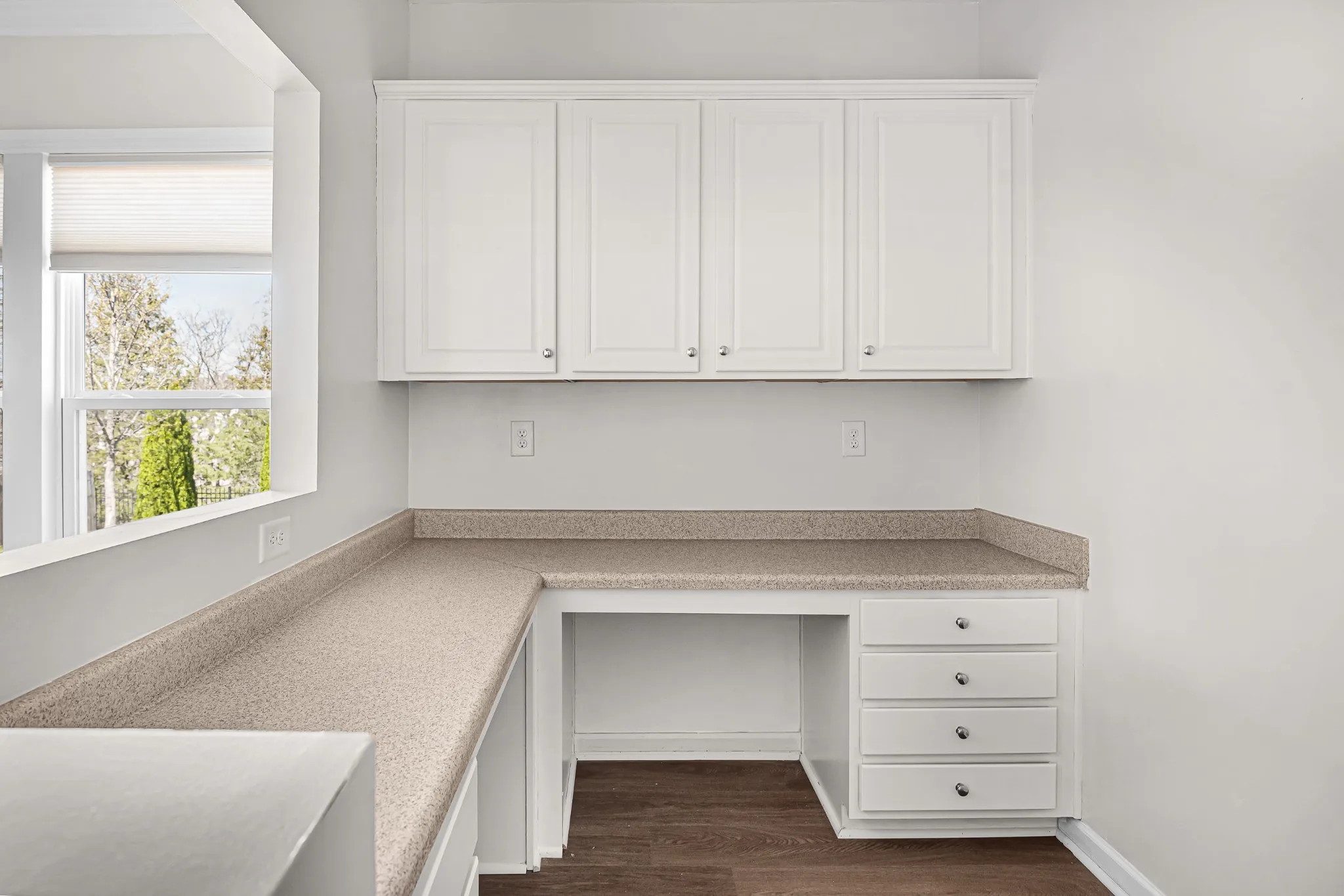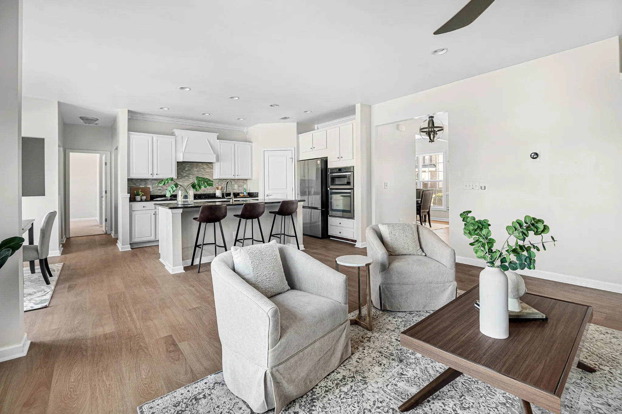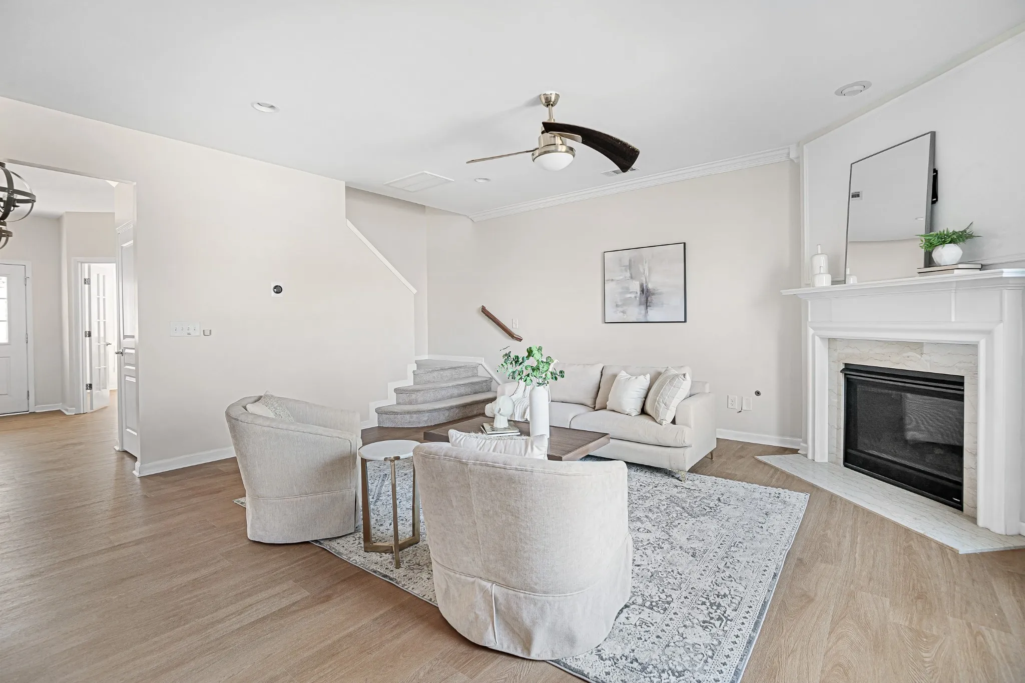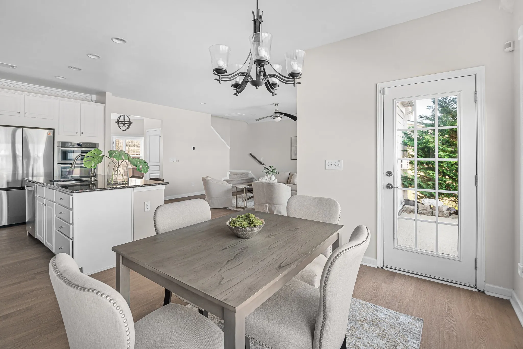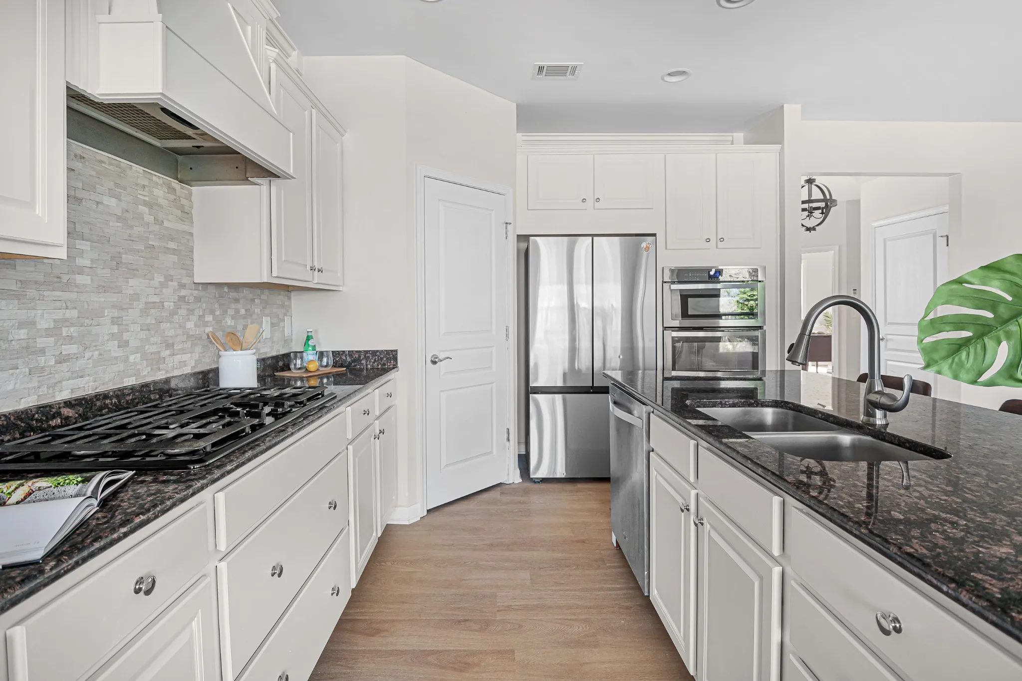 Stunning all-brick five-bedroom home with modern upgrades. This beautifully upgraded five-bedroom, three-and-a-half-bathroom home offers a perfect blend of elegance, comfort, and functionality. Featuring brand-new French Oak LVP flooring throughout the main level and fresh paint across the entire home, this residence is move-in ready. The main level includes a private office space with French doors, a formal dining area perfect for gatherings, a spacious guest bedroom, and an expansive living room with a cozy gas fireplace. The upgraded kitchen features stunning marble countertops, a stone backsplash, and an additional office nook. The second level boasts a luxurious primary suite with a custom walk-in closet and double vanities in the primary bathroom for added convenience. There are three additional bedrooms, a full bath, and a versatile rec room for entertainment, play, or fitness. The spacious and beautiful backyard offers a serene retreat, with a tree line that creates the feeling of being backed up to the woods. This peaceful outdoor space is perfect for relaxation, entertaining, or simply enjoying the natural surroundings.
