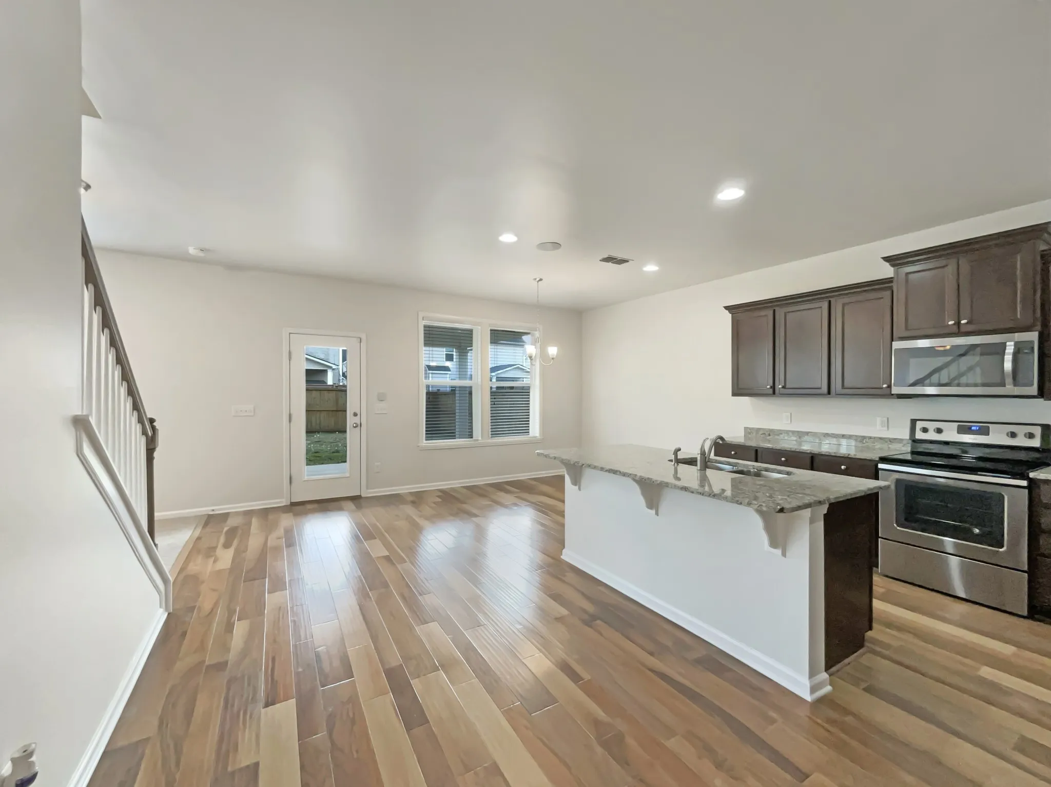 main level. The gourmet kitchen is equipped with granite countertops and stainless steel