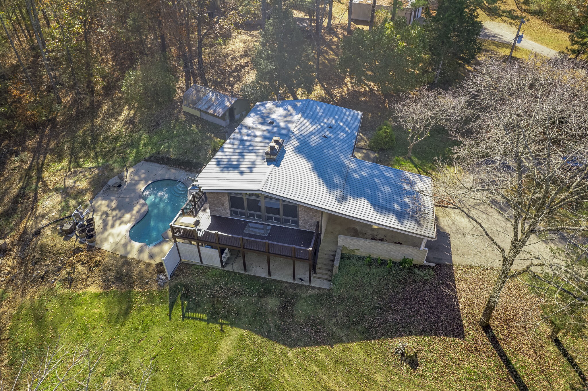 This amazing property has it all. 10.47 beautiful private acres (great for horses), nicely remodeled house with 3BR/2BA, Primary BR on main level, two BRs lower level, Gunite kidney shaped inground pool, large shop, small barn, small greenhouse, paved circular driveway, 2-car carport, wrap around decking, wrap around patio, small pond at the entrance. Great location only one mile from I-40 makes commuting to Nashville and surrounding communities very convenient. Connected to AT&T internet. Comcast is available now.