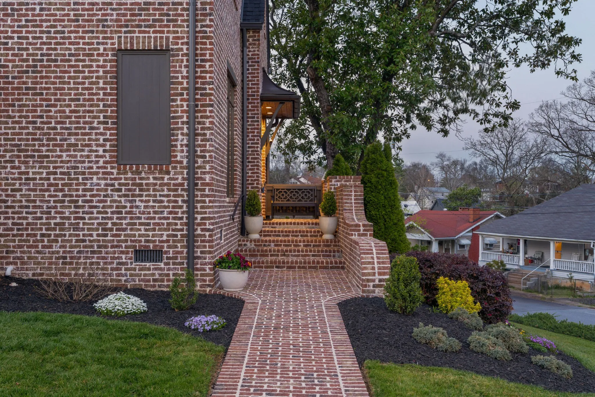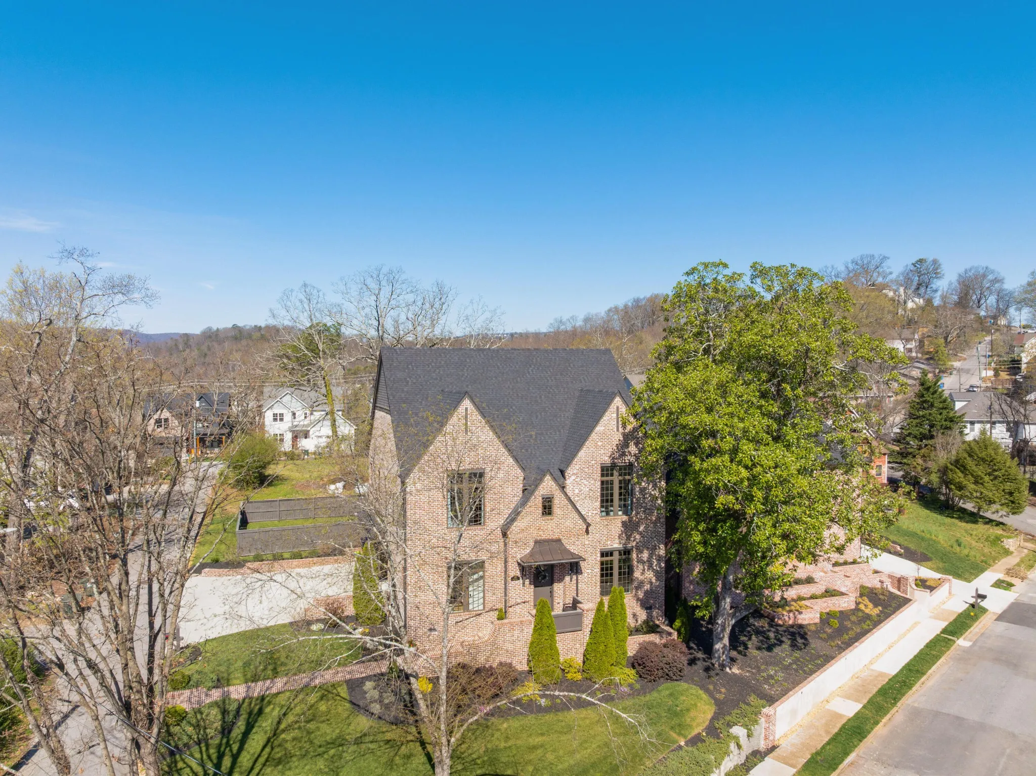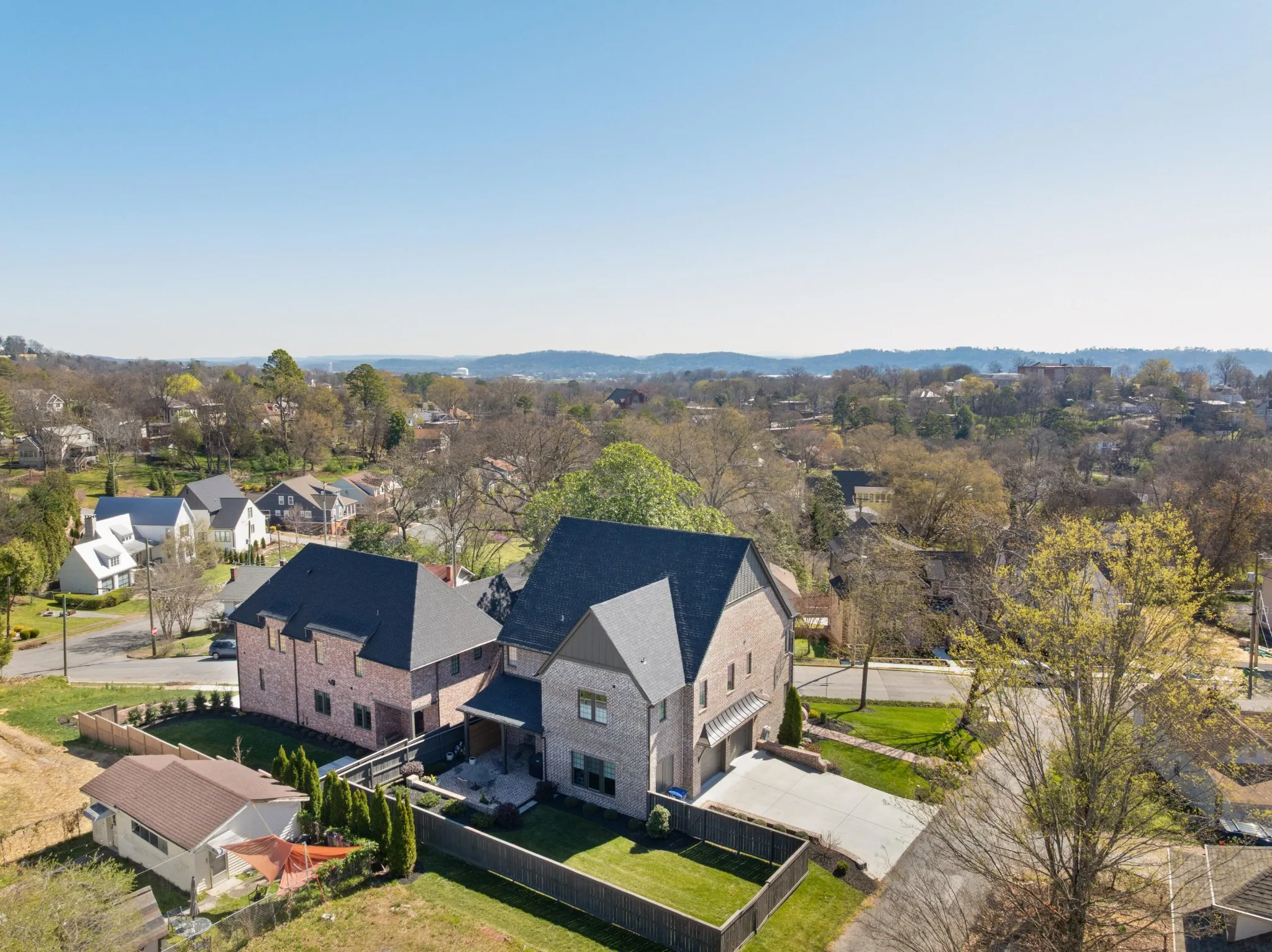 Custom built by Waters Holland in 2021, this like-new all brick, 4 bedroom, 4 bath home is truly a testament to quality design, construction and function. Located on a corner lot in the heart of North Chattanooga just minutes from schools, parks, shopping, restaurants, medical facilities and our urban center, this home will appeal on all levels. Some of the notable features include hardwoods and tile throughout, crown moldings, an open floor plan, decorative and recessed lighting, closet systems, a guest bedroom on the main, 10 foot ceilings on the main and 9 – 12 foots ceilings on the upper level, versatile bonus rooms, beautiful oversized clad windows, custom windows treatments, 2 garage bays, great outdoor living spaces and a fenced back yard – just to name a few. The living room has a beamed ceiling and a gas fireplace and flows seamlessly to the dining area and kitchen beyond. The kitchen will delight the home-chefs with its large center island with pendant lighting, quartz countertops, tile backsplash, under-cabinet lighting and stainless Bosch appliances, including a gas cooktop and double wall ovens. The kitchen also adjoins a rear butler’s pantry with wine/beverage fridge and access to the rear covered patio, as well as the garage for easy loading and unloading. Just off the butler’s pantry, you will find a spacious exercise room, while the guest bedroom and full guest bath are on the front side off of the foyer. There are 3 additional en suite bedrooms on the upper level, including the primary bedroom which boasts two walk-in closets with organizer systems and the primary bath with separate marble vanities, shower with tile and glass surround, a linen closet and a private water closet. A central bonus room has a double-door entry with a smaller adjoining bonus room that could easily be utilized as a 5th bedroom if desired.