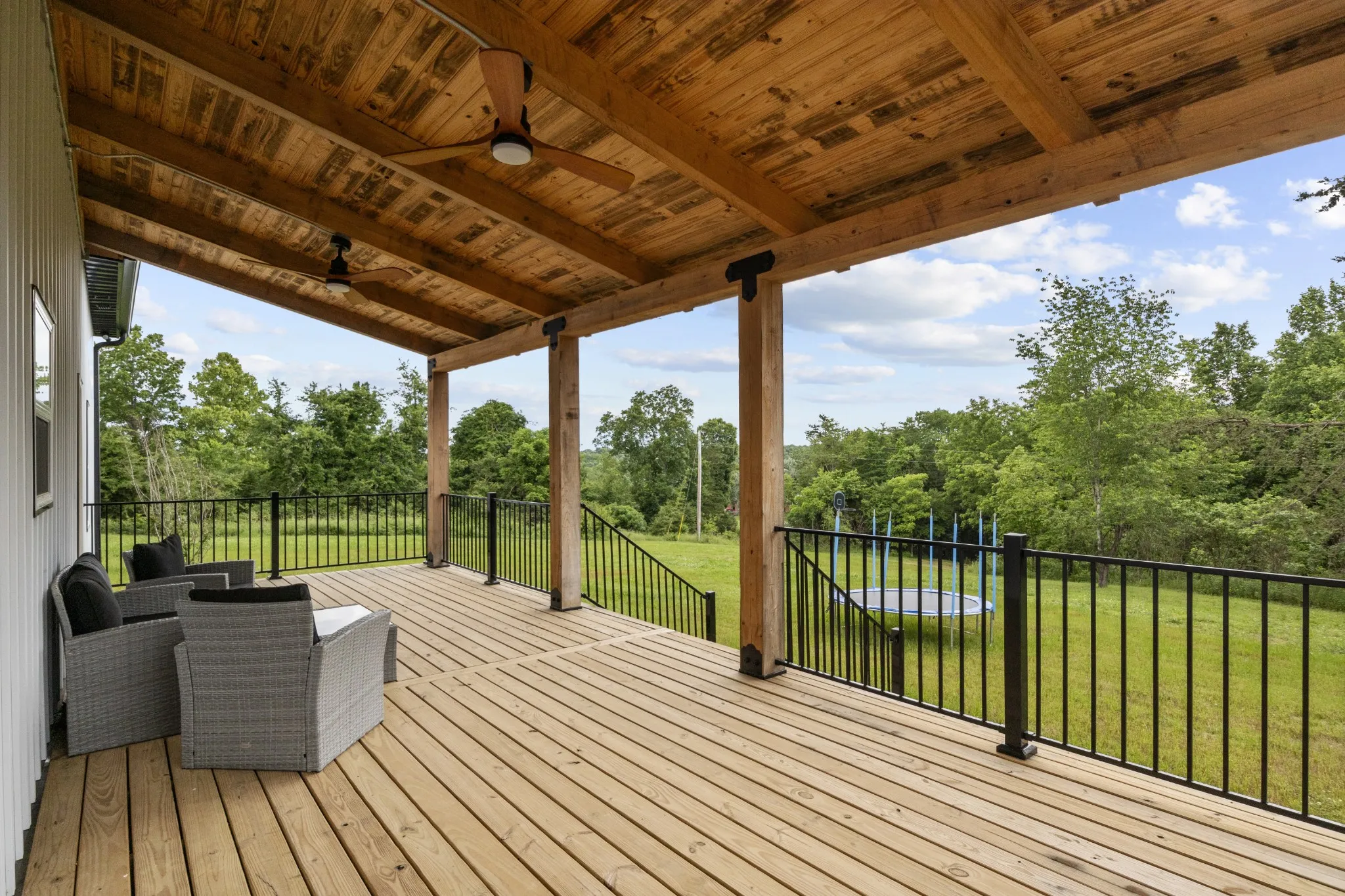 "LongDescription" => "The covered back deck features 2 ceiling fans, black metal railings, and a wide stair case to the backyard."