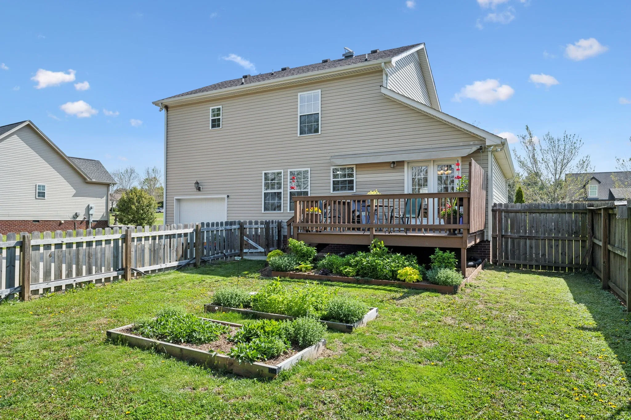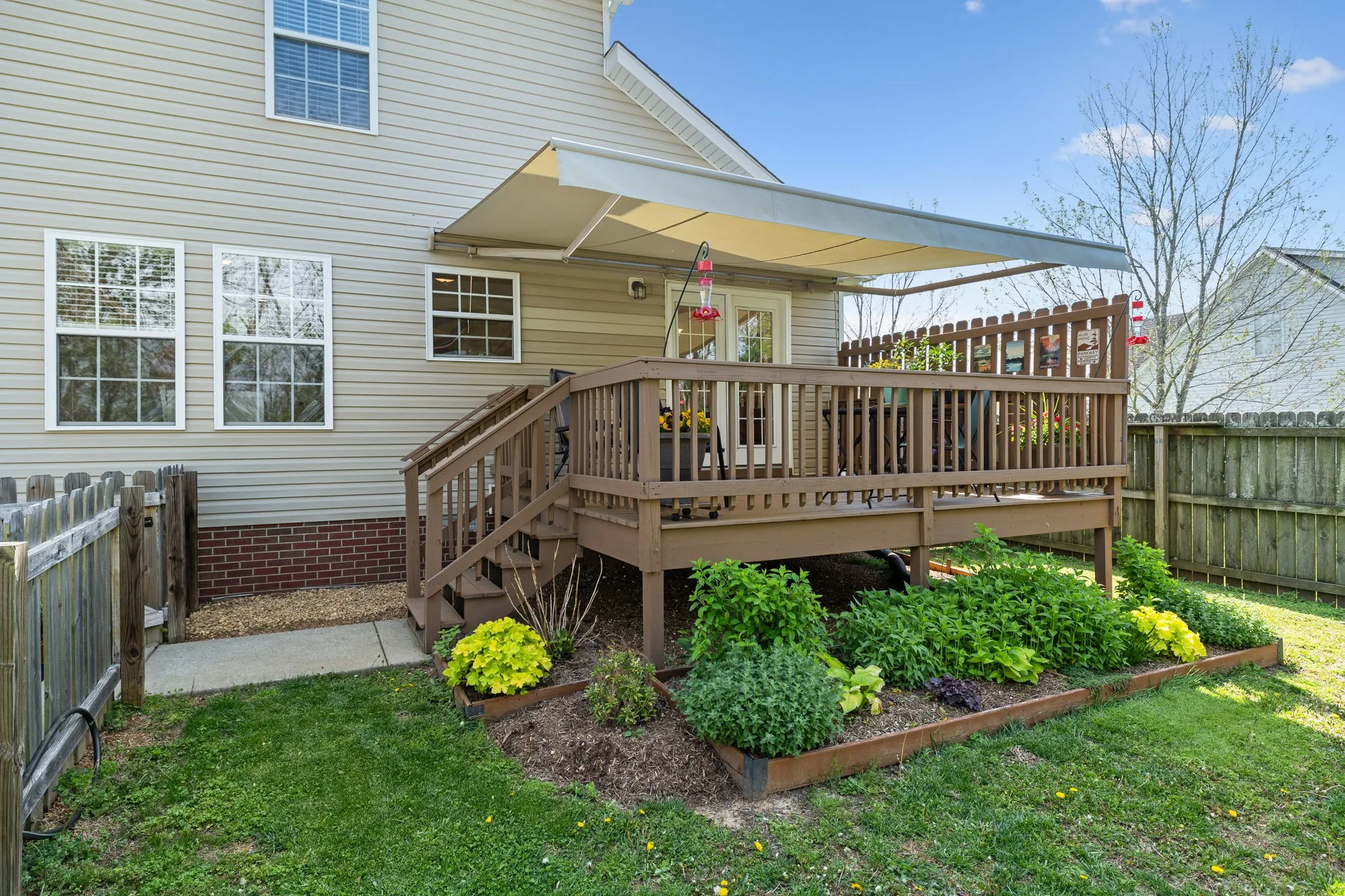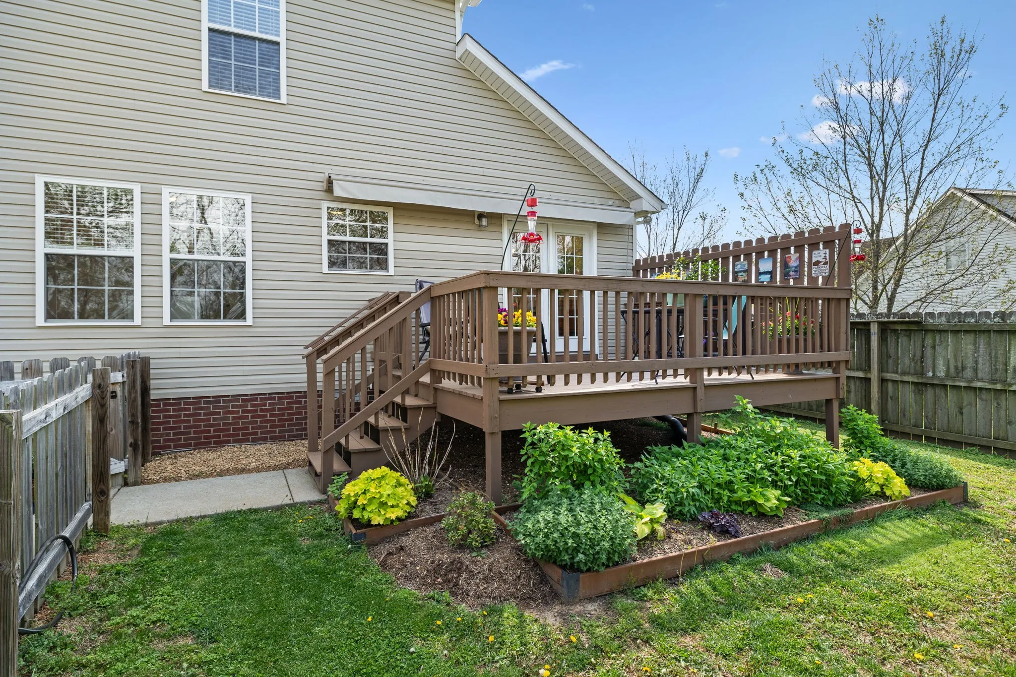 Privacy! NO BACK YARD NEIGHBORS! Located in a great subdivision~with an easy drive to the interstate~ this home has been well maintained and has some outdoor features that is sure to bring out the gardener in you~With easy to maintain hardwood floors you will walk right into a fresh feel~all appliances remain (washer and dryer only 2 years old) and the pantry is a bonus for all those canned vegetables~The closet space in the bedroom~the newer deck leads you to the private fenced back yard where you will find raised flower and vegetable garden beds and several pollinator plants~an interior fire suppression system which will lower your home insurance costs~a garage with hanging storage and extra parking at the driveway