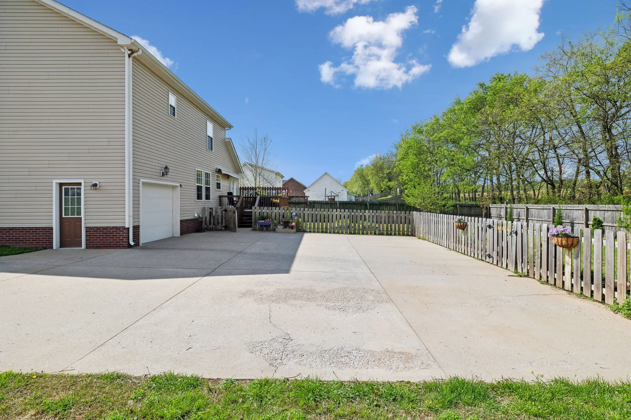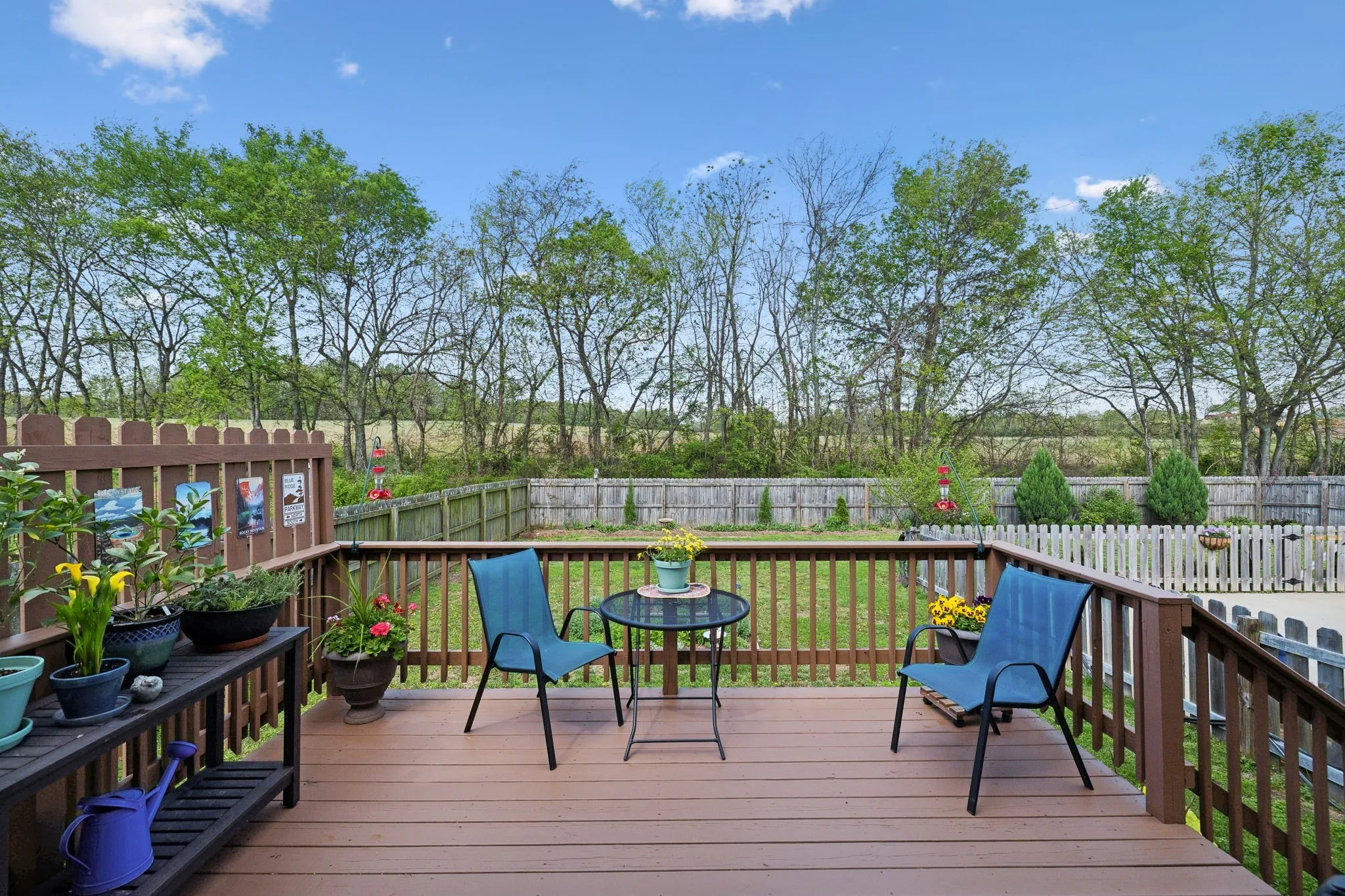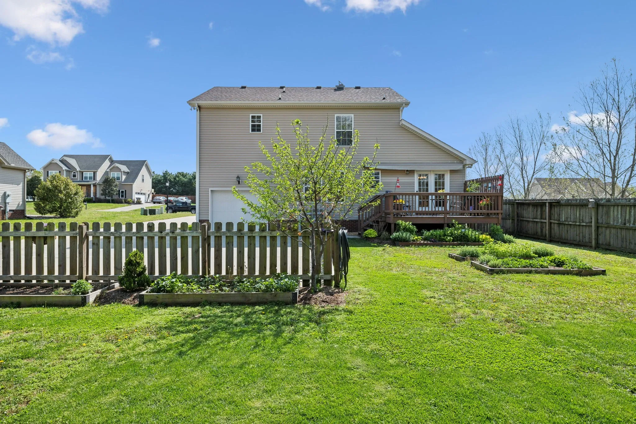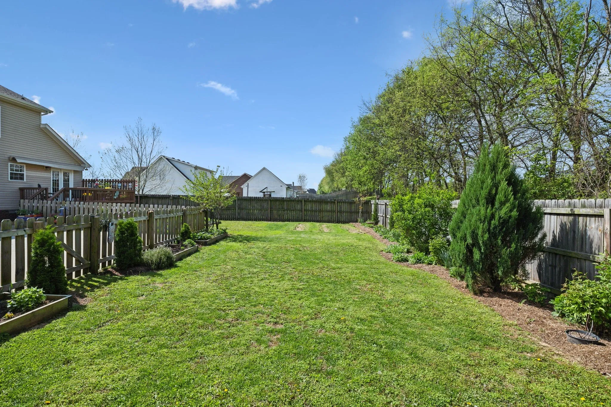 Privacy! NO BACK YARD NEIGHBORS! Located in a great subdivision~with an easy drive to the interstate~ this home has been well maintained and has some outdoor features that is sure to bring out the gardener in you~With easy to maintain hardwood floors you will walk right into a fresh feel~all appliances remain (washer and dryer only 2 years old) and the pantry is a bonus for all those canned vegetables~The closet space in the bedroom~the newer deck leads you to the private fenced back yard where you will find raised flower and vegetable garden beds and several pollinator plants~an interior fire suppression system which will lower your home insurance costs~a garage with hanging storage and extra parking at the driveway