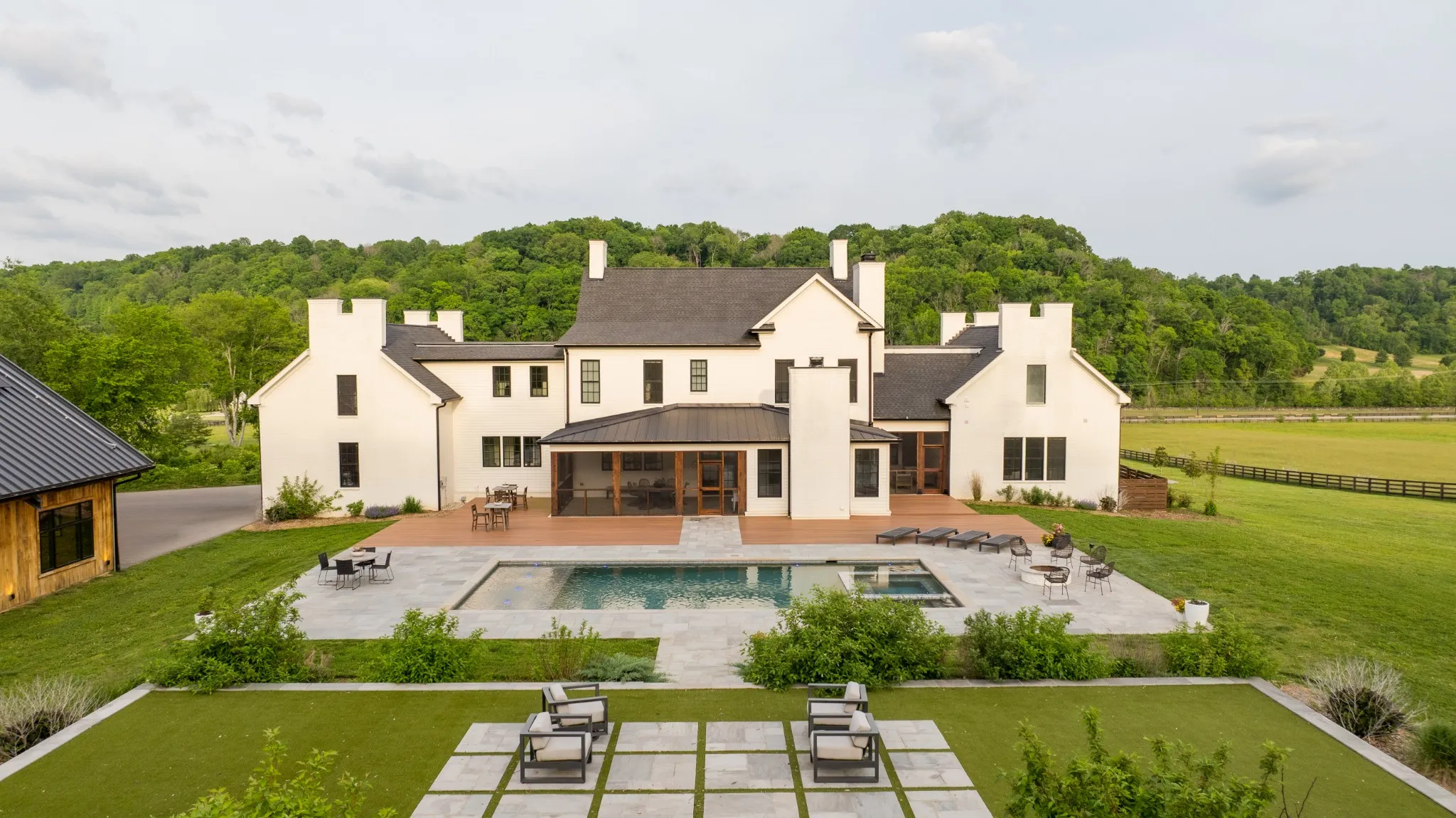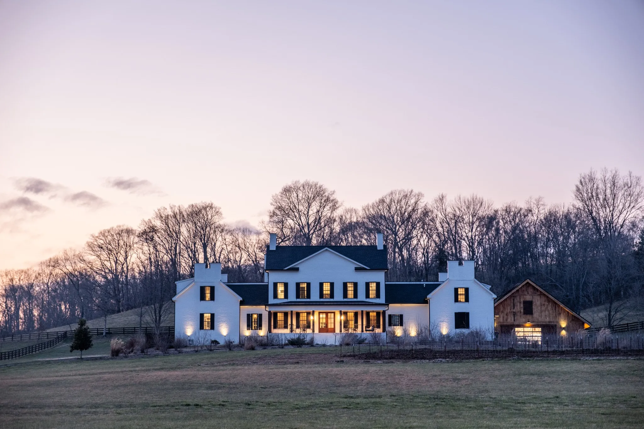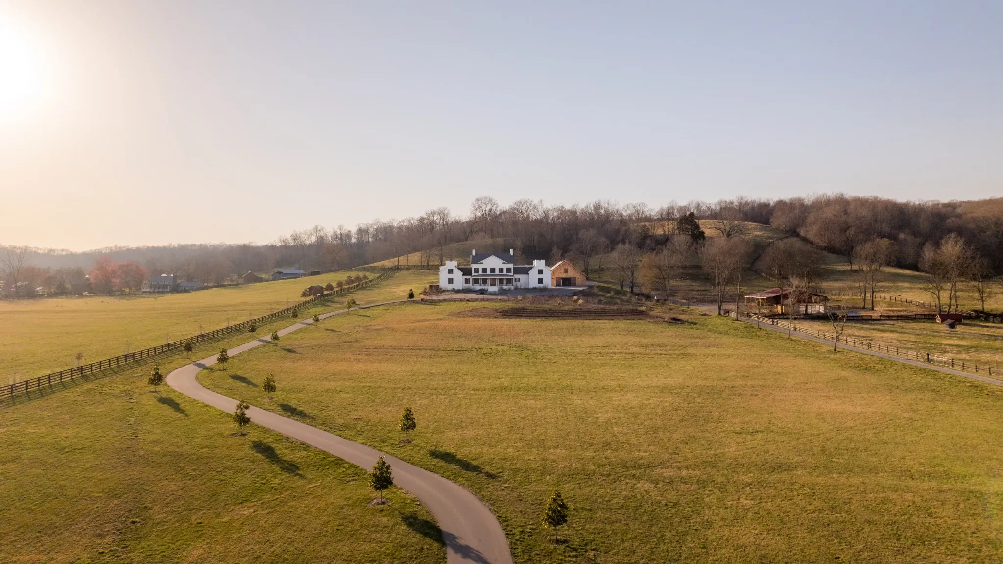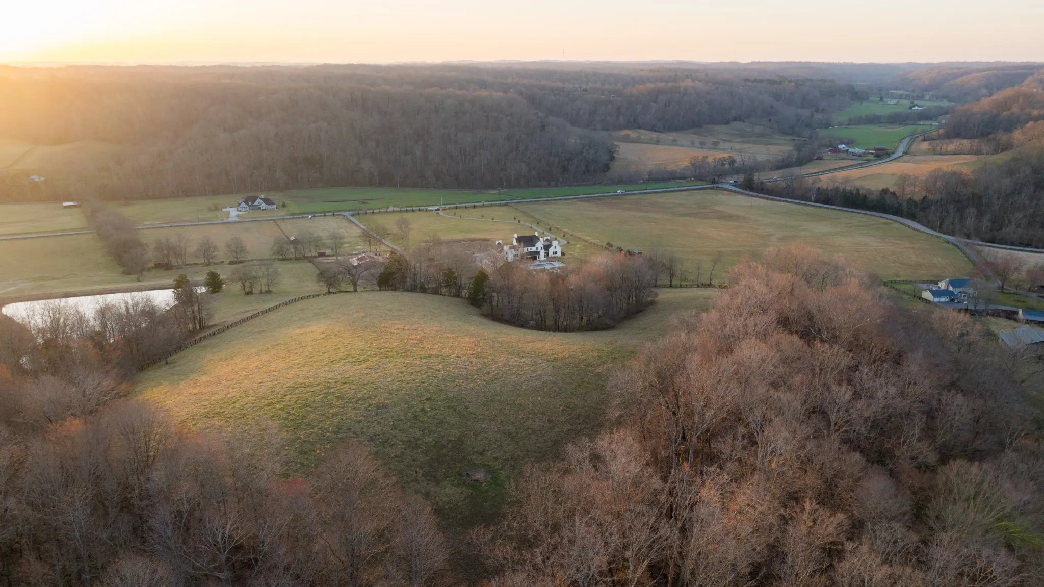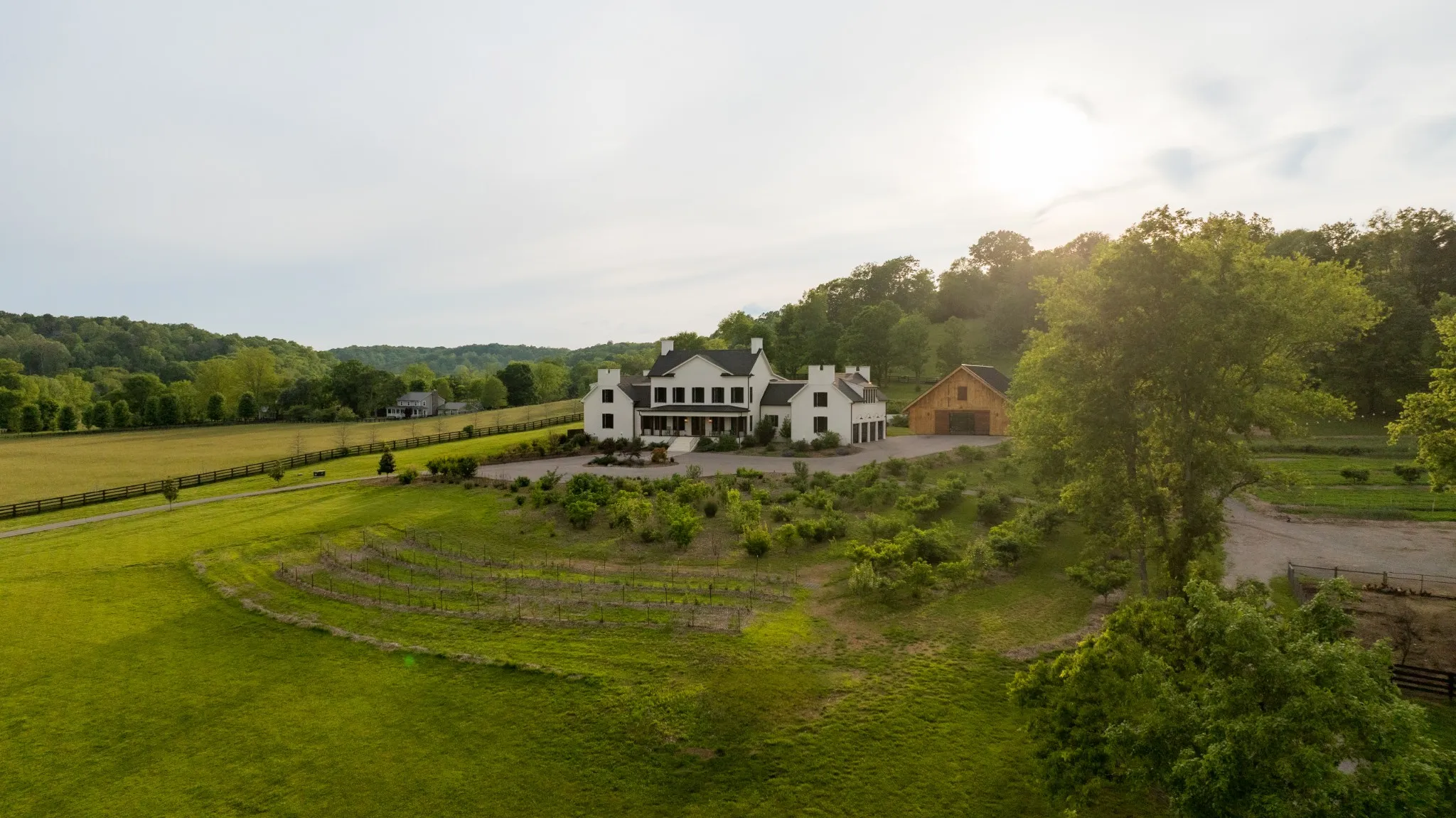 An exceptional 25-acre organic regenerative farm nestled in the heart of Leipers Fork, Tennessee. This rare estate features a sprawling 8,091 sq ft farmhouse with primary suites on the first and second floor. Three additional bedrooms on 2nd floor all with en suite and room currently used as an office with en suite. Large bonus room wired for an overhead projector. Custom climate controlled car barn with glass writing studio overlooking car collection. Front porch sunrise views and rear sunset views from screen porch and sunroom across the pool and spa. Primary suite on first floor has a second private screen porch with fireplace. Additional hilltop build sites with breathtaking views. This self-sufficient regenerative farm is equipped with well water and solar power, ensuring a sustainable, eco-friendly lifestyle. The farm is fenced and cross fenced providing multiple pastures for livestock along with an agriculture barn, multiple run-in sheds and a chicken/duck coop. There are 200 fruit trees and gardens to feed 20 families. 13 acres are run with invisible fencing for dogs. This property offers the rare combination of luxury living, organic farming, and endless possibilities for expansion, set in the picturesque countryside of Leipers Fork and close to modern amenities.