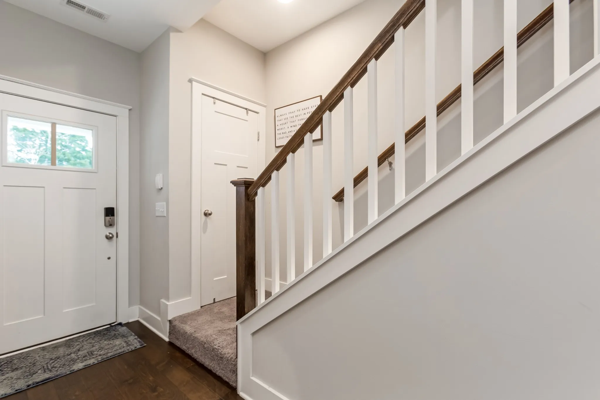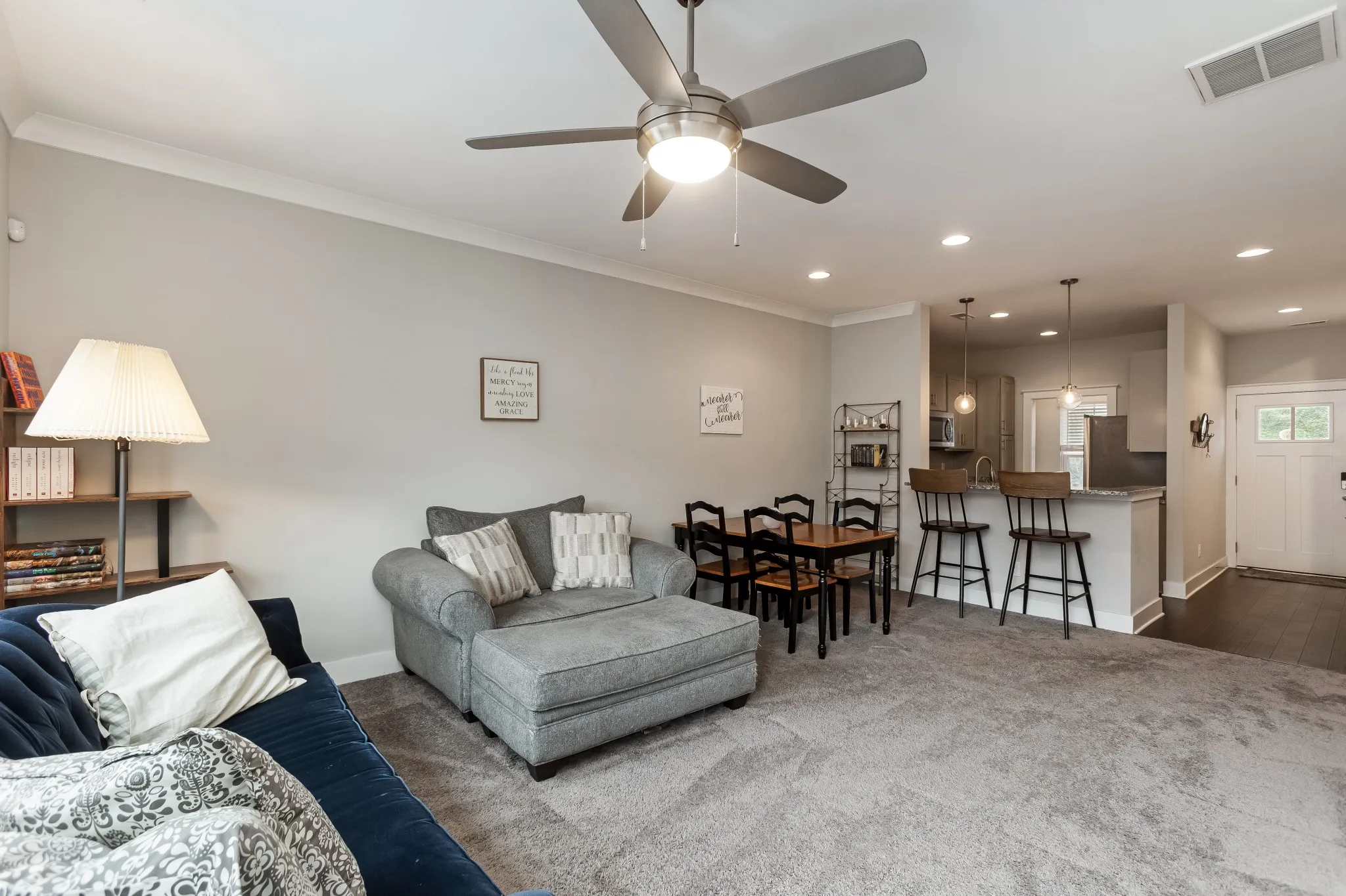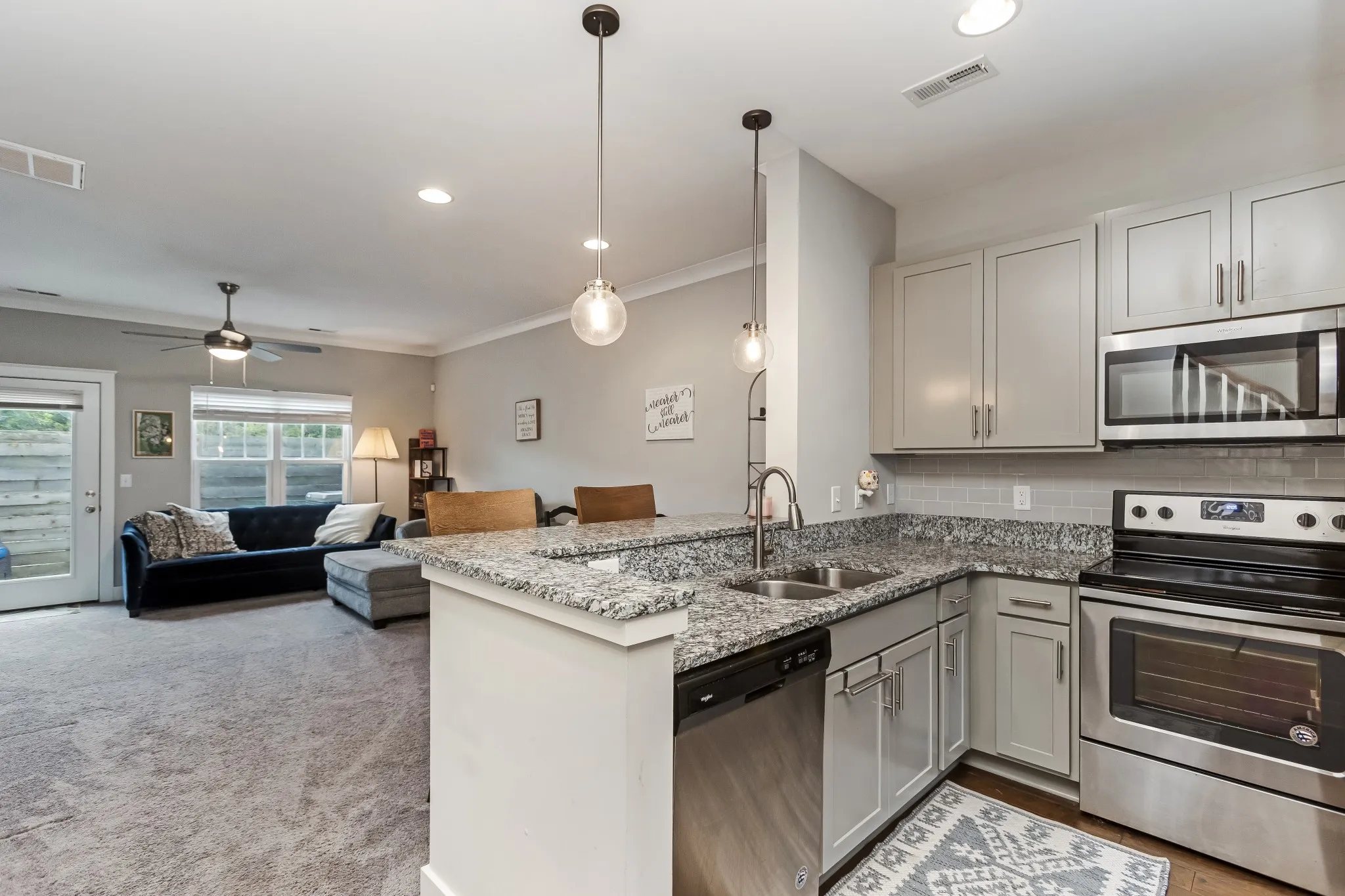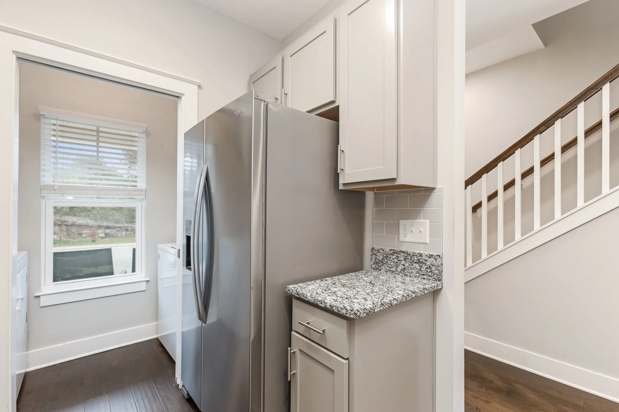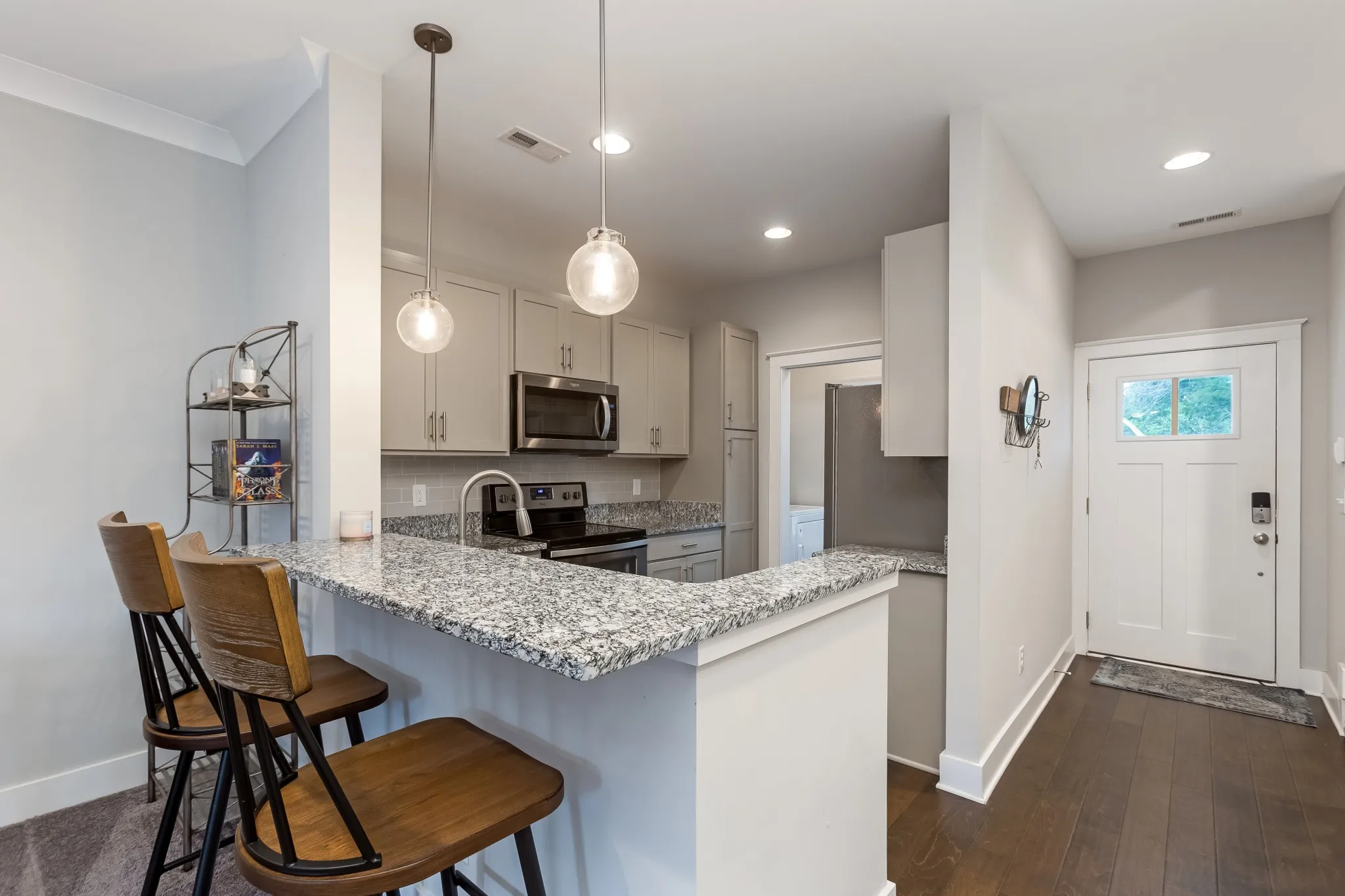 Set within an intimate development, this beautiful modern townhome offers sophisticated living with thoughtful design. The open concept layout showcases premium engineered wood flooring, complemented by plush carpet and elegant tile bathrooms. This home features a spacious kitchen adorned with artisanal craftsman cabinets, designer tile backsplash, and sleek granite countertops. Premium stainless steel appliances complete this culinary haven. Upstairs, two generous bedrooms serve as private retreats, each with its own en-suite bathroom. Outdoor living spaces include a welcoming covered front porch and a secluded rear patio with convenient storage. Experience the refined comfort this townhome has to offer.