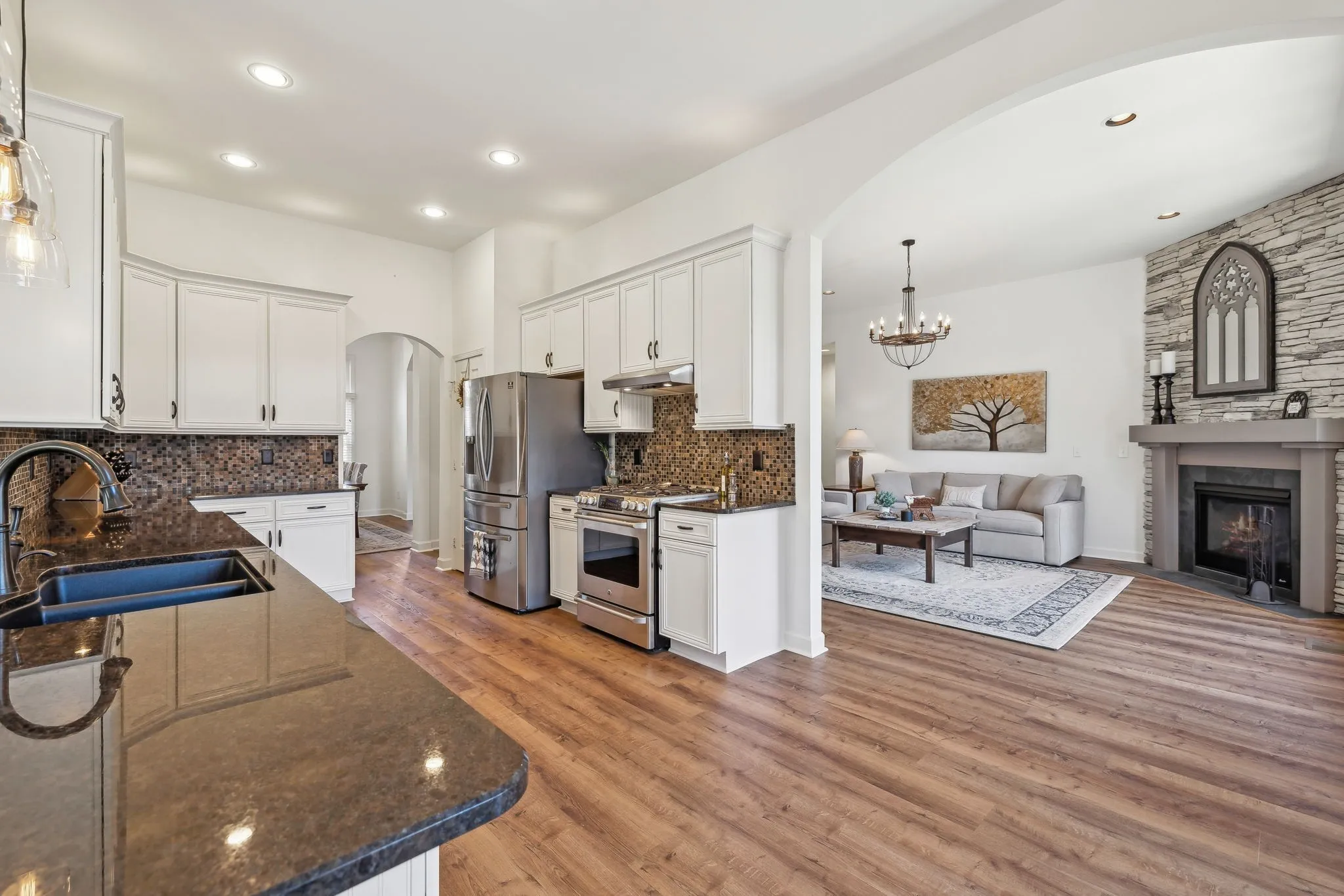 Stunning lifestyle driven home in the highly desirable Meadows of Seven Points ~ Step inside to discover thoughtfully designed details, volume ceilings, abundant light & versatile gathering rooms w/ a seamless blend of indoor/outdoor living space ~ MAIN LEVEL living w/ 3 bedrooms down ~ NEW beautiful Luxury Vinyl Plank Flooring & all NEW Lighting ~ Exposed Beams in the showstopper Gathering Room ~ Heart of the home is the redesigned Chef’s kitchen boasting NEW (2023) high end SS appliances, 5 burner gas range, granite farm sink, generous Granite counters & custom cabinetry ~ The Primary suite is a serene oasis complete w/ NEW reconfigured spa like ensuite bath featuring an oversized glass enclosed curbless entry shower w/ double shower heads, granite vanity & LED mirrors ~ Upstairs you’ll find a large Bonus/Flex room w/ built ins + a spacious guest/teen bedroom & bath ~ You’ll love the meticulously maintained outdoor oasis: NEW screened deck w/ cathedral ceiling & custom stacked stone wood burning fireplace + additional two tiered deck w/ remote controlled awning & GAS grill station all overlooking your beautifully landscaped back yard ~ Irrigation ~ Tankless Water Heater (2023) ~ Two fireplaces ~ Expansive Floored Attic Storage ~ Rare THREE CAR side entry garage w/ ample storage/workspace ~ Large laundry/utility on main w/ built in cabs & sink ~ Don’t miss this remarkable inviting home offering an extremely convenient location, gorgeous updates & comfortable outdoor living!