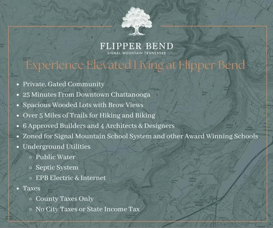 Flipper Bend is a new gated community tucked into an untouched portion of Signal Mountain, TN. Enter through the Gate House and find yourself immersed in a local community unlike anything else in Chattanooga. Each property is thoughtfully designed to harmonize with nature. Storybook views of the Tennessee valley, historic Cumberland plateau and surrounding areas abound. The community is perched high above the crowd below, allowing you to breathe, relax, and become one with the wonder surrounding you. Carefully planned hiking and biking paths meander for miles while an elevated community center with gorgeous brow views will entertain and relax you year around.