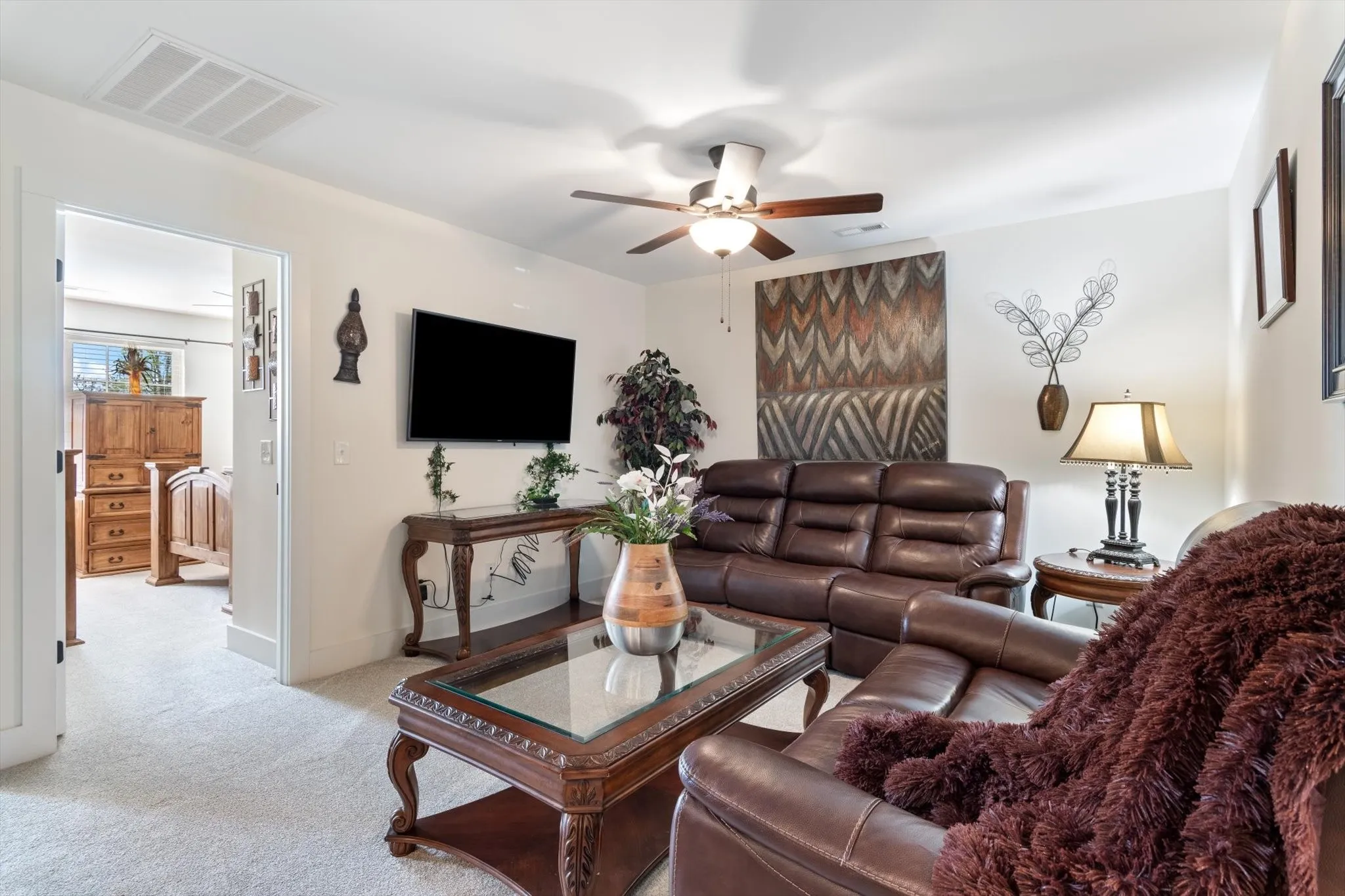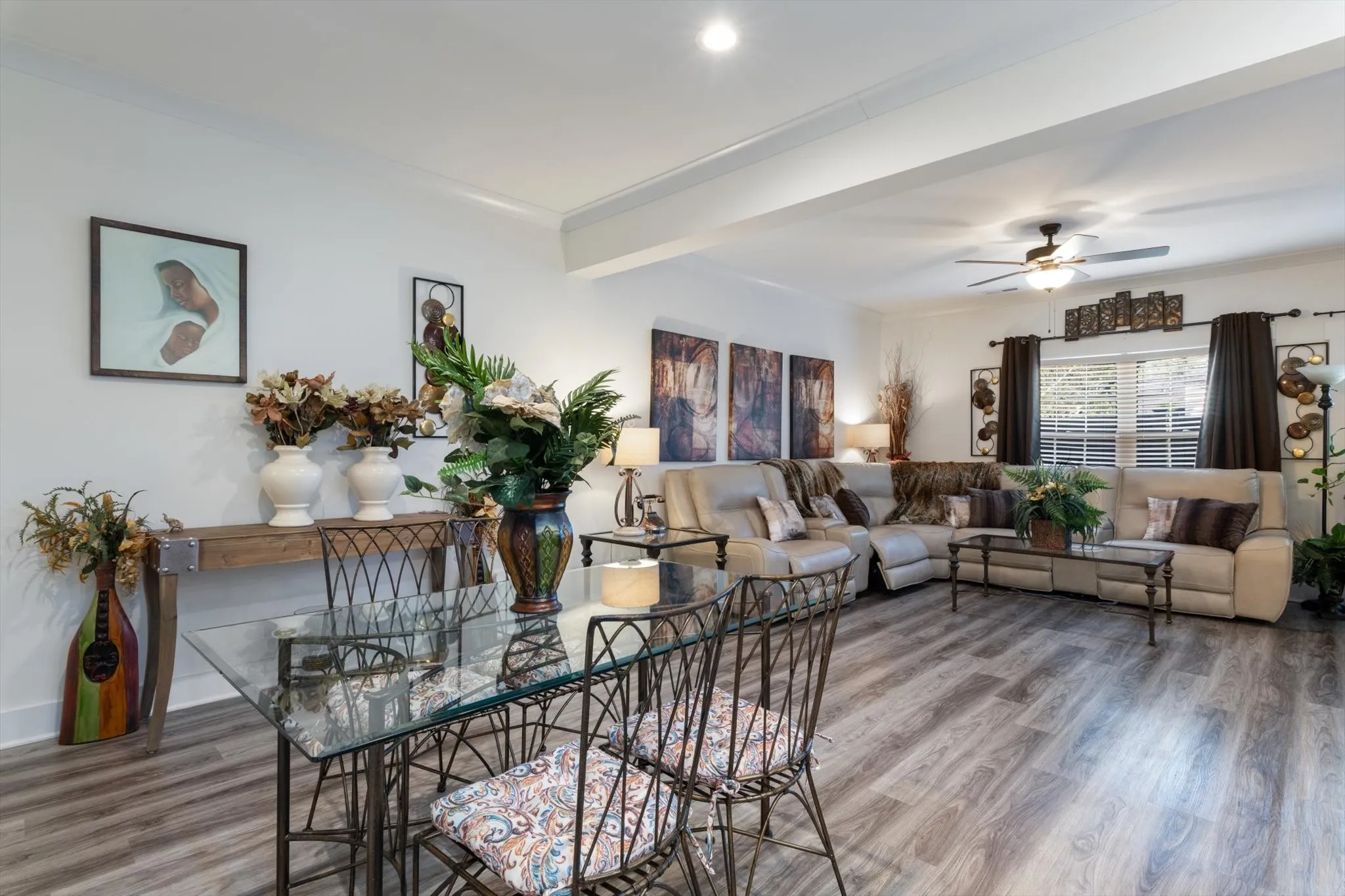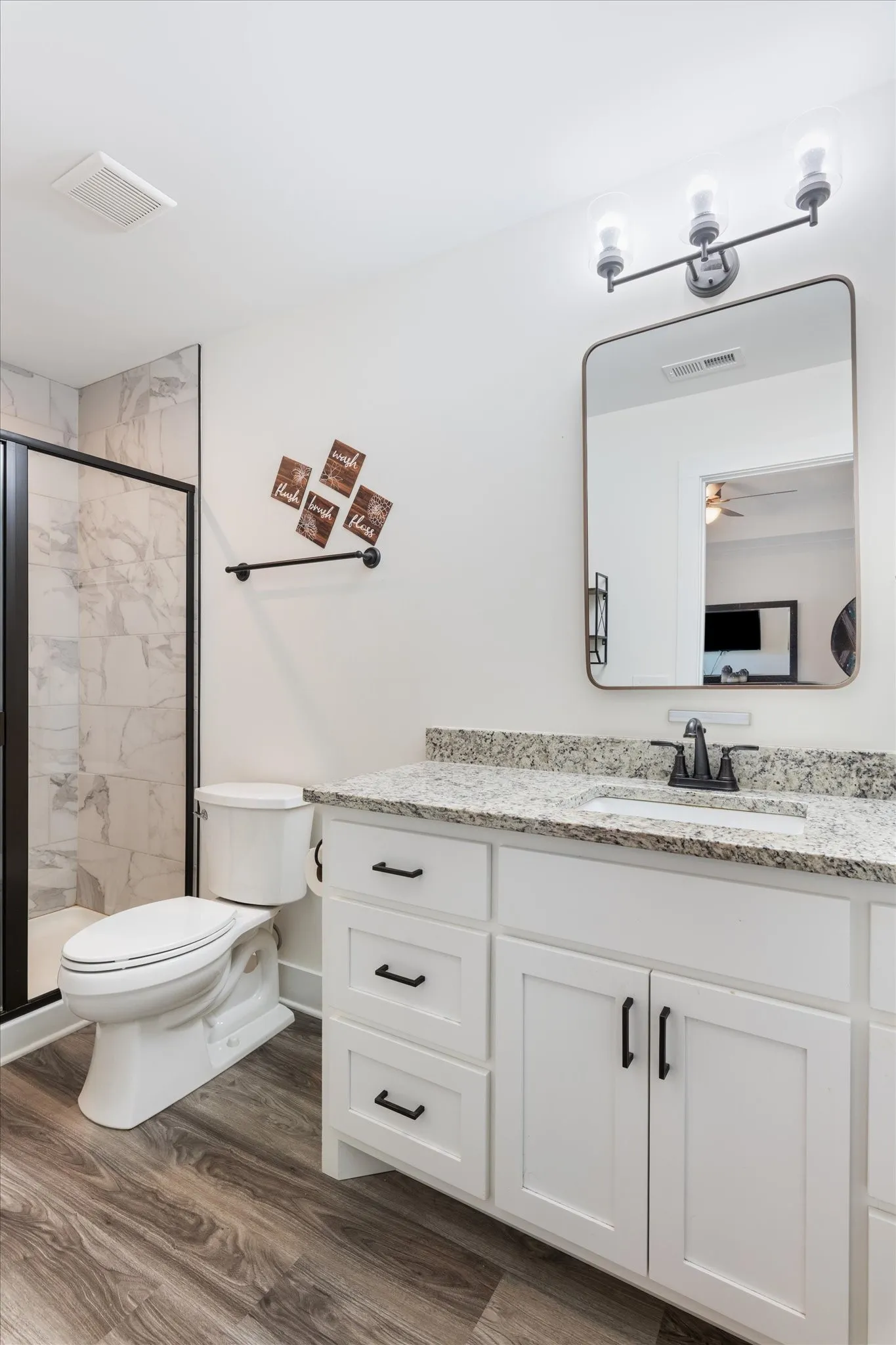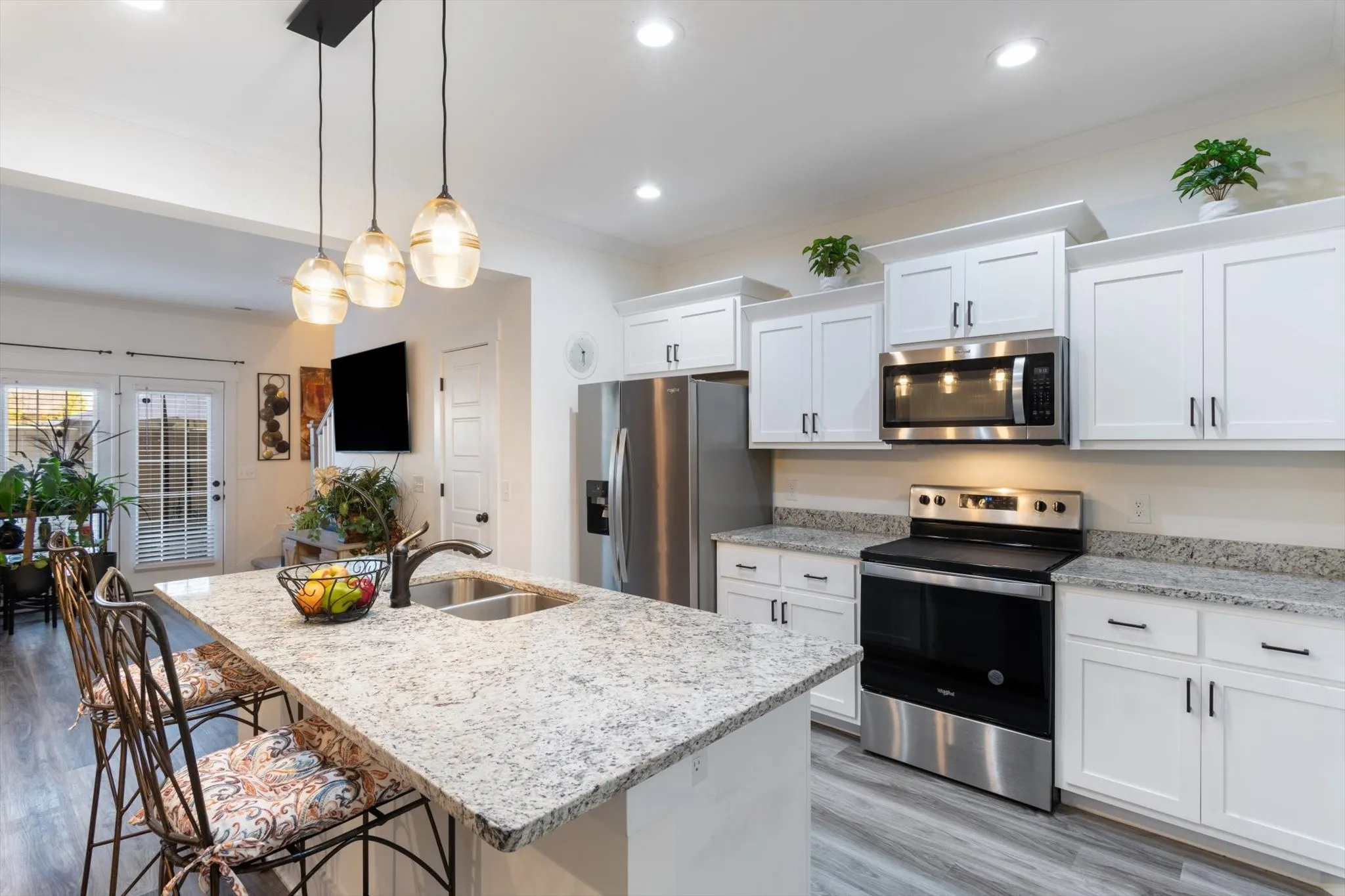 Welcome to this luxcharming Grayson Plan home, offering a thoughtfully designed open-concept layout. The kitchen seamlessly overlooks the eat-in area and living room, perfect for entertaining. Features include custom cabinets with slow-close doors and drawers, granite countertops, and a spacious pantry. Luxury vinyl plank flooring flows throughout the wet areas, providing both style and durability. The generous master suite boasts a large walk-in closet and a beautifully tiled shower in the ensuite bath. You’ll appreciate the bonus room, offering endless possibilities for a home office, media room, or playroom. A separate utility room adds convenience and organization. This home features 9-foot ceilings and vaulted ceilings on the main level, creating an airy and open feel. Smooth ceilings add a touch of elegance. This smart home is pre-wired for modern convenience, including a Ring-style doorbell for added security. Located in a well-maintained community, Don’t miss out on the opportunity to make this home yours!