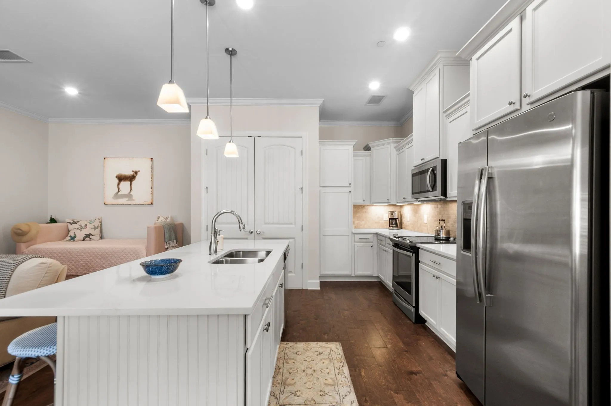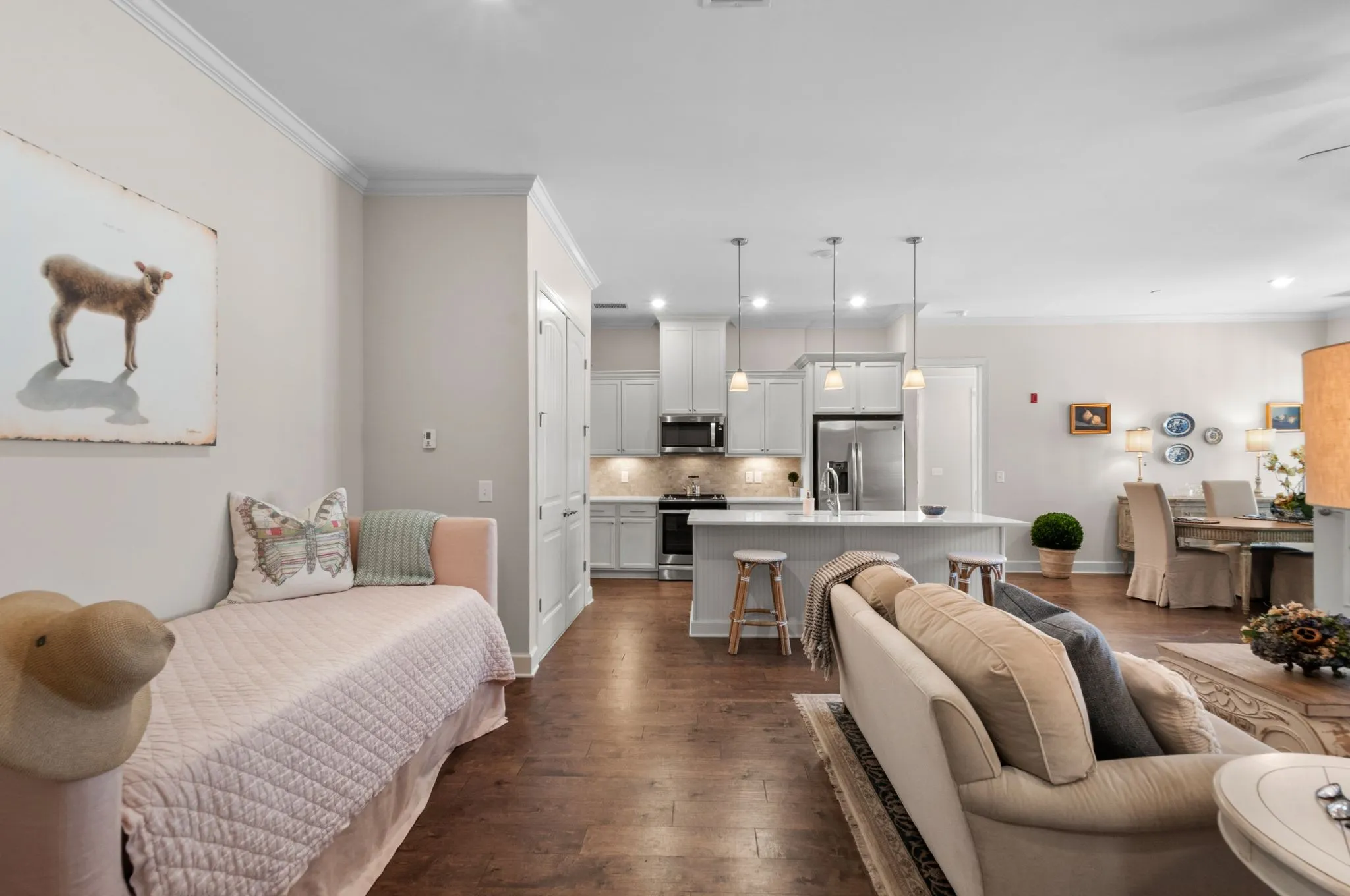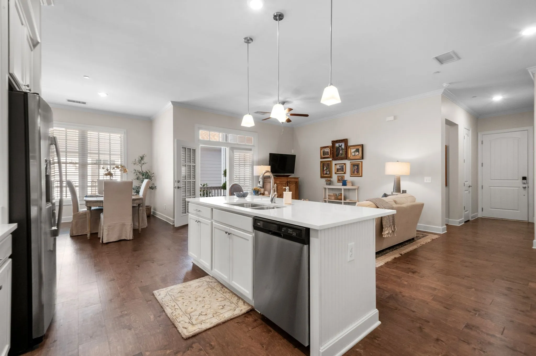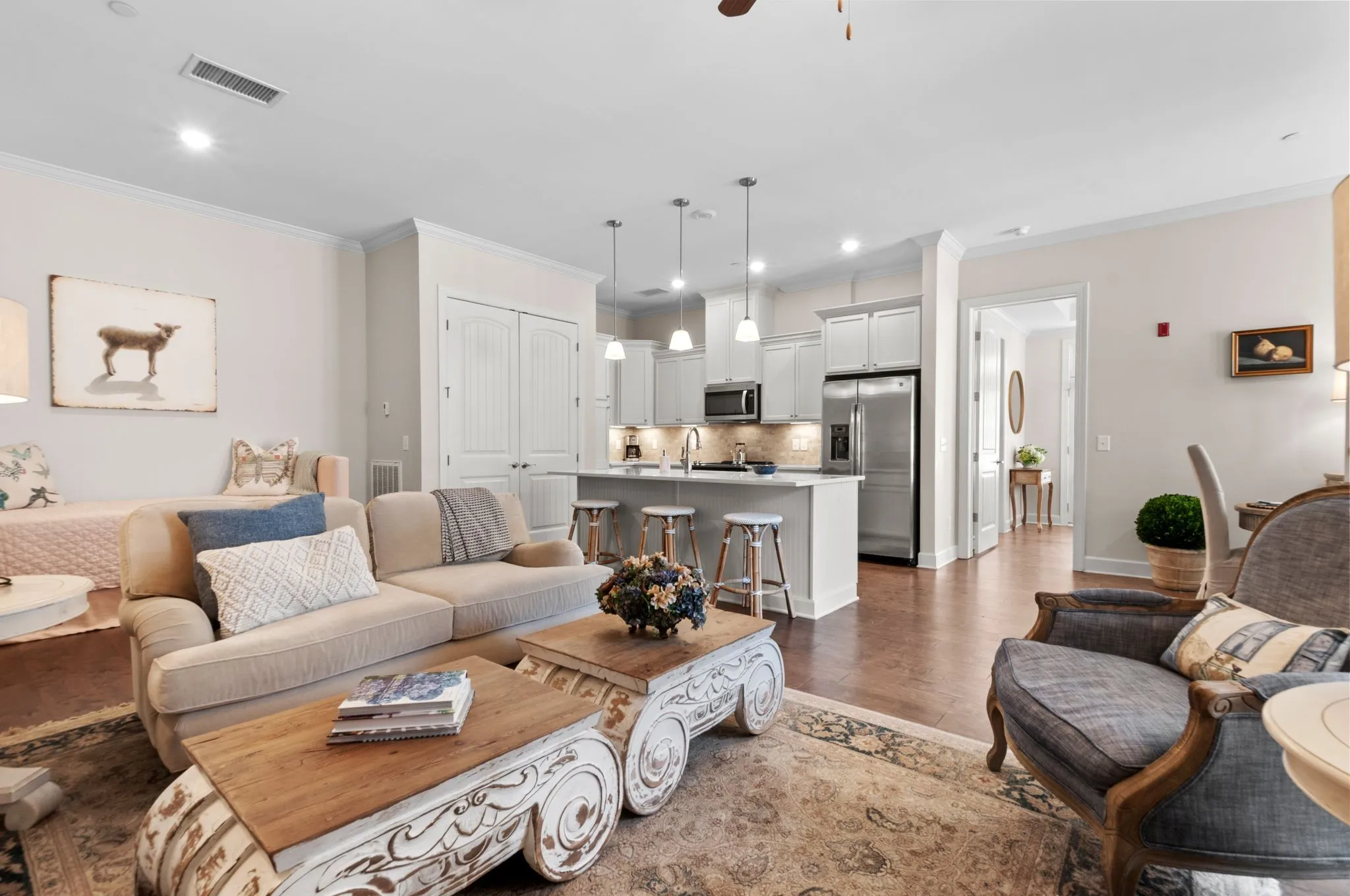 Welcome home to the Kristan Town Center, a serene retreat nestled in the heart of Berry Farms where elegance meets convenience in this stunning condo! This spacious floor plan features one story living with a lovely first floor primary suite with covered patio attached and an additional bedroom (perfect for guests or a home office) and two full baths. This condo also has fresh paint and new quartz countertops in the kitchen and both bathrooms ($15,000 in renovations). Revel in the beauty of extensive hardwood flooring and a gourmet kitchen that inspires culinary creativity, while enjoying the two covered porches perfect for outdoor relaxation. The one car rear entry garage offers effortless convenience with no stairs to navigate. Berry Farms is a community that embraces walkability at its finest. Just steps from grocery stores, top-rated restaurants, boutique shopping, fitness centers and lush green spaces, you’ll find everything you need close at hand. This vibrant neighborhood beautifully blends modern comfort with small-town charm, all while providing easy access to Nashville and major roadways. Don’t miss your chance to experience the coveted lifestyle of Berry Farms. Schedule your tour today and discover the perfect blend of luxury, community and convenience! (Chandelier in primary bedroom does not convey)