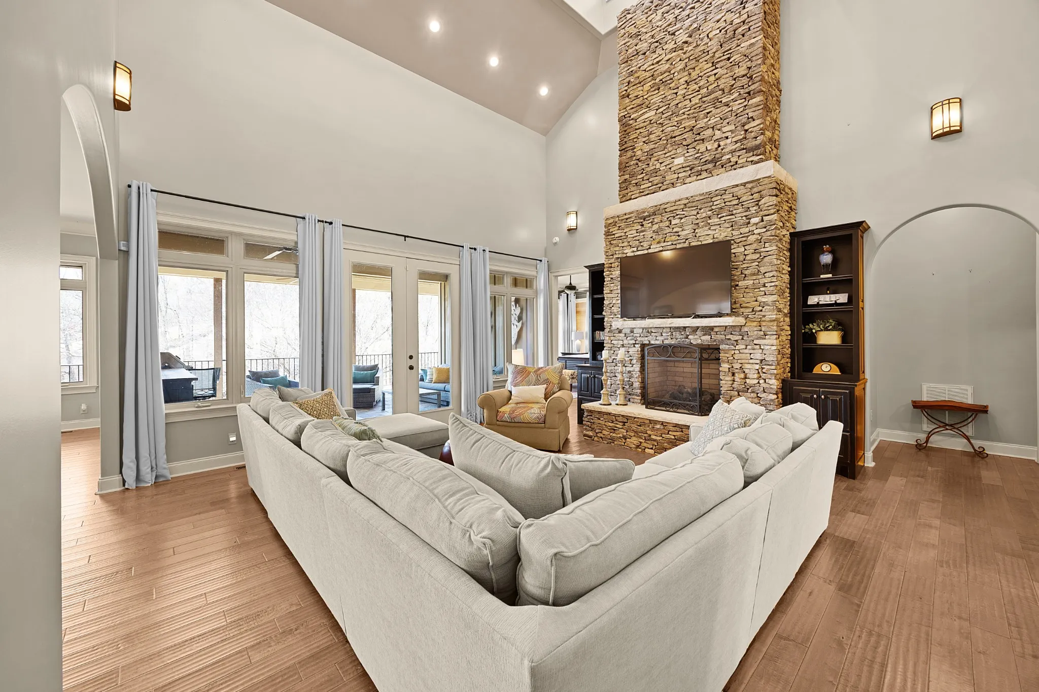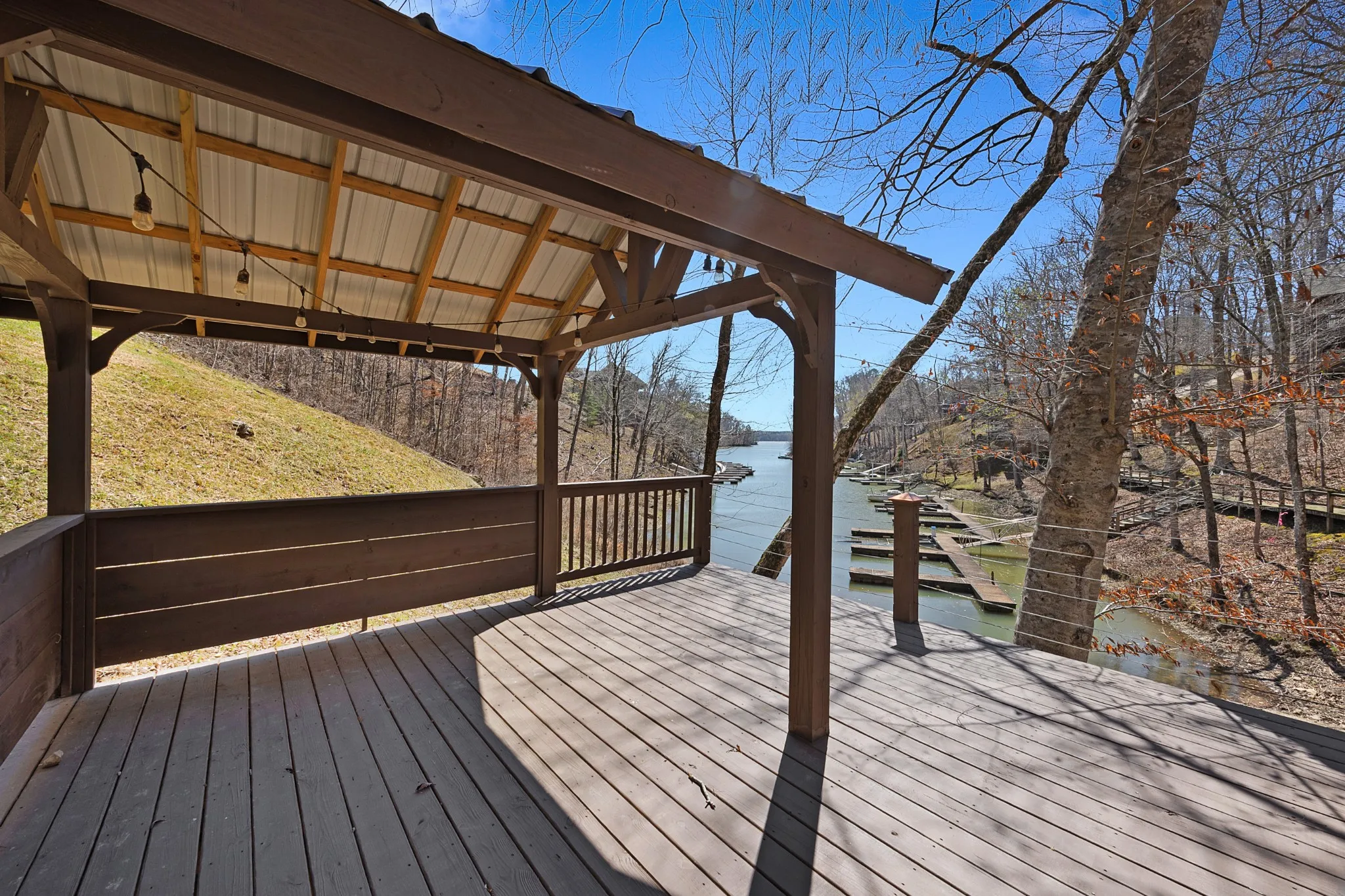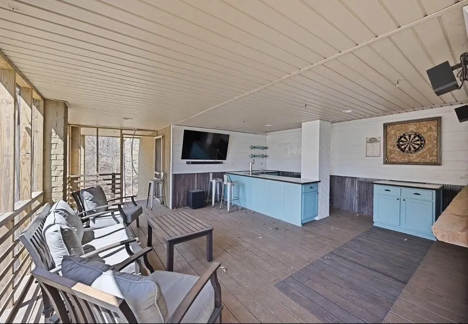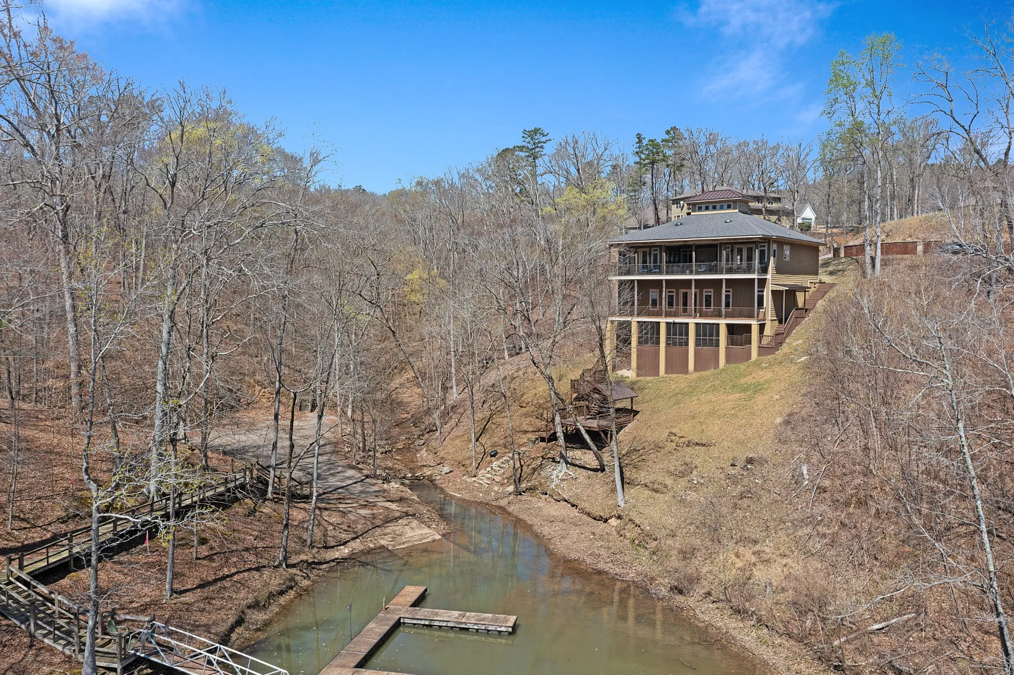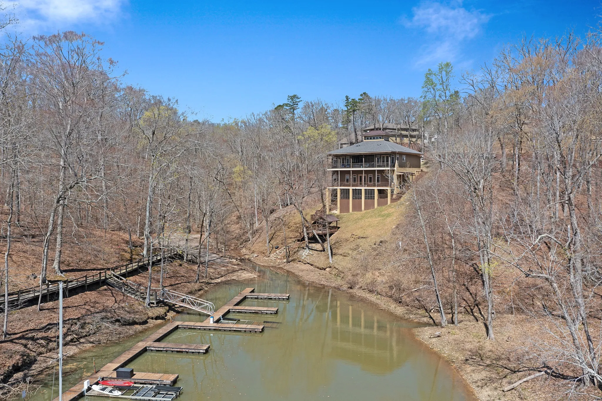 STUNNING waterfront views PLUS Boat Slip at Ridgepointe Marina. 5 BEDROOMS/5 FULL BATHS OPEN & AIRY with lovely lake views. Great room opens onto the beautifully appointed Kitchen overlooking the full length Deck & Covered Patio. 2 Primary Bedrooms with en suite baths. Actually, all bedrooms have their own private bathroom with the exception of the Bunk Room. 3 levels of Decking. New battery operated Boat Lift. Easy access to NEW Waterfront Covered Deck/Gazebo. Screened Bar & Game Room PLUS indoor PlayRooms on lower level. New Metal Porch ceiling is the perfect place to wait out a summer storm and listen to the rain!